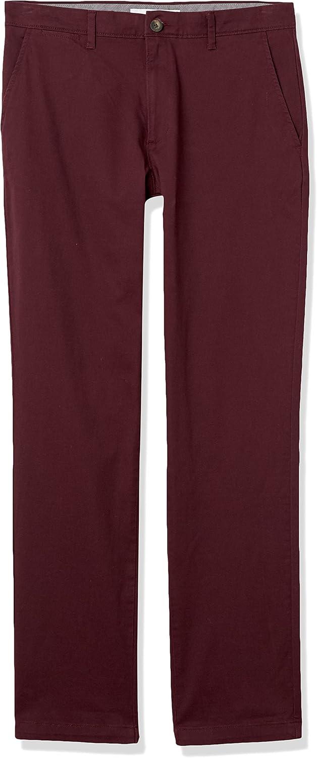The Amazon Essentials Men's Straight-Fit Casual Stretch Chino Pant is crafted with a breathable cotton twill and a bit of stretch for flexibility. The straight-fit design features a slight ease through the hip and thigh with a straight leg, and they sit at the waist. Our chino pants feature a zipper fly and button closure, along with front slant pockets, a fifth-coin pocket, and button-through back welt pockets. These chino pants for men have a leg opening of 8 inches on a US Men's size 32. Whether you're in need of casual men's pants for daily wear or business casual pants, these stretch chino pants for men are a suitable choice.