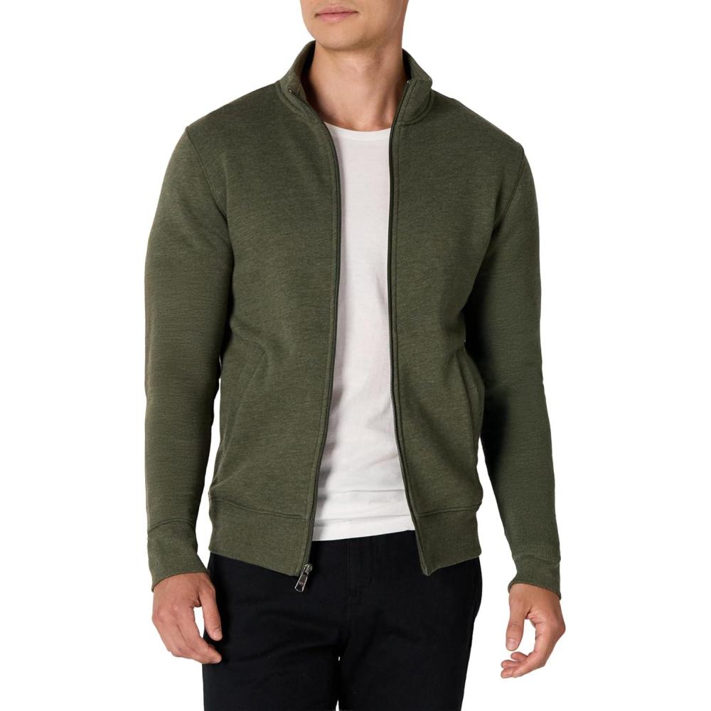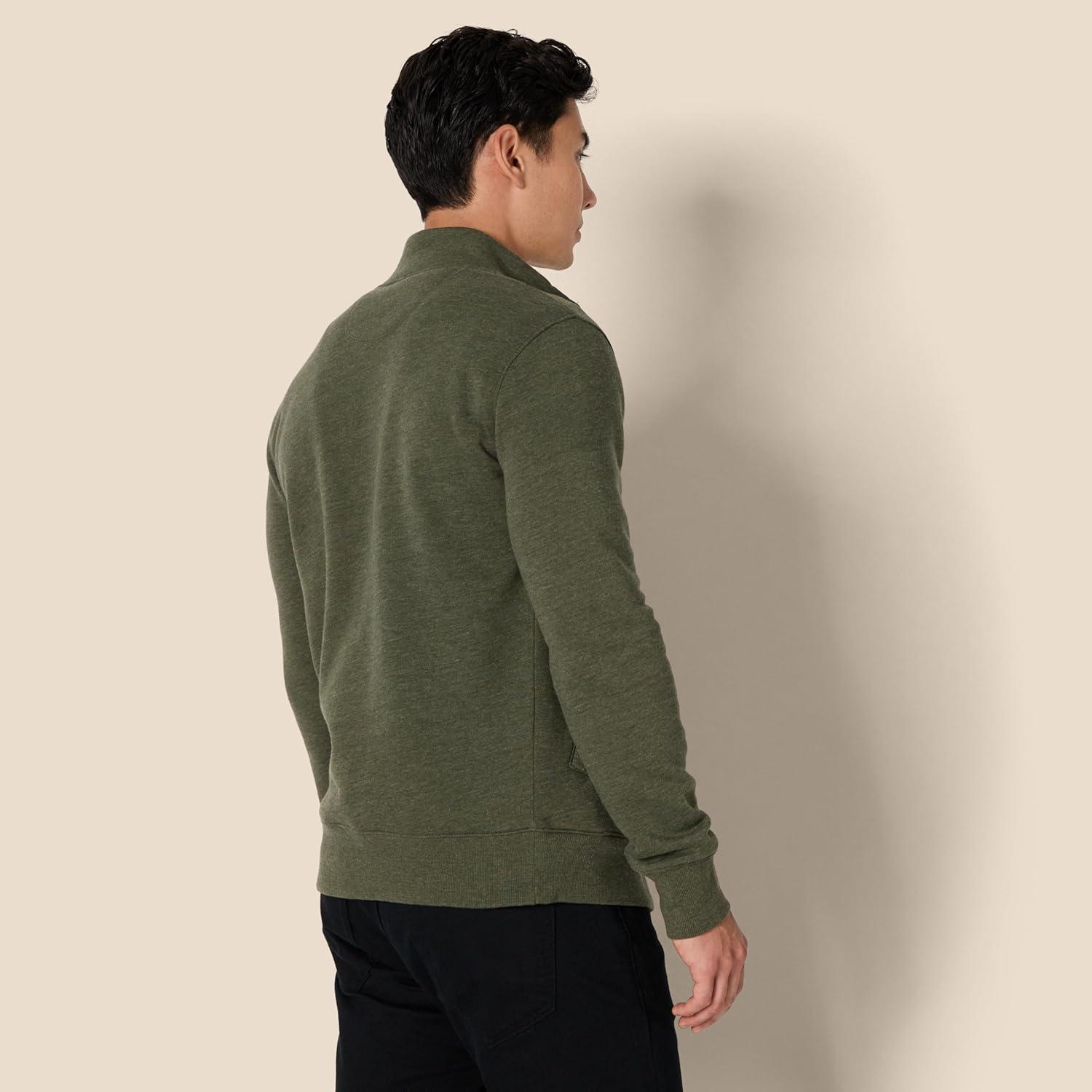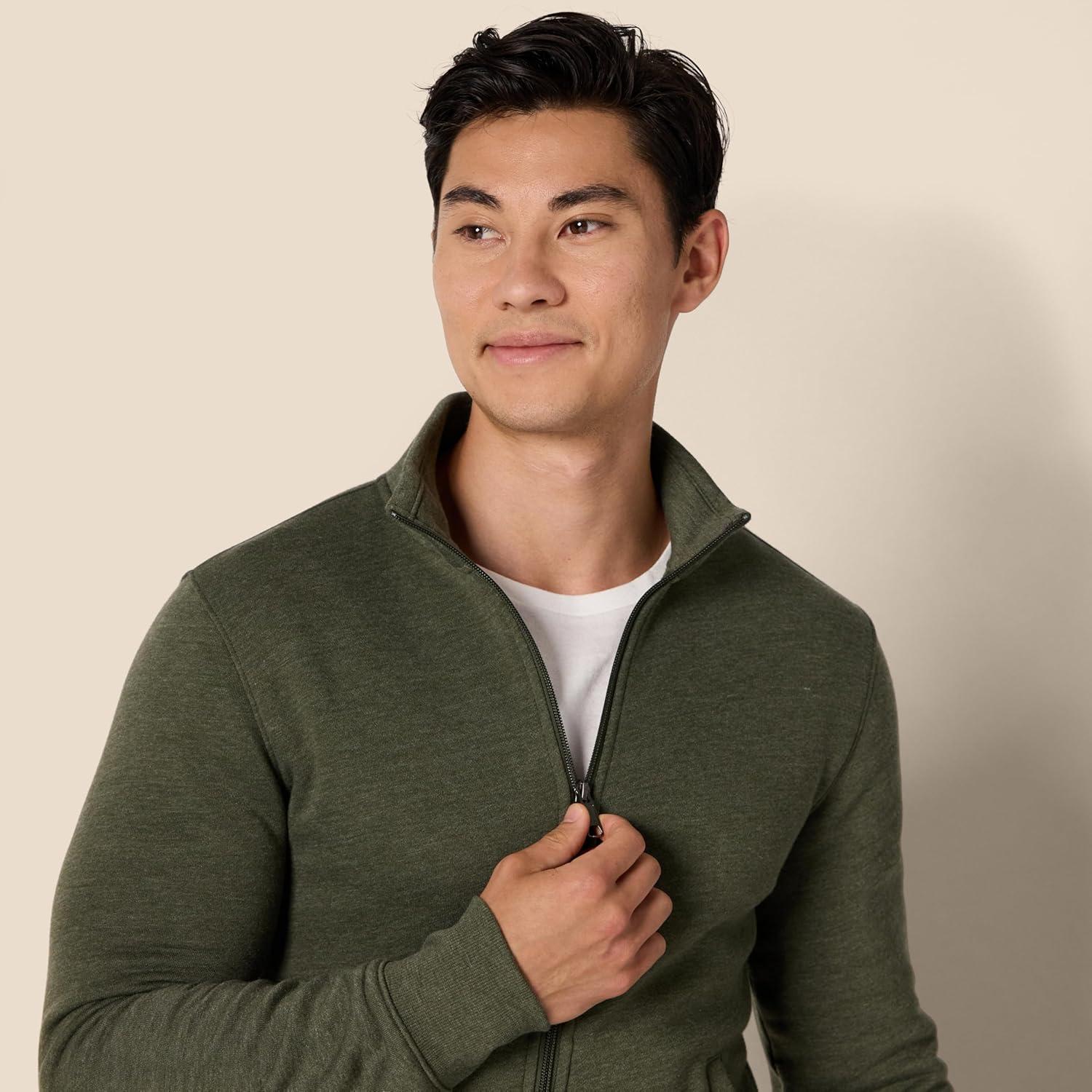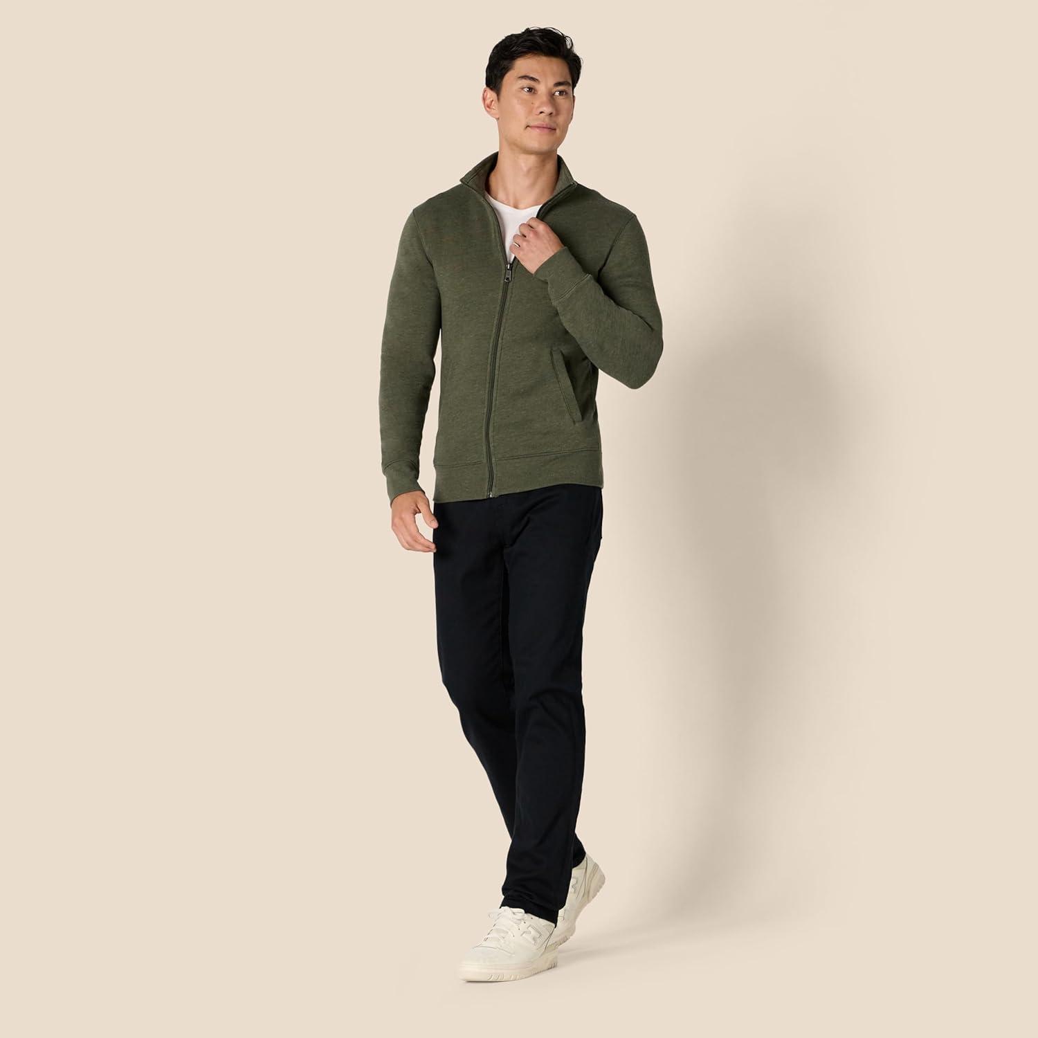 Cut from a soft, brushed-back cotton-polyester blend fleece, this midweight sweatshirt is well-suited for keeping you cozy and warm on cooler days. Tailored for everyday casual styling, this full-zip mock-neck sweatshirt pairs nicely with Amazon Essentials Men's fleece joggers, providing a relaxed yet stylish look that’s ideal for leisurely outings or casual wear. The thoughtful details include a full-length front zipper, a mock neck collar, rib trim at the cuffs, and two front hand pockets for added functionality and convenience. Measuring 28 inches from the side neck on a US size M, it offers ample coverage and a sleek silhouette. We value customer feedback and continually refine our designs to ensure our clothes meet the highest standards of comfort, quality, and longevity, all at prices that are affordable for the whole family