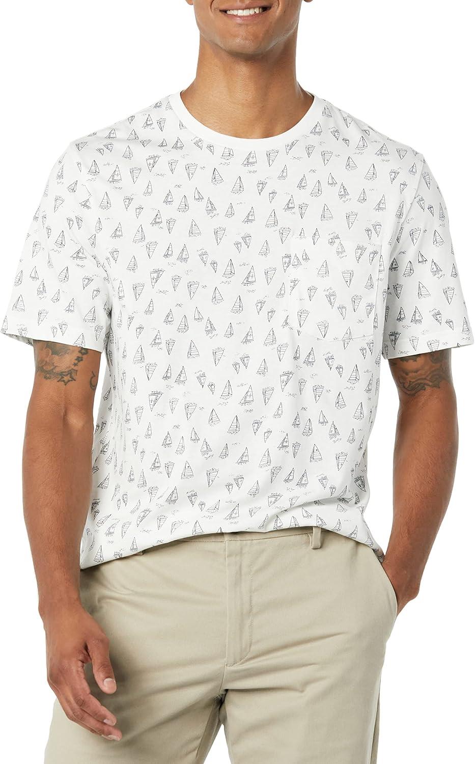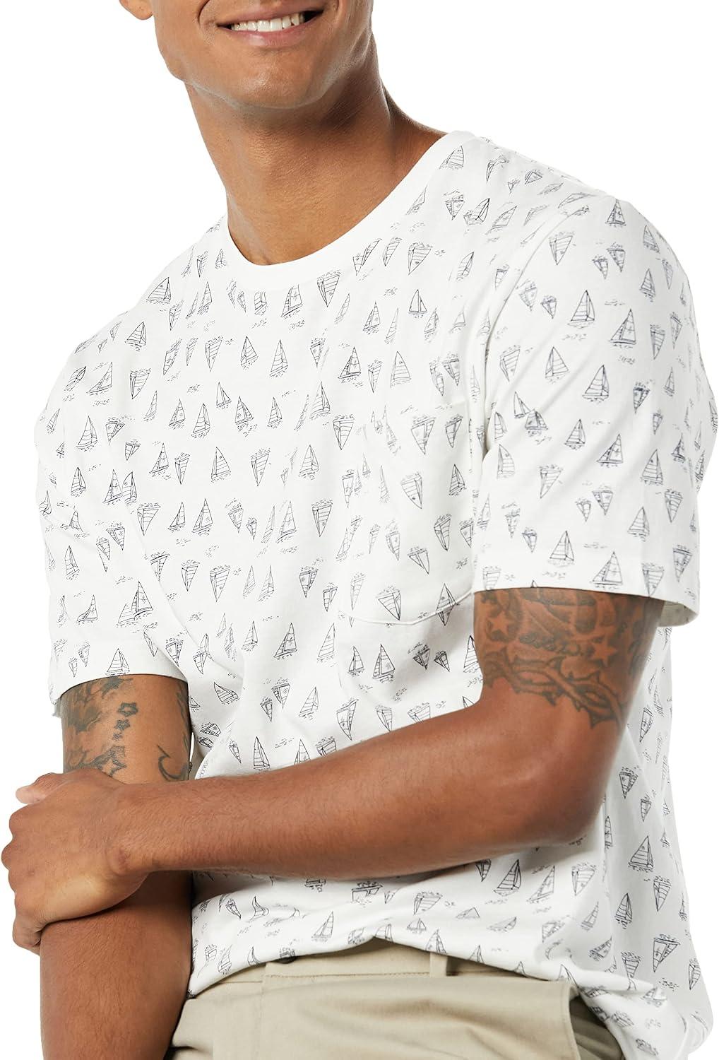 Amazon Essentials Mens T-Shirts, Regular-Fit, Short-Sleeve Crewneck Pocket, Pack of 2(Grey Boat Print/Navy)