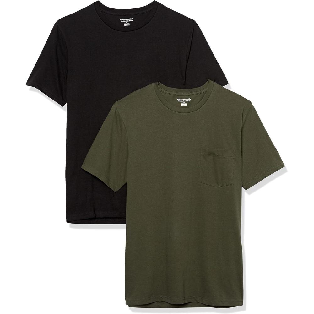 Amazon Essentials Men’s T-Shirts, Short-Sleeve Crewneck Pocket, Cotton, 2-Pack(Black/Dark Olive)