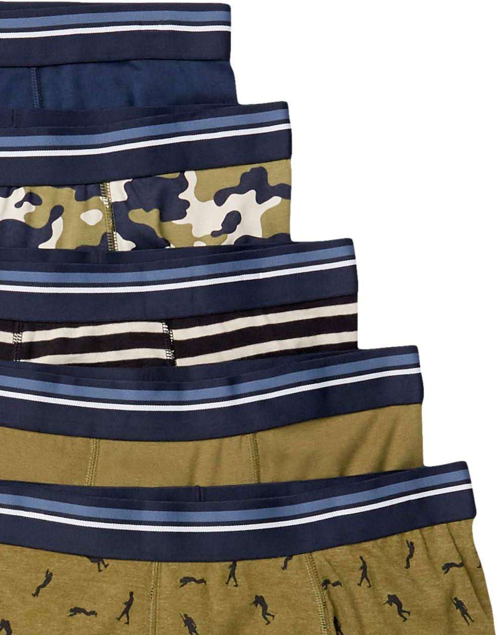 Amazon Essentials Men’s Underwear Boxer Briefs, Comfortable Cotton, Tag-Free, Pack of 5(Black White Stripe/Camo/Dark Blue/Military Green/Warrior)