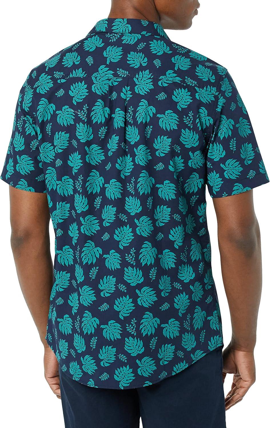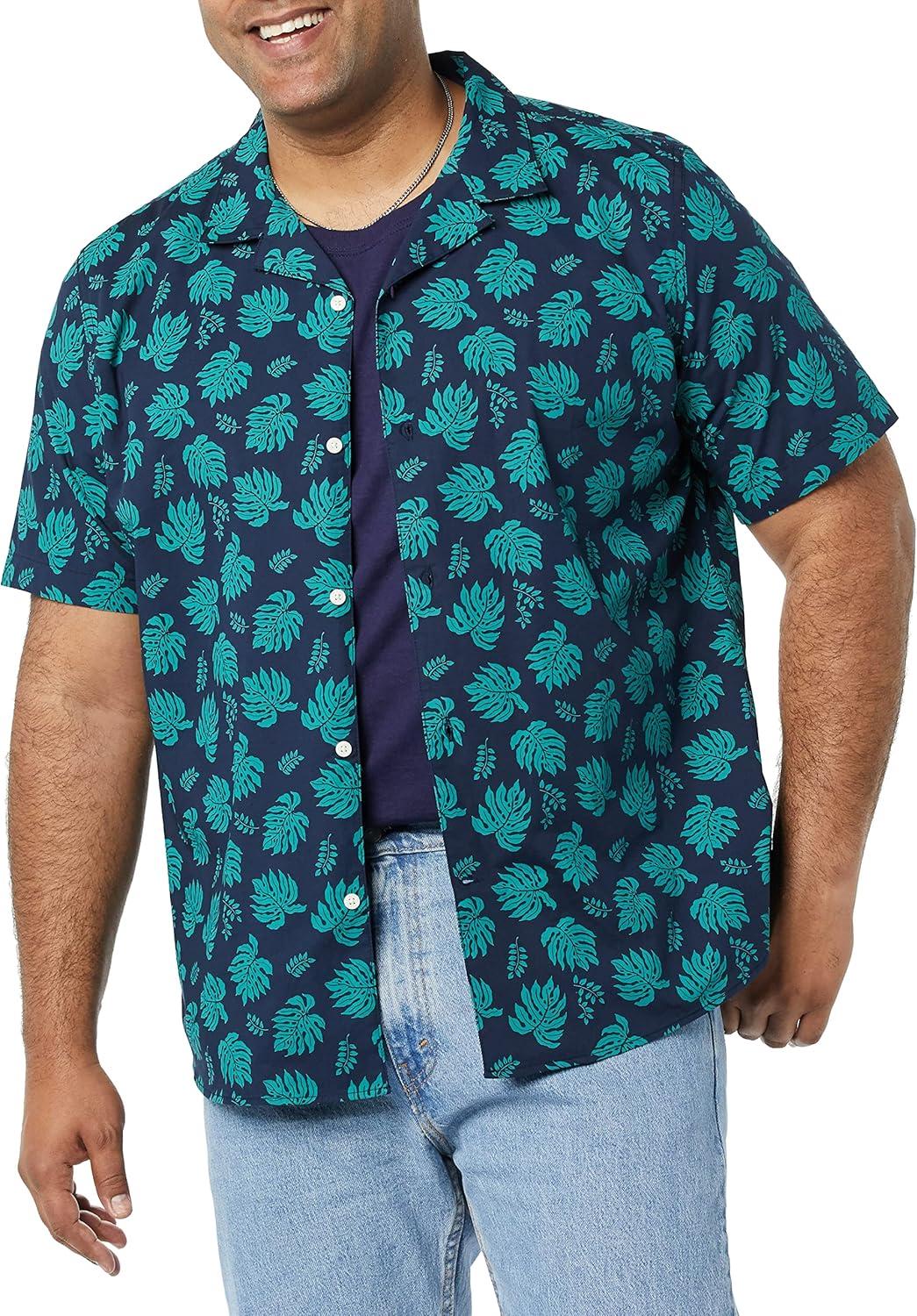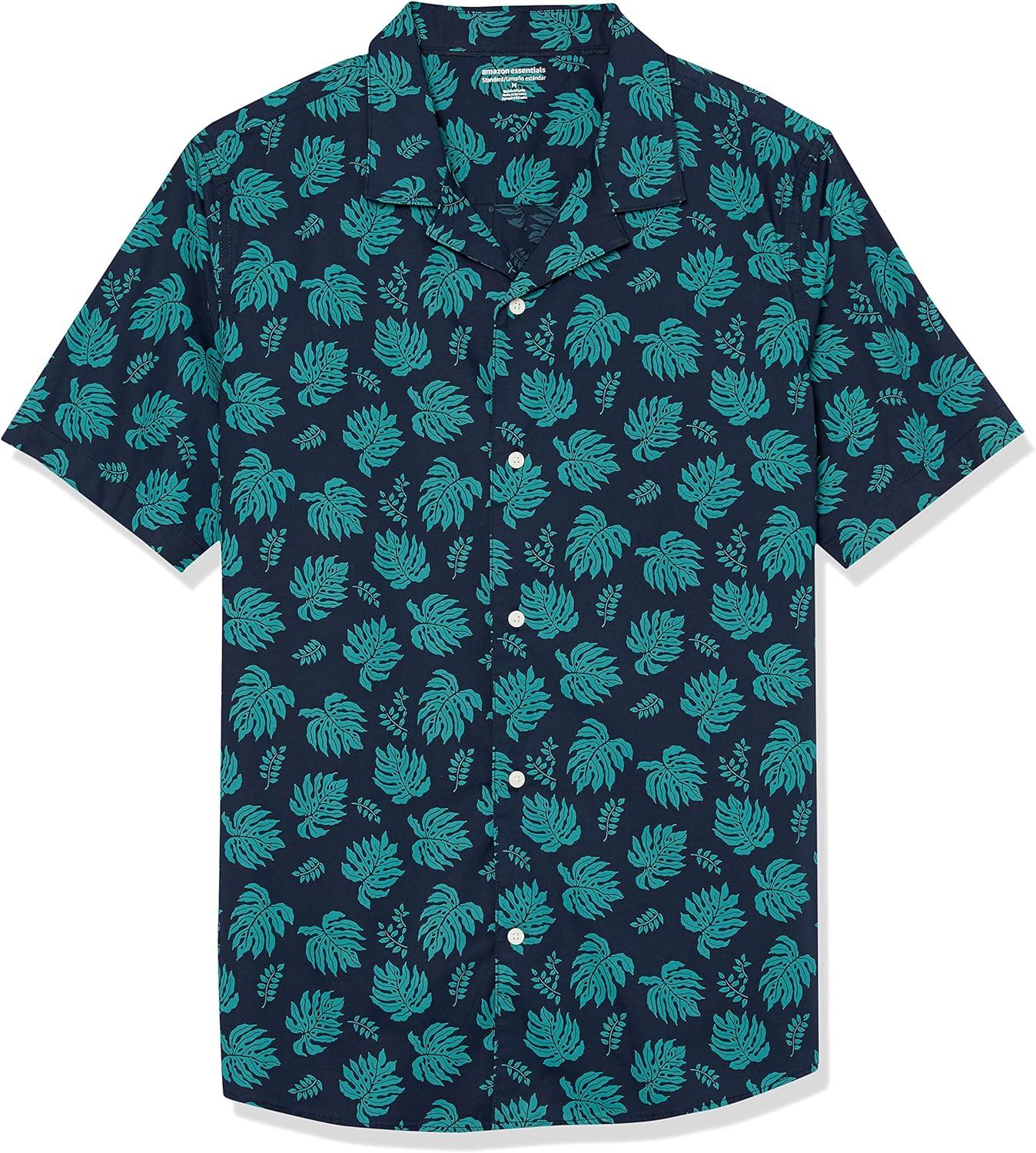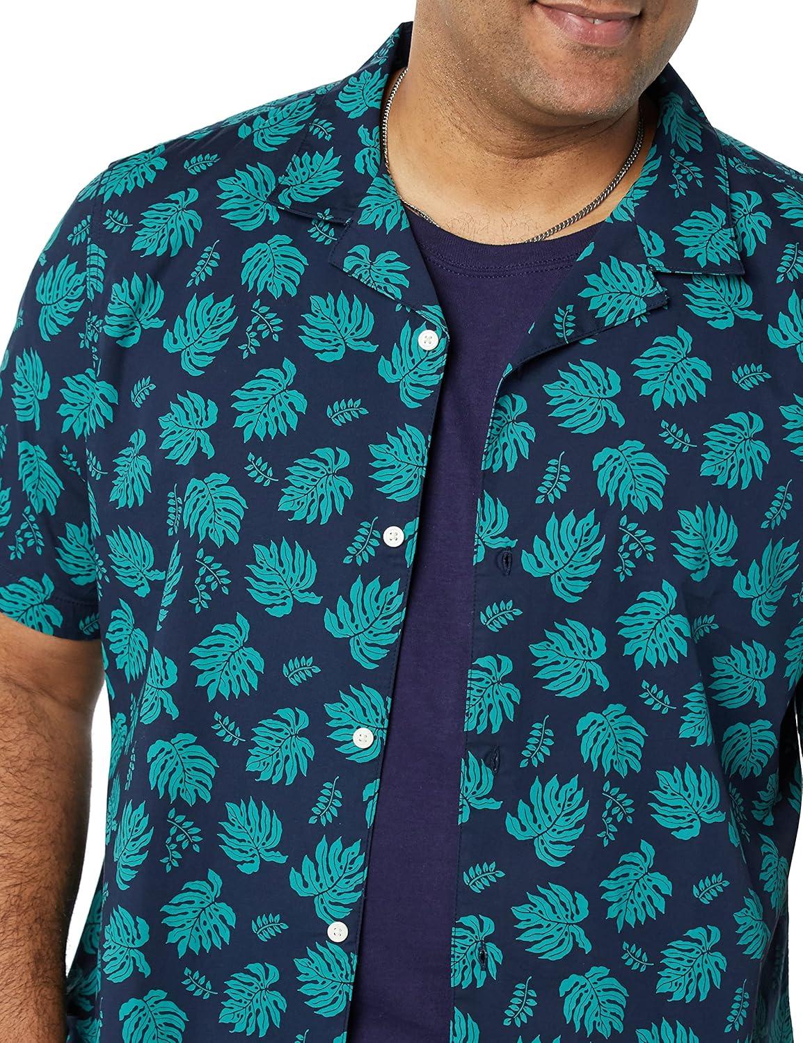 Amazon Essentials Men’s Vacation Cotton Button-Down Resort Shirt, Short Sleeve(Navy Palm Leaf)