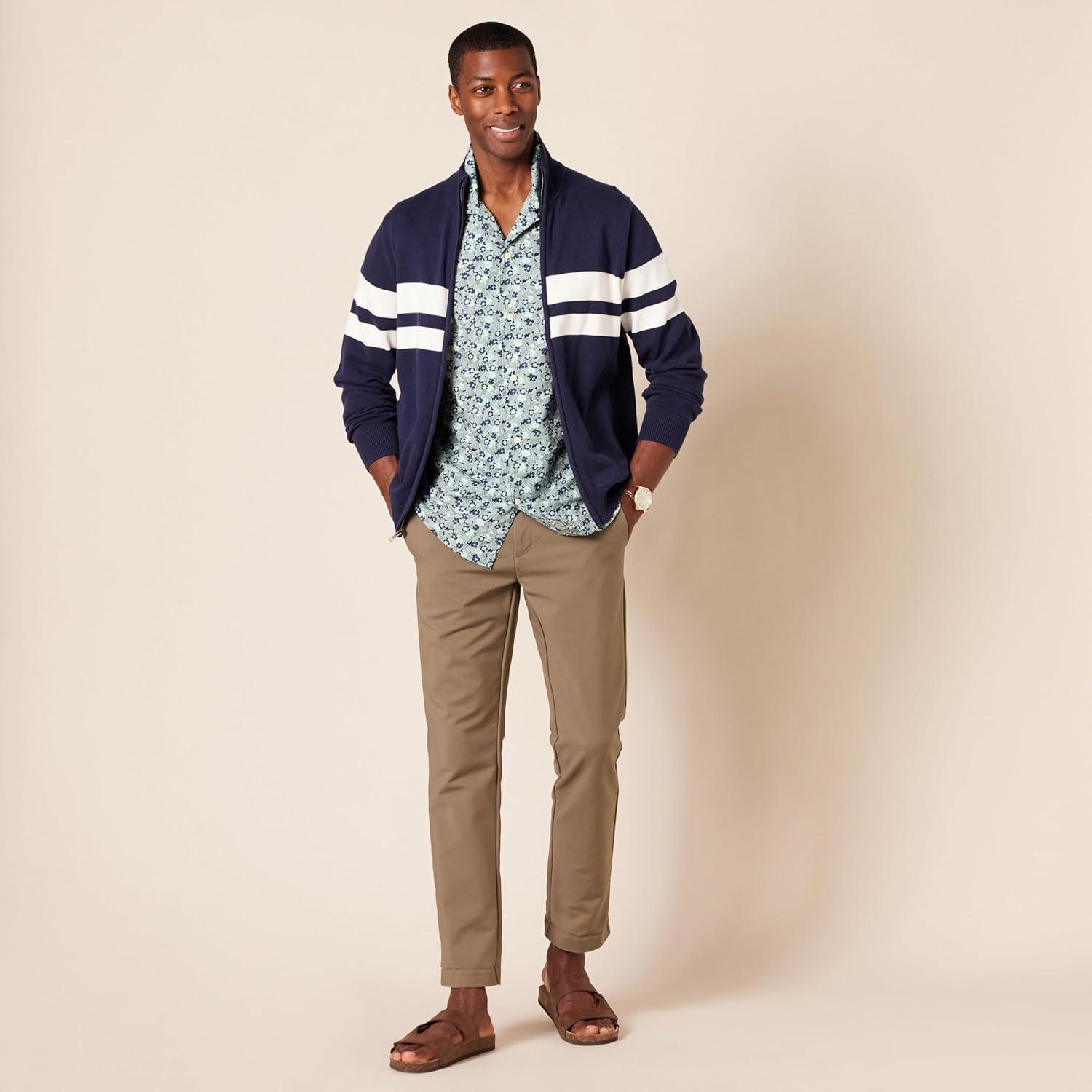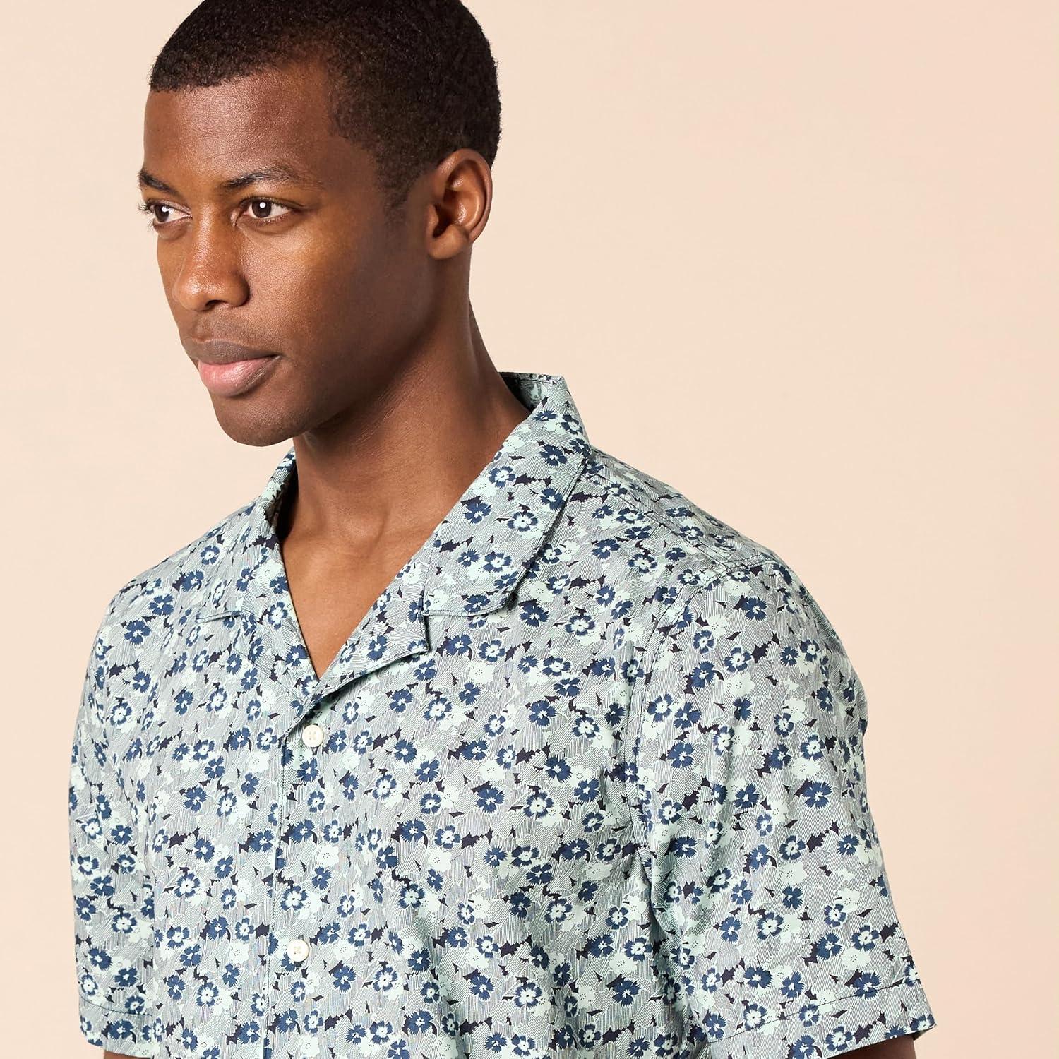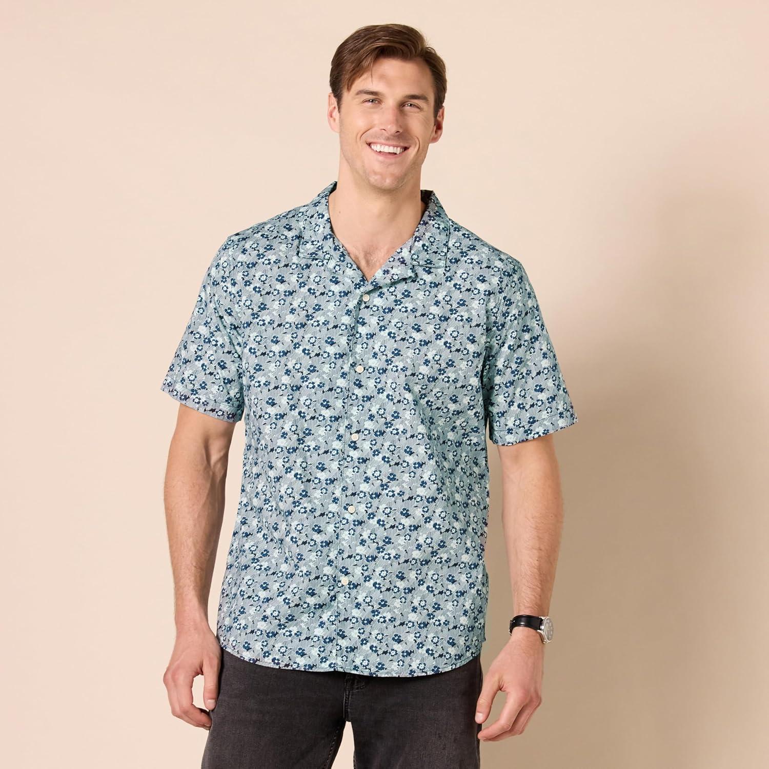 This men's vacation shirt features a slim fit that flatters the shoulders, chest, and waist. Constructed from lightweight yet durable stretch poplin, this men's button-down short-sleeve shirt includes a subtle 2% stretch for mobility and comfort. Our shirt showcases a relaxed camp collar and stylish shirttail hem, complementing shorts or chinos for a laid-back look. Our commitment at Amazon Essentials is to offer high-quality, lasting apparel such as men's casual button-down shirts. With our consistent sizing, selecting the perfect vacation shirt becomes simple.