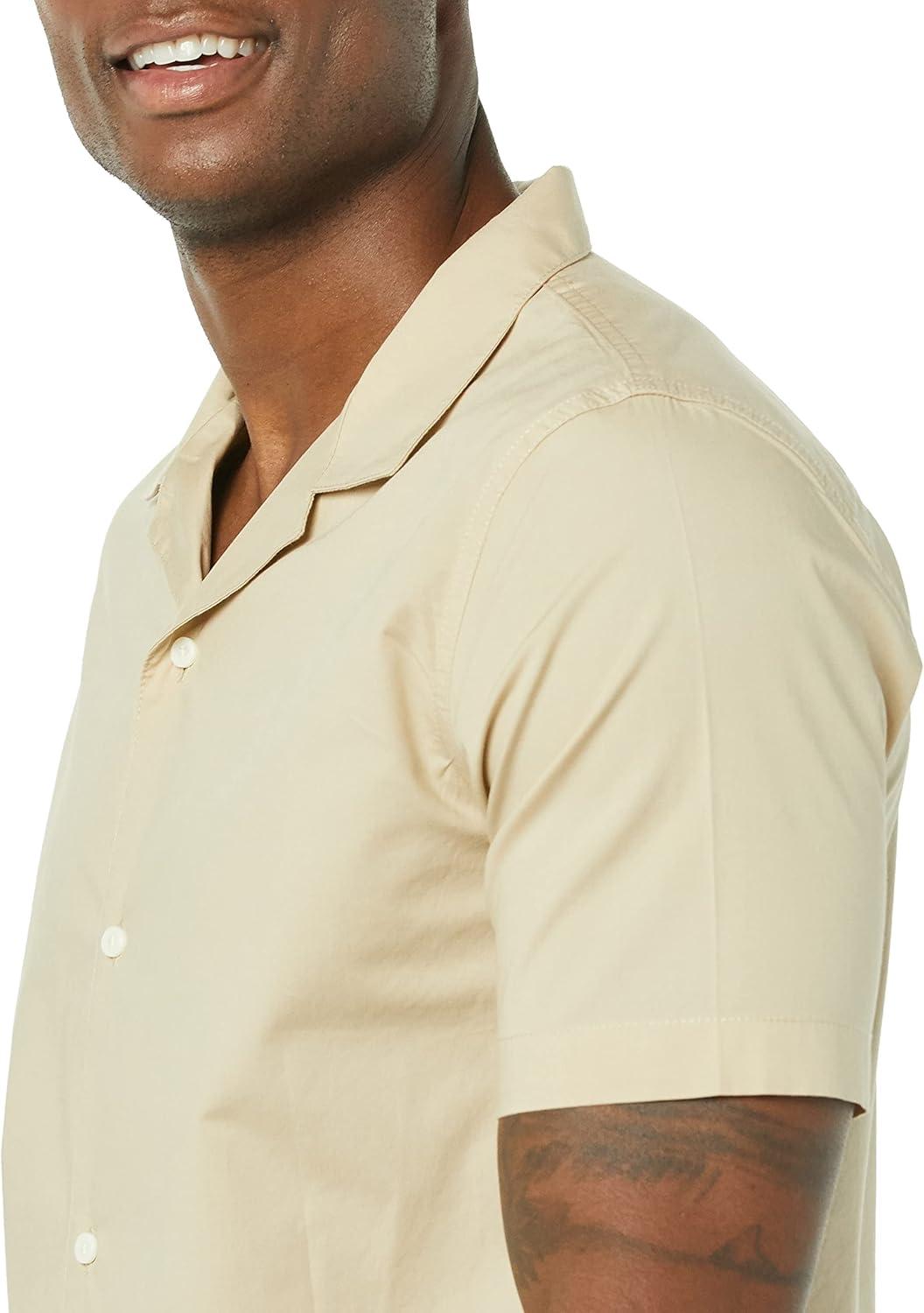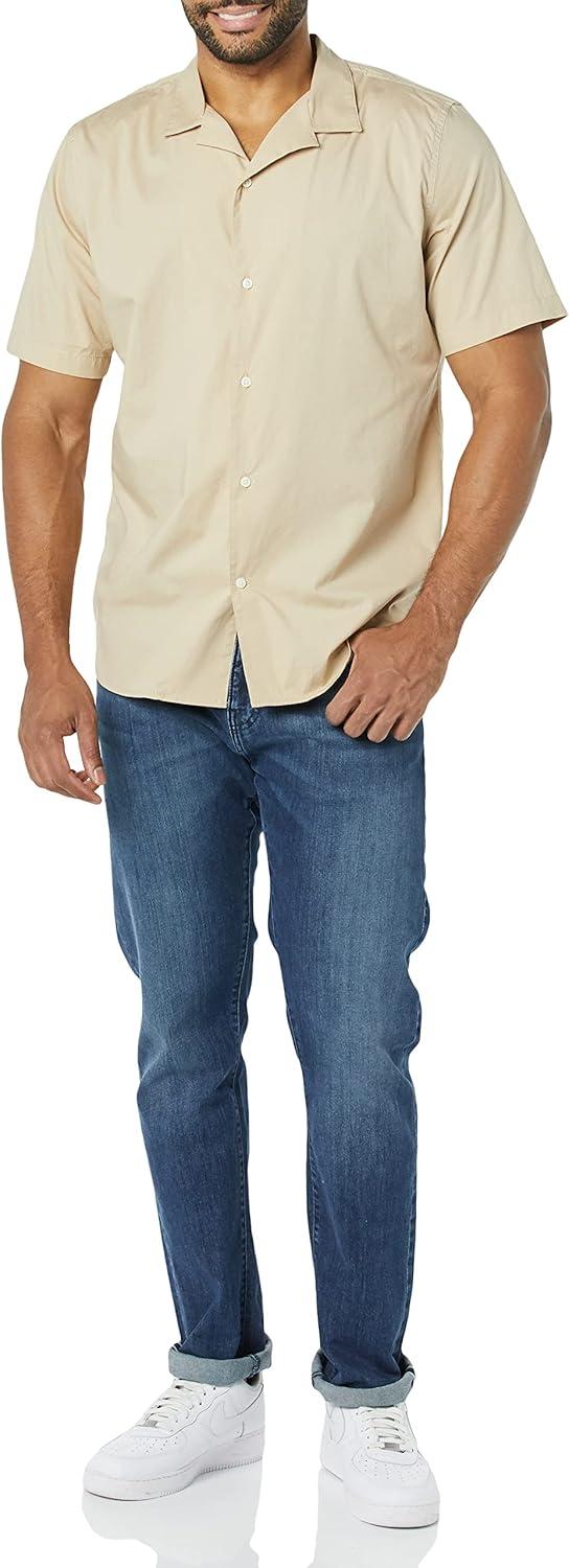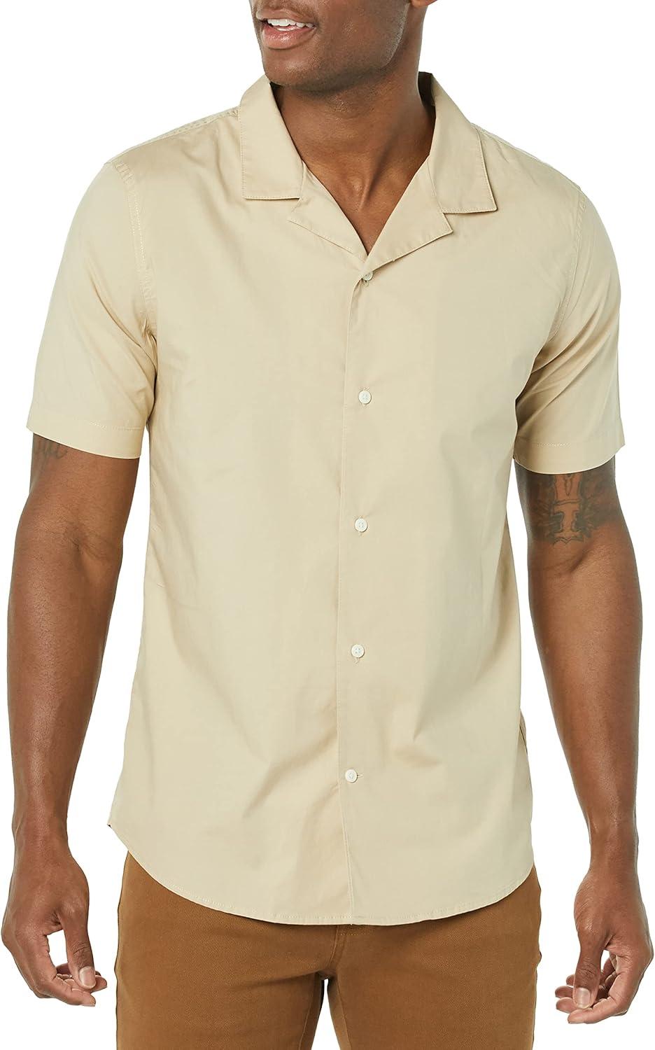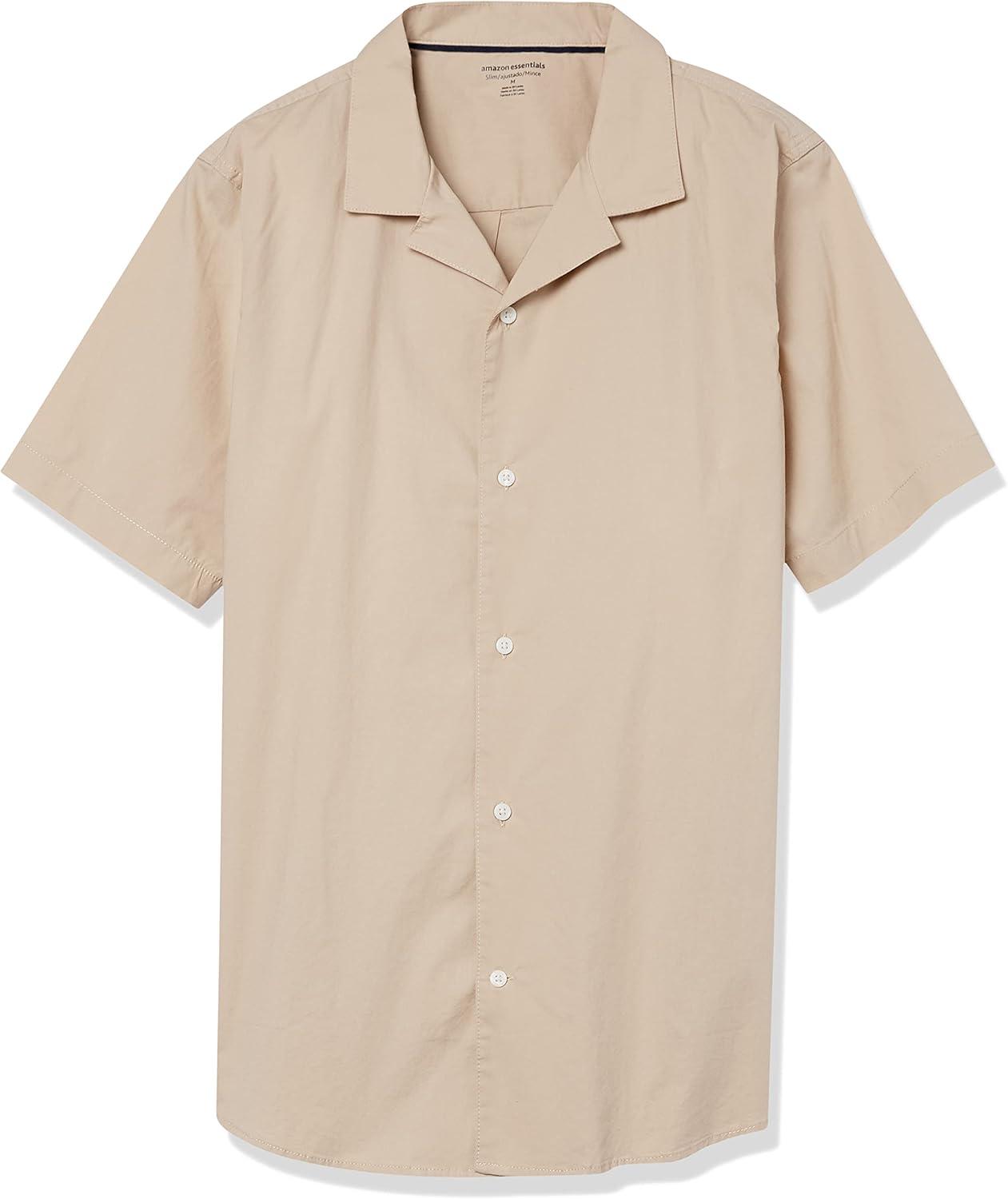 This men's vacation shirt features a slim fit that flatters the shoulders, chest, and waist. Constructed from lightweight yet durable stretch poplin, this men's button-down short-sleeve shirt includes a subtle 2% stretch for mobility and comfort. Our shirt showcases a relaxed camp collar and stylish shirttail hem, complementing shorts or chinos for a laid-back look. Our commitment at Amazon Essentials is to offer high-quality, lasting apparel such as men's casual button-down shirts. With our consistent sizing, selecting the perfect vacation shirt becomes simple.