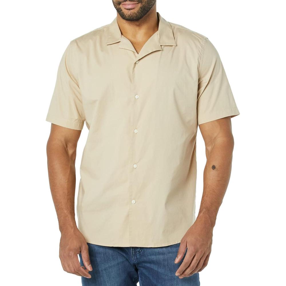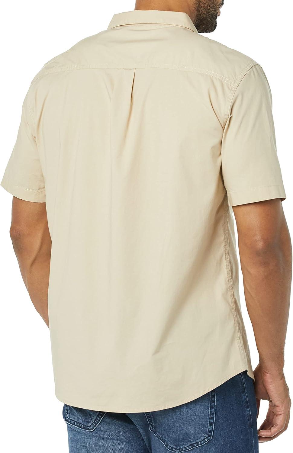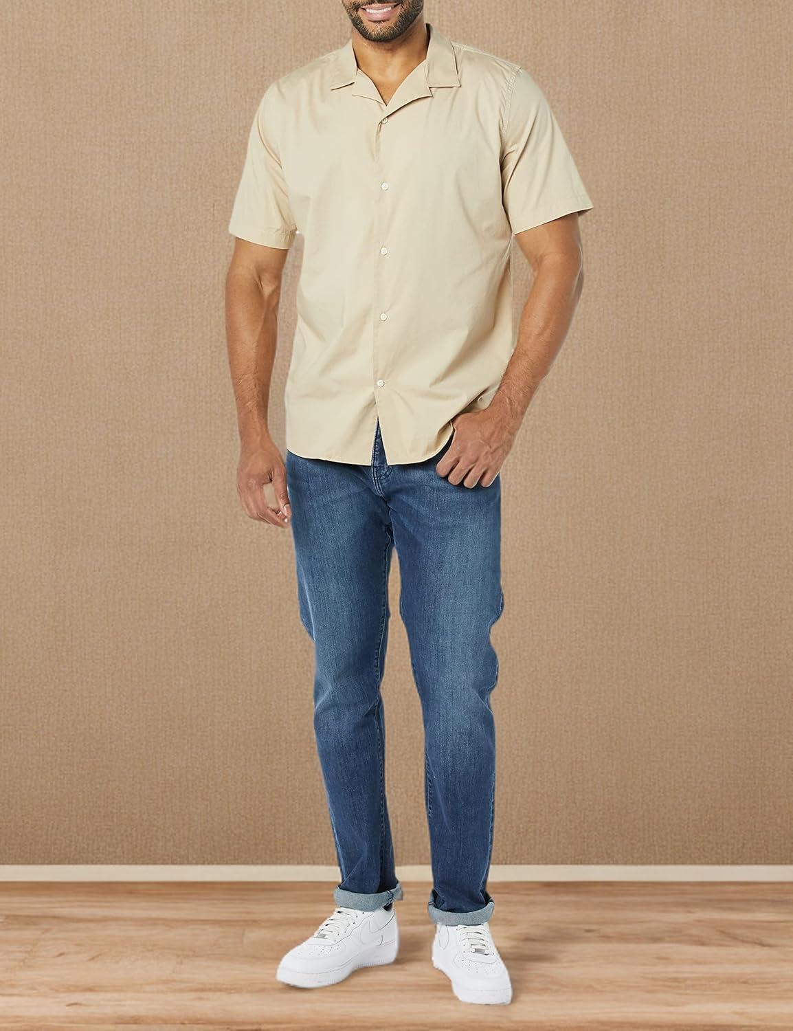 This men's vacation shirt features a slim fit that flatters the shoulders, chest, and waist. Constructed from lightweight yet durable stretch poplin, this men's button-down short-sleeve shirt includes a subtle 2% stretch for mobility and comfort. Our shirt showcases a relaxed camp collar and stylish shirttail hem, complementing shorts or chinos for a laid-back look. Our commitment at Amazon Essentials is to offer high-quality, lasting apparel such as men's casual button-down shirts. With our consistent sizing, selecting the perfect vacation shirt becomes simple.