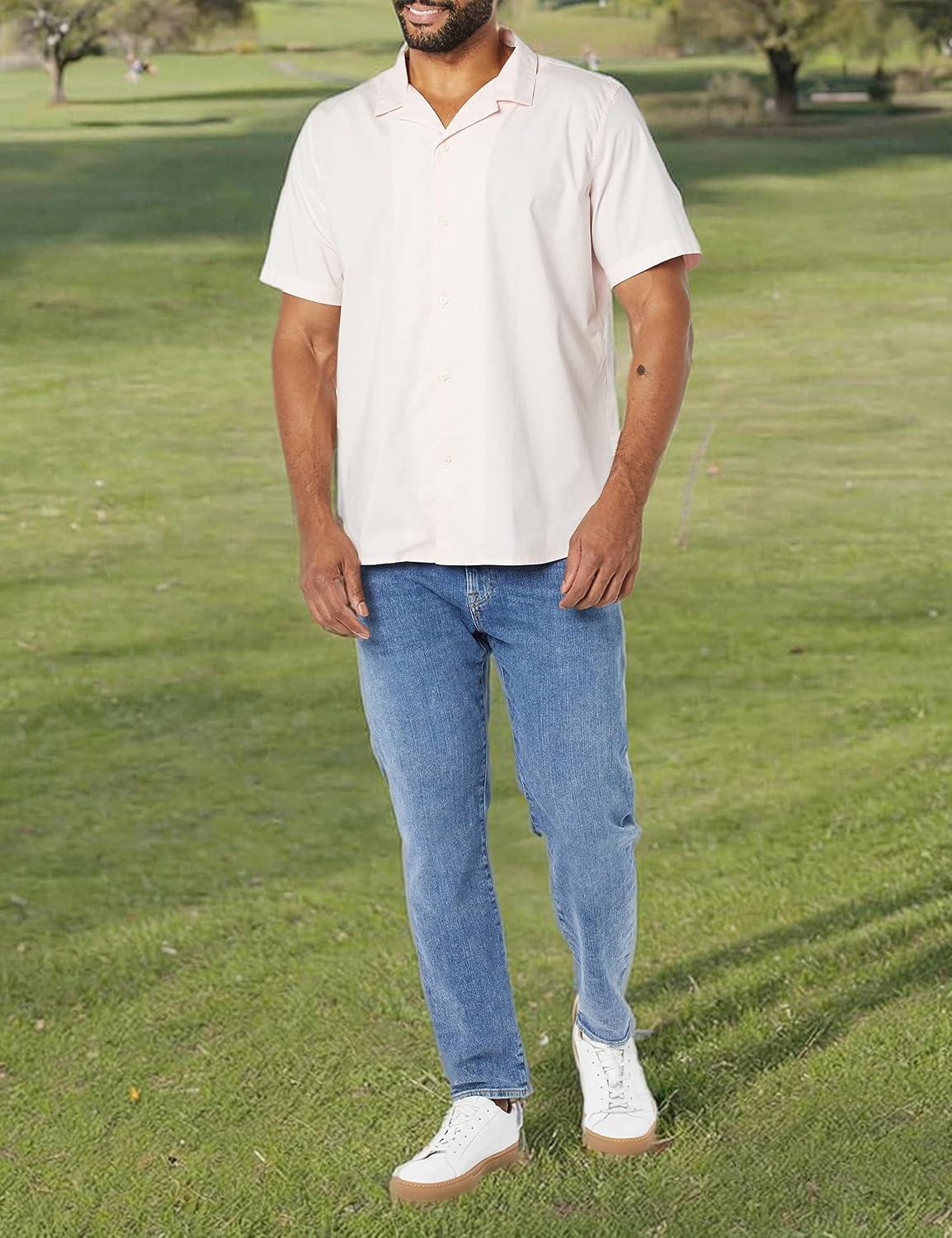 This men's vacation shirt features a slim fit that flatters the shoulders, chest, and waist. Constructed from lightweight yet durable stretch poplin, this men's button-down short-sleeve shirt includes a subtle 2% stretch for mobility and comfort. Our shirt showcases a relaxed camp collar and stylish shirttail hem, complementing shorts or chinos for a laid-back look. Our commitment at Amazon Essentials is to offer high-quality, lasting apparel such as men's casual button-down shirts. With our consistent sizing, selecting the perfect vacation shirt becomes simple.