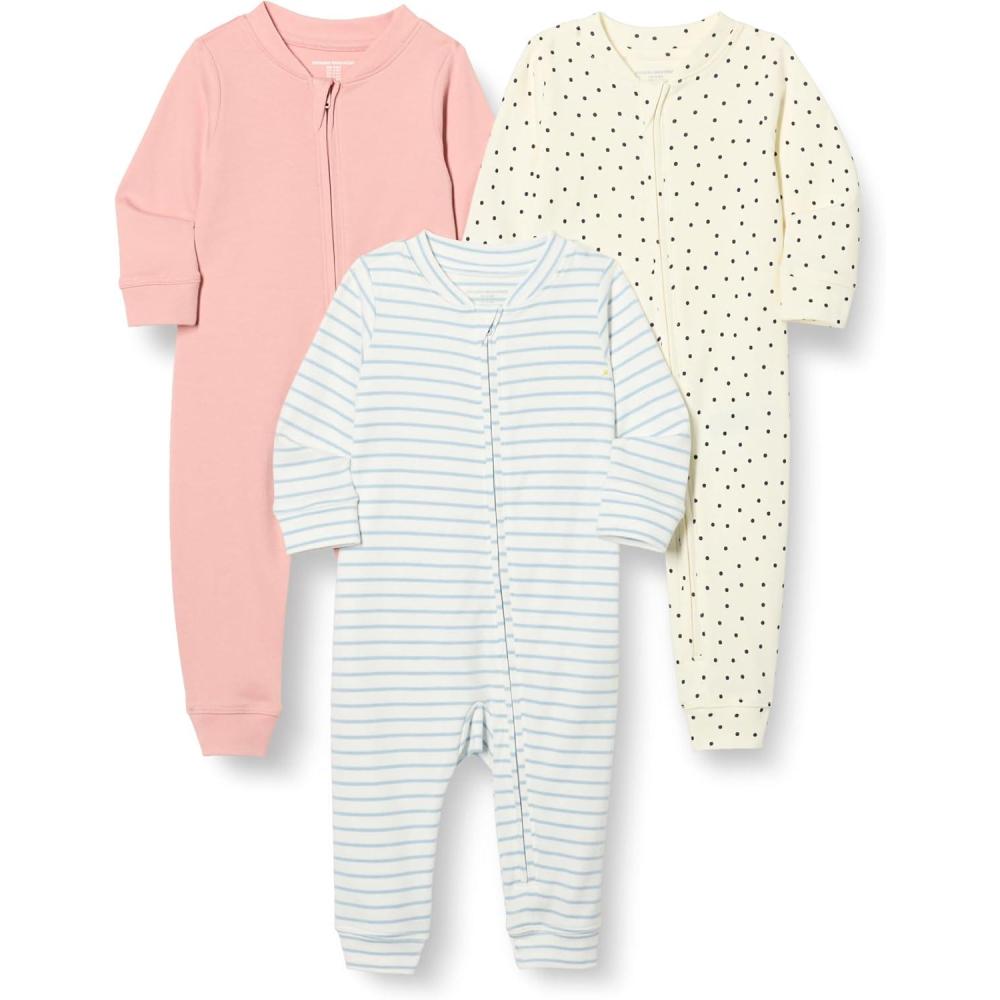 Amazon Essentials Unisex Babies’ Cotton Zip-Front Footless Sleepsuit, Pack of 3(Dusty Rose/Dots/Stripe)