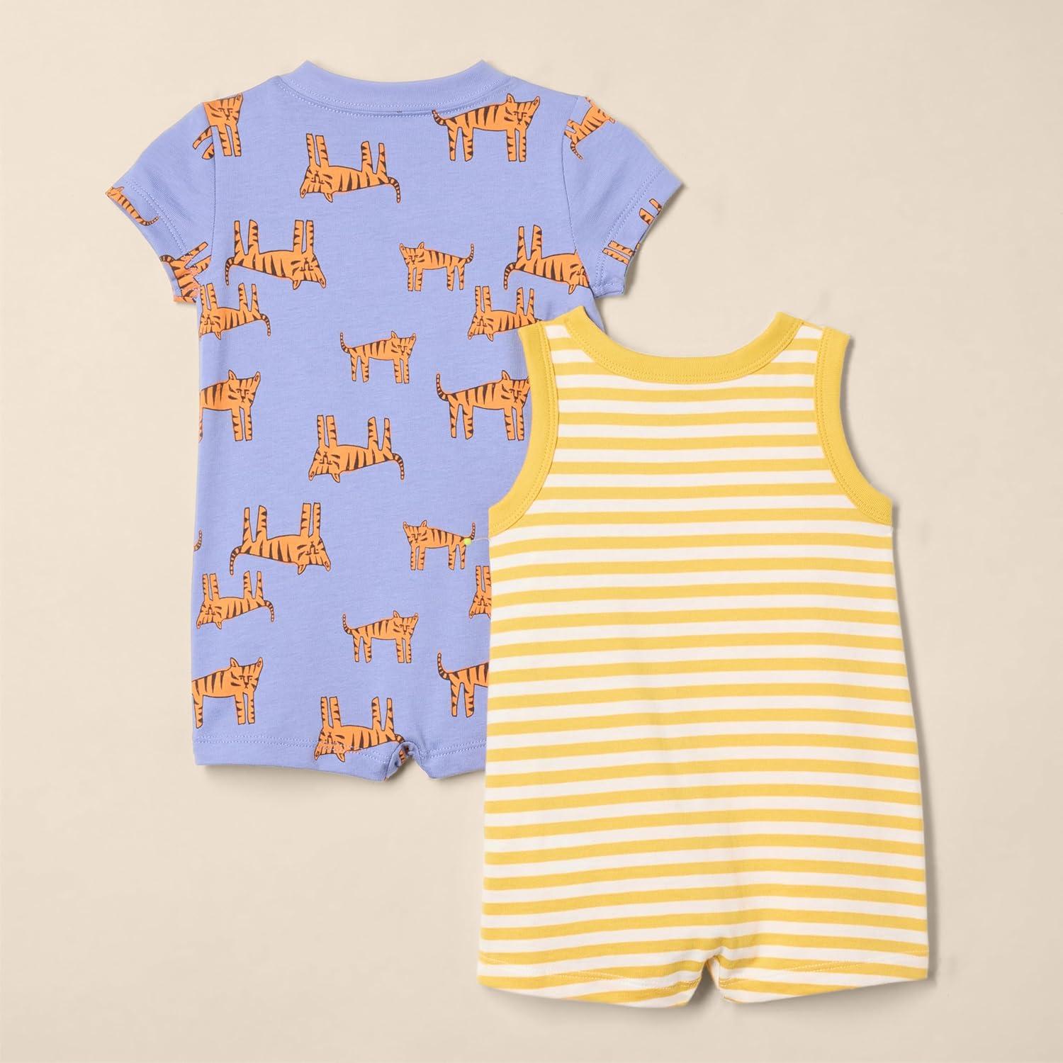 Amazon Essentials Unisex Babies’ Sleeveless and Short-Sleeve Romper Set, Pack of 2(Purple Melon Tiger/Stripe)