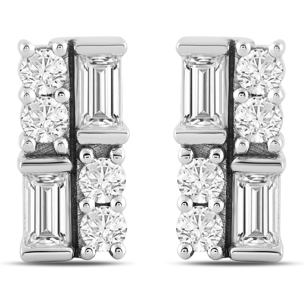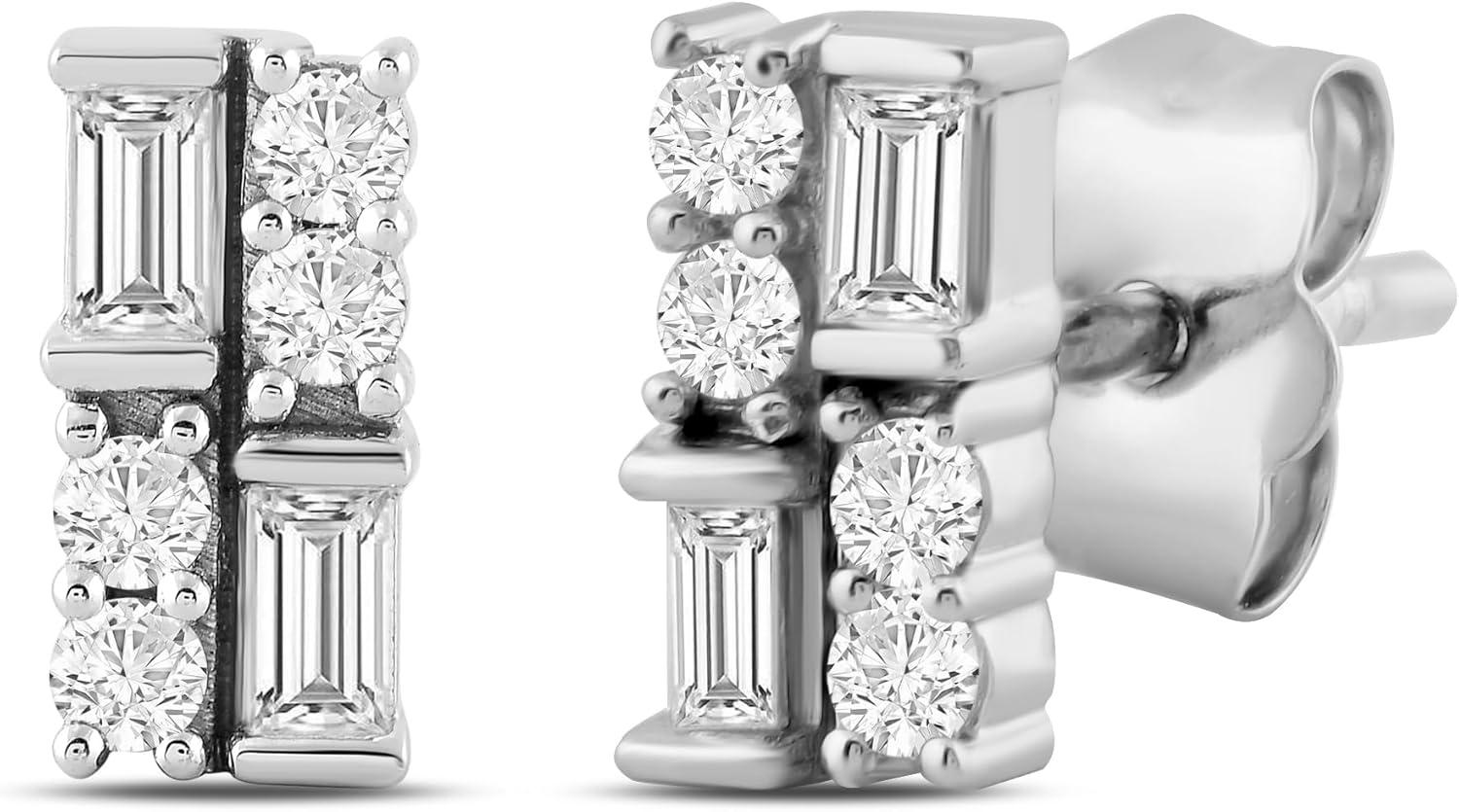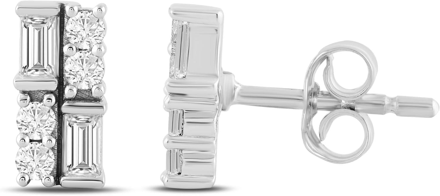 These stunning stud earrings feature a blend of round and baguette-cut diamonds set in 10K white gold, totaling 1/4 carat. Their classic design and sparkling brilliance make them a perfect choice for adding elegance and sophistication to any outfit. Ideal for everyday wear or special occasions, these earrings are a timeless addition to your jewelry collection.