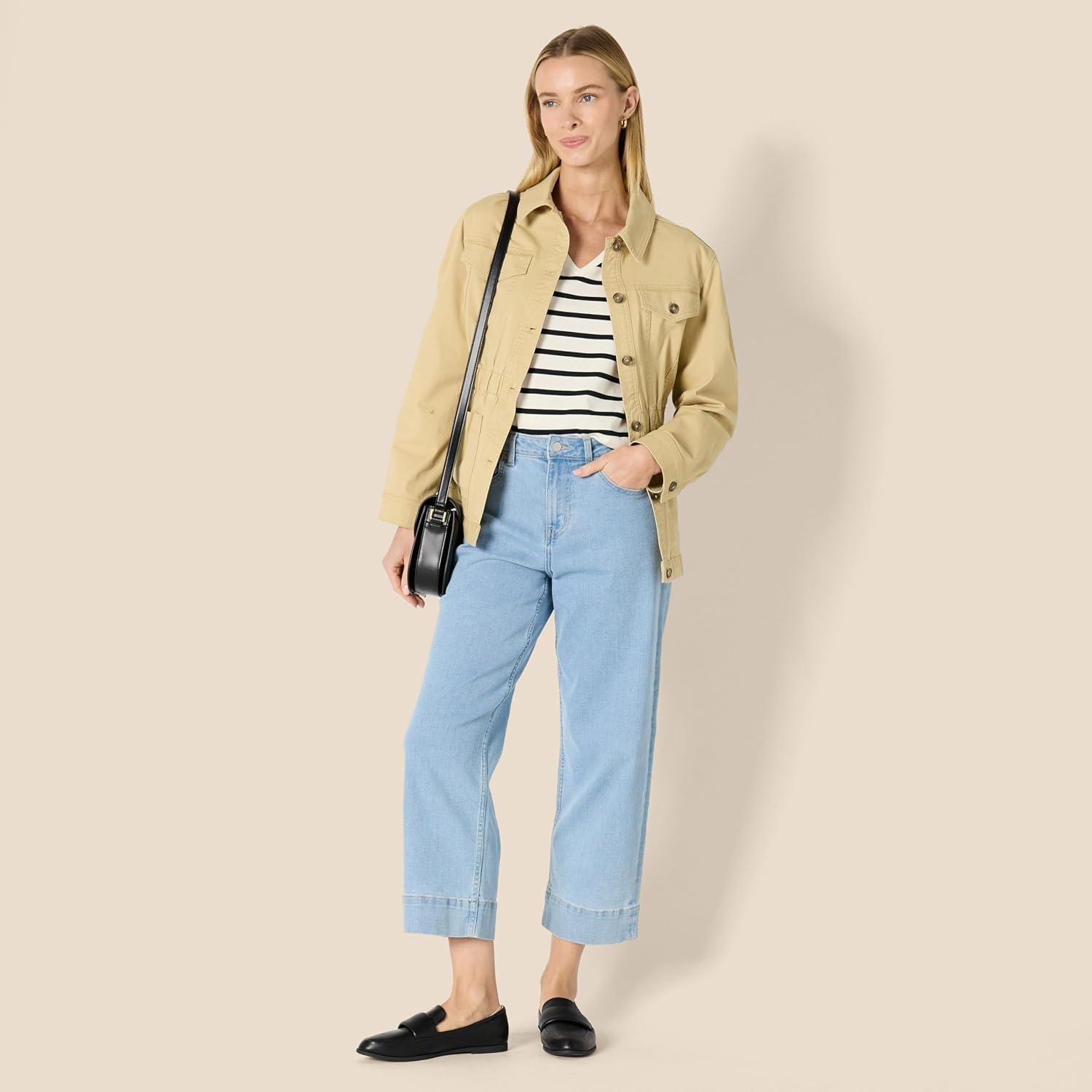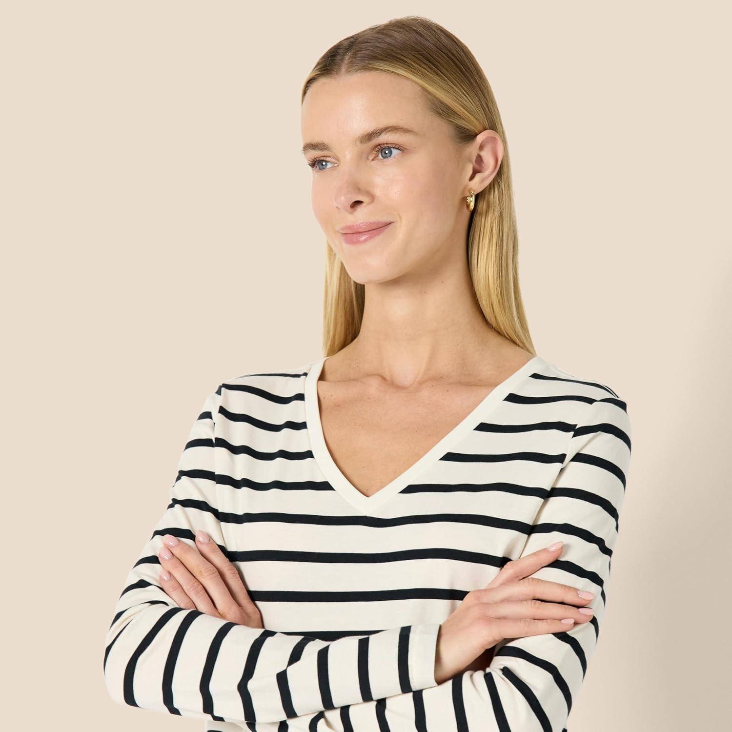 Amazon Essentials Women’s 100% Cotton Regular-Fit Long-Sleeve V-Neck T-Shirt(Eggshell White Black Mariner Stripe)