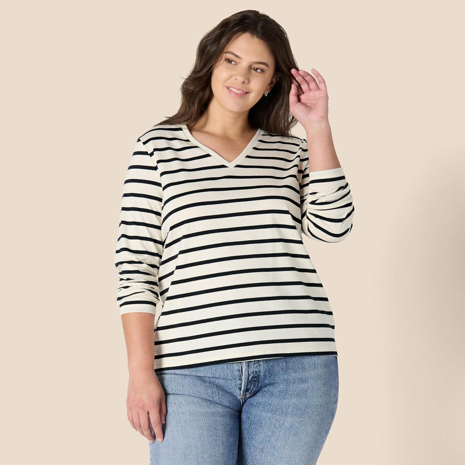 Amazon Essentials Women's 100% Cotton Regular-Fit Long-Sleeve V-Neck T-Shirt(Eggshell White Black Mariner Stripe)