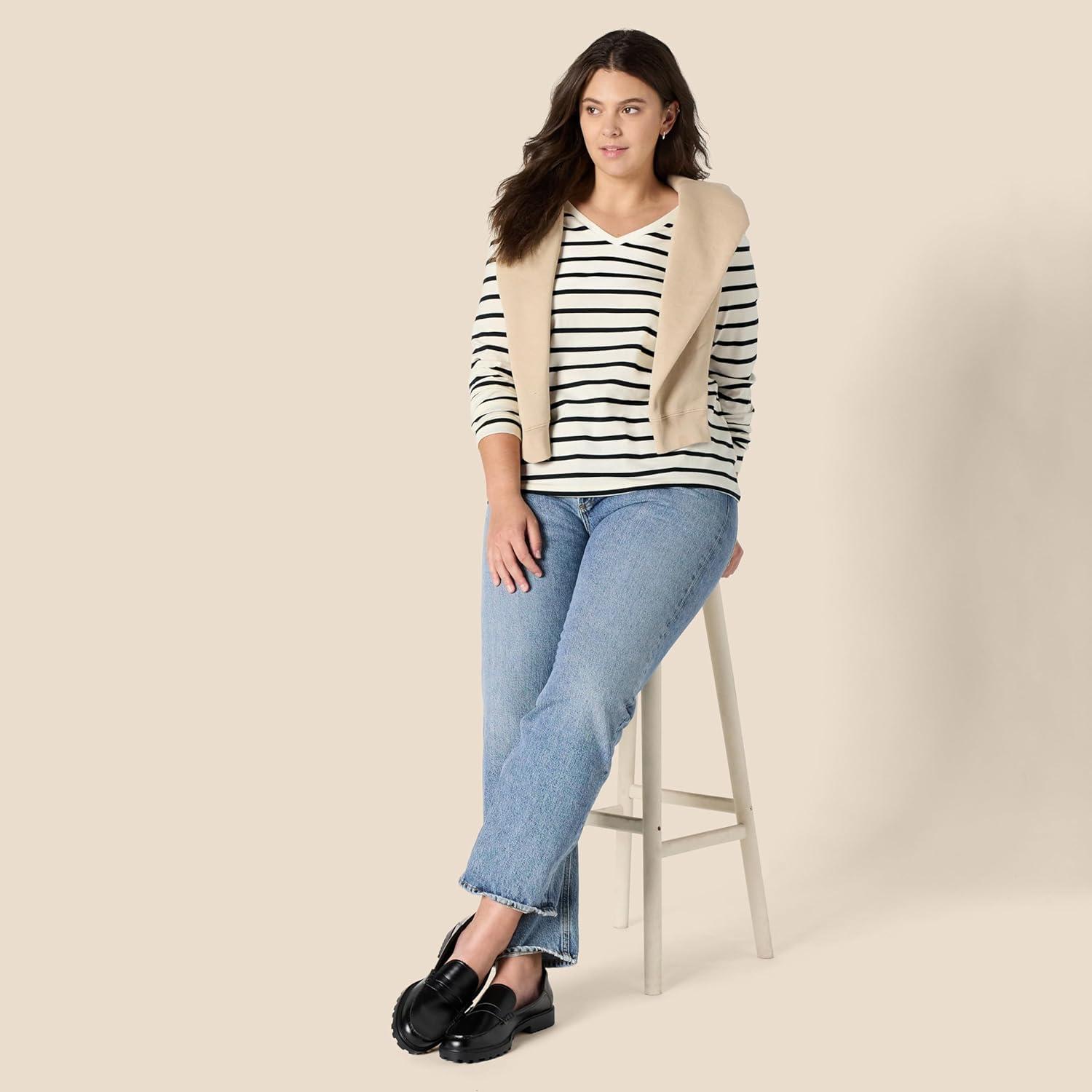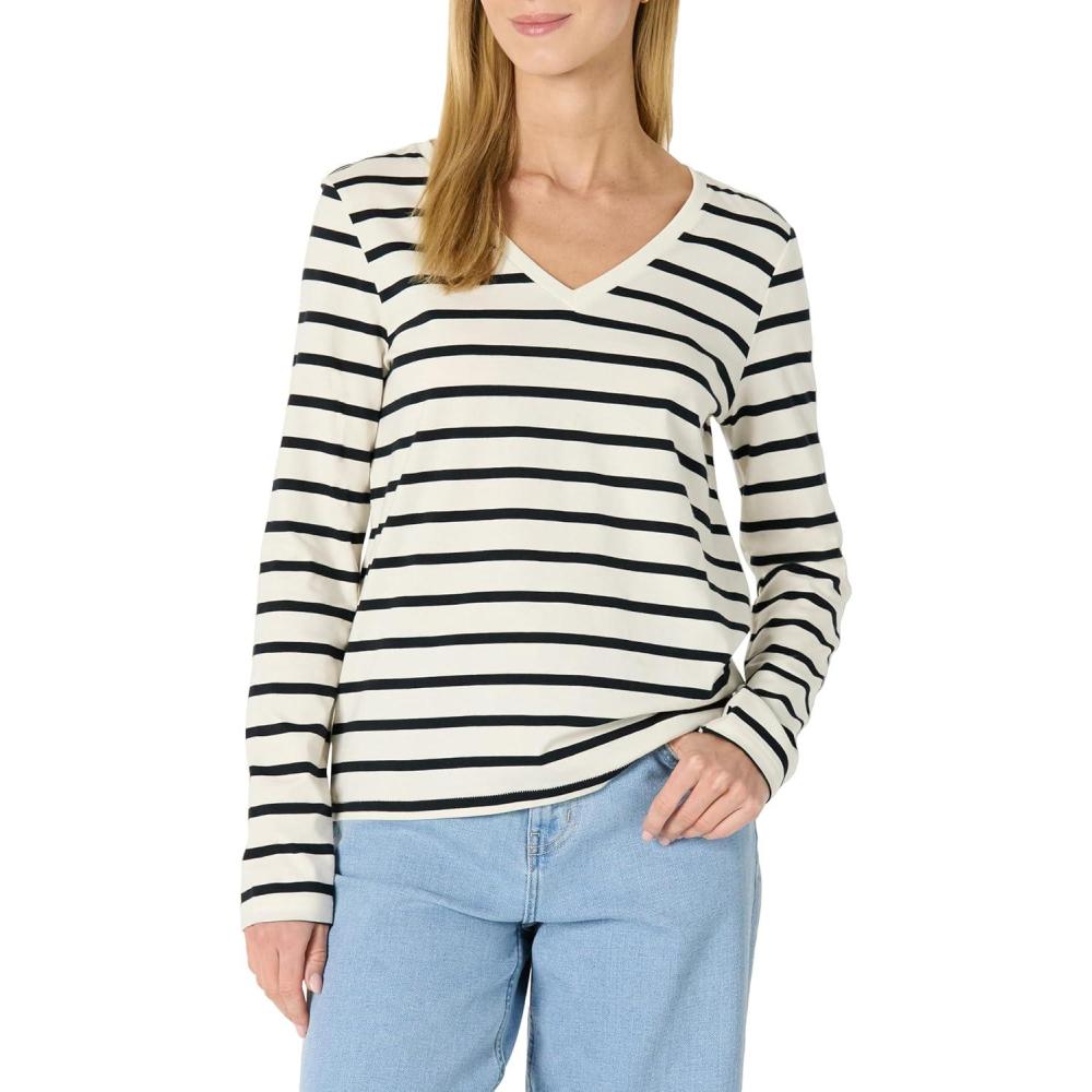 Don’t wait, get up to 50% off on Amazon Essentials Women’s 100% Cotton Regular-Fit Long-Sleeve V-Neck T-Shirt(Eggshell White Black Mariner Stripe) during our end-of-season sale event.