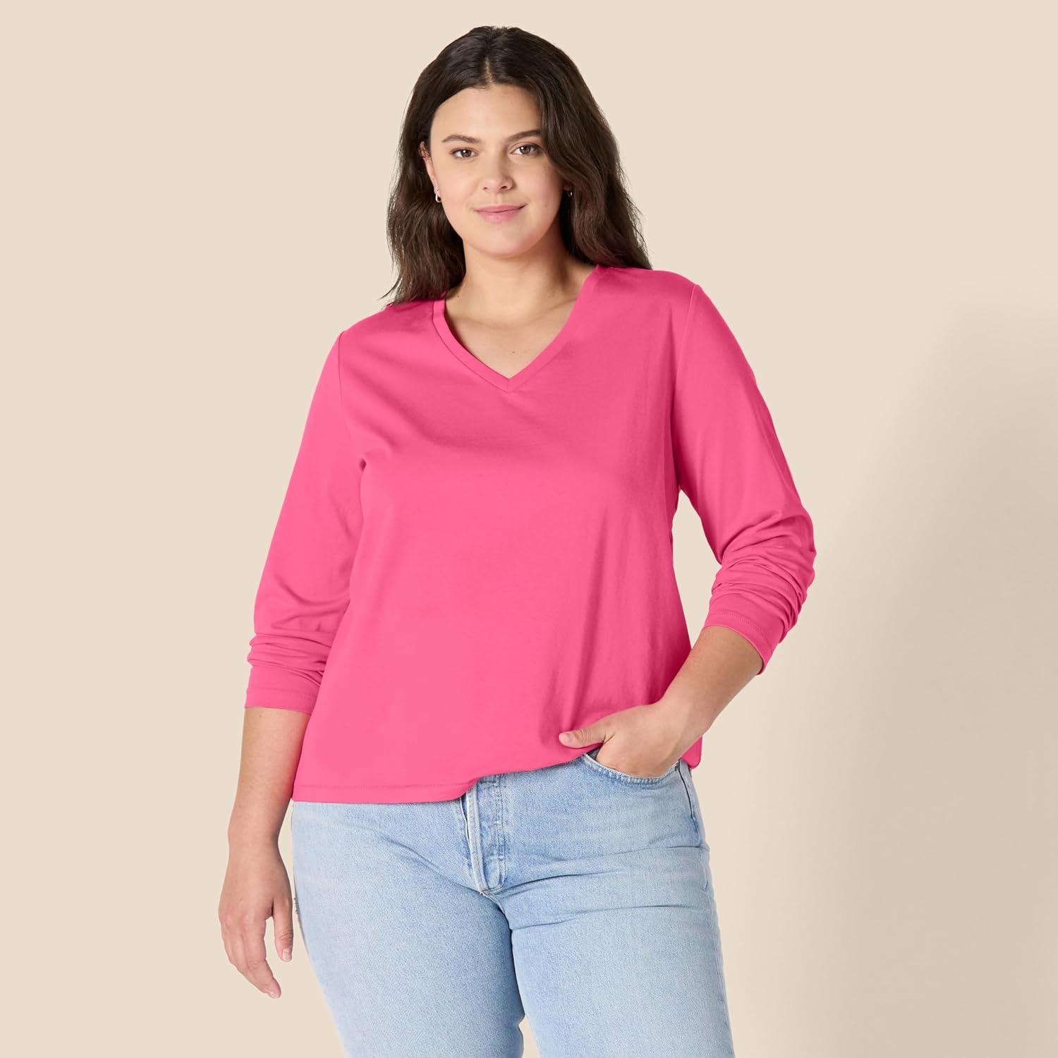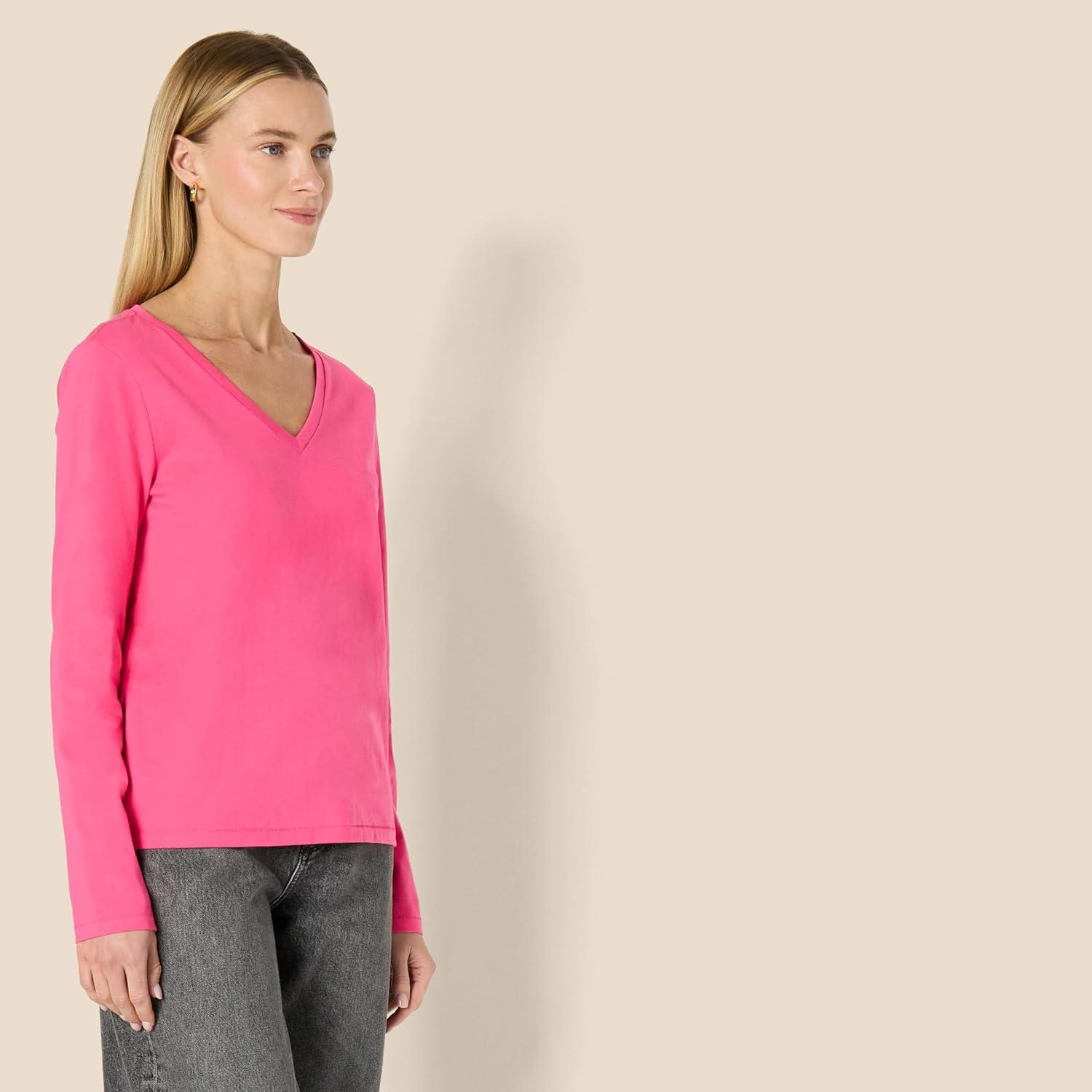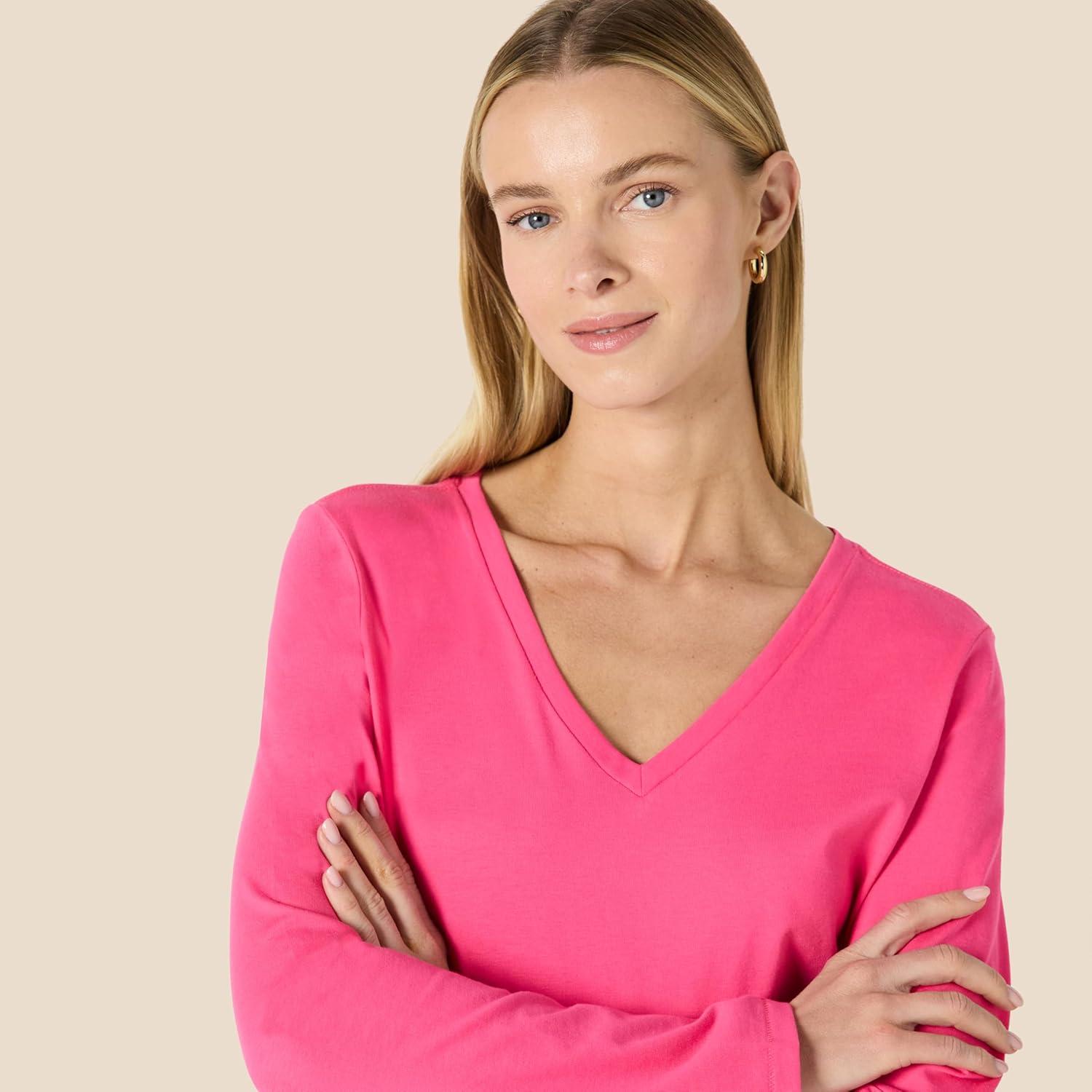 Amazon Essentials Women’s 100% Cotton Regular-Fit Long-Sleeve V-Neck T-Shirt(Hot Pink)