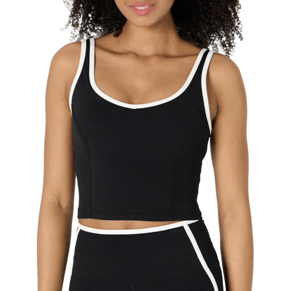Amazon Essentials Women’s Active FormFlex Buttery Soft Light Support Crop Tank with Bra and Contrast Trim(Black/White)