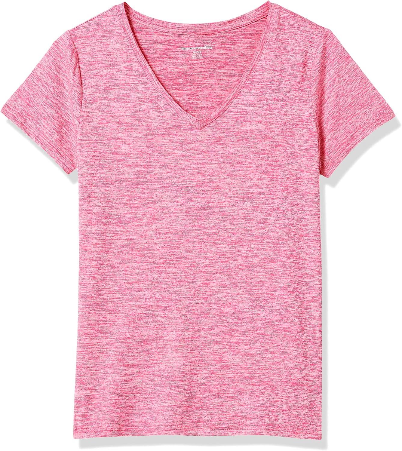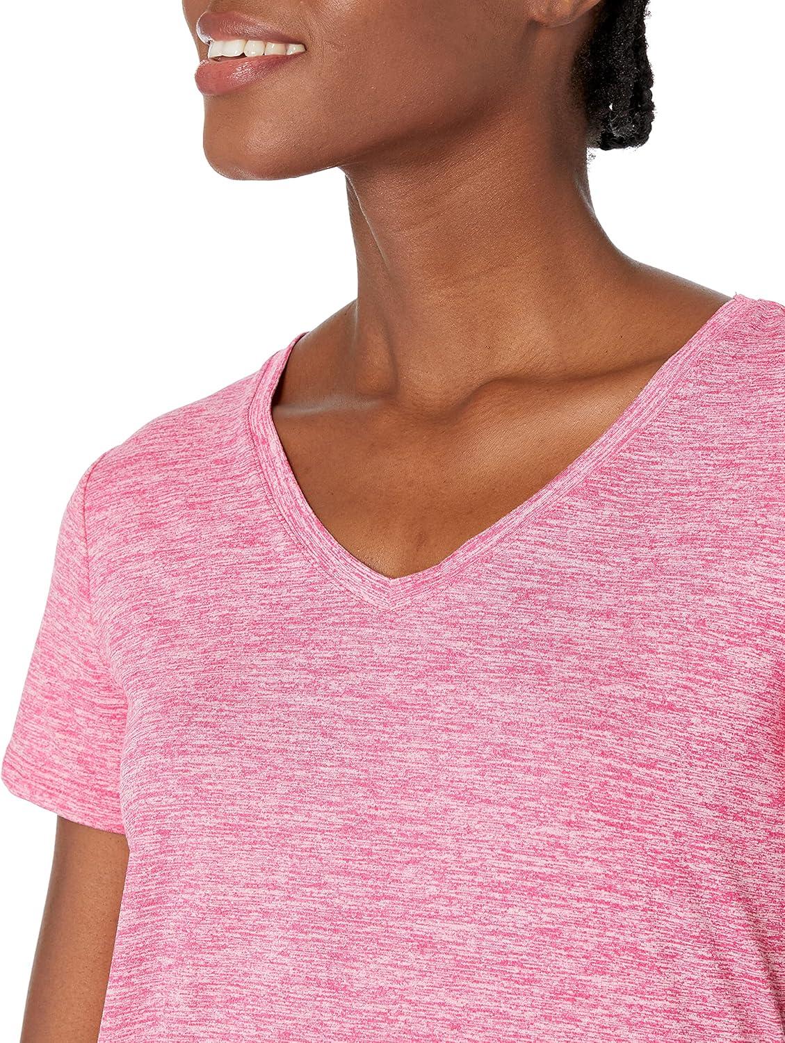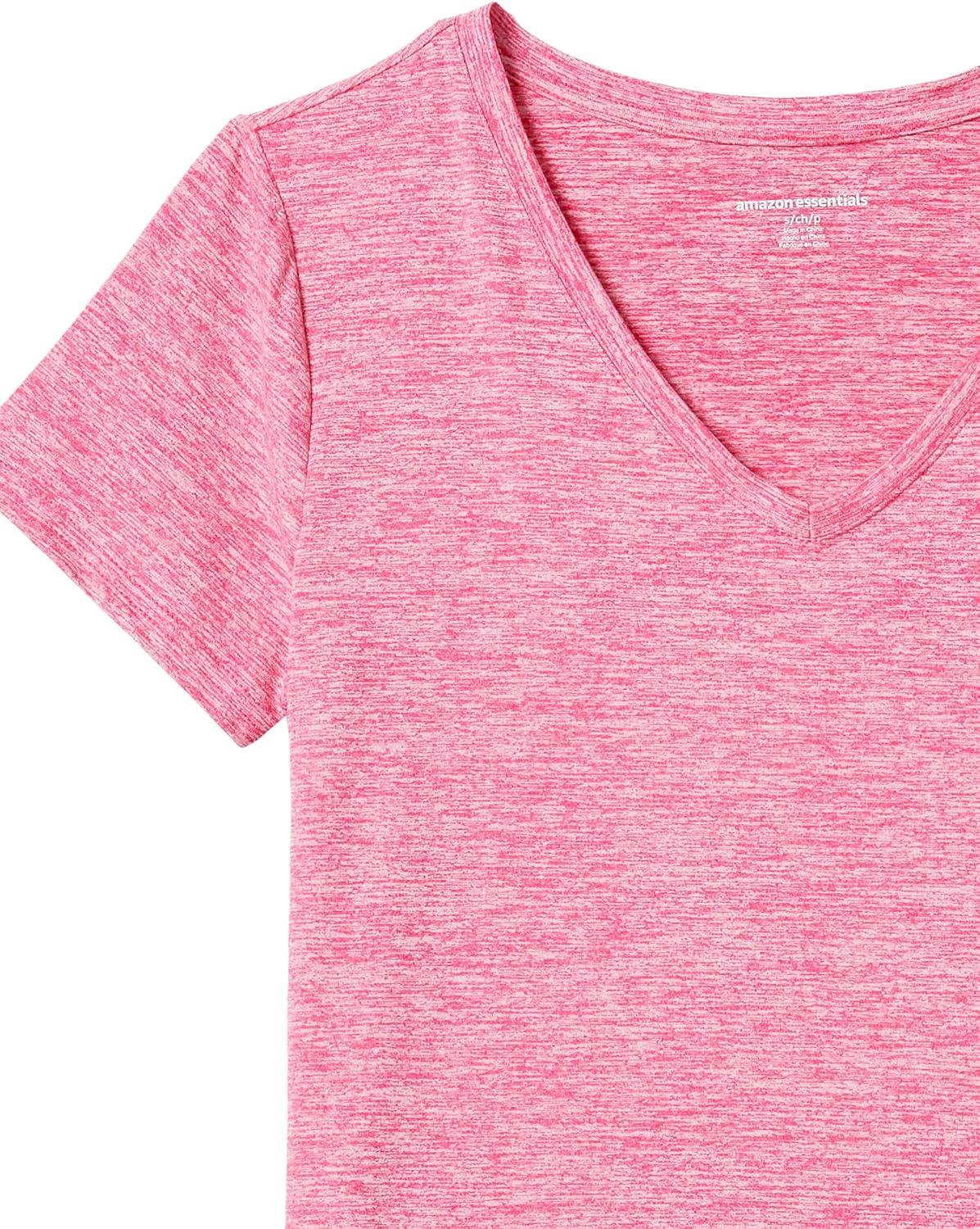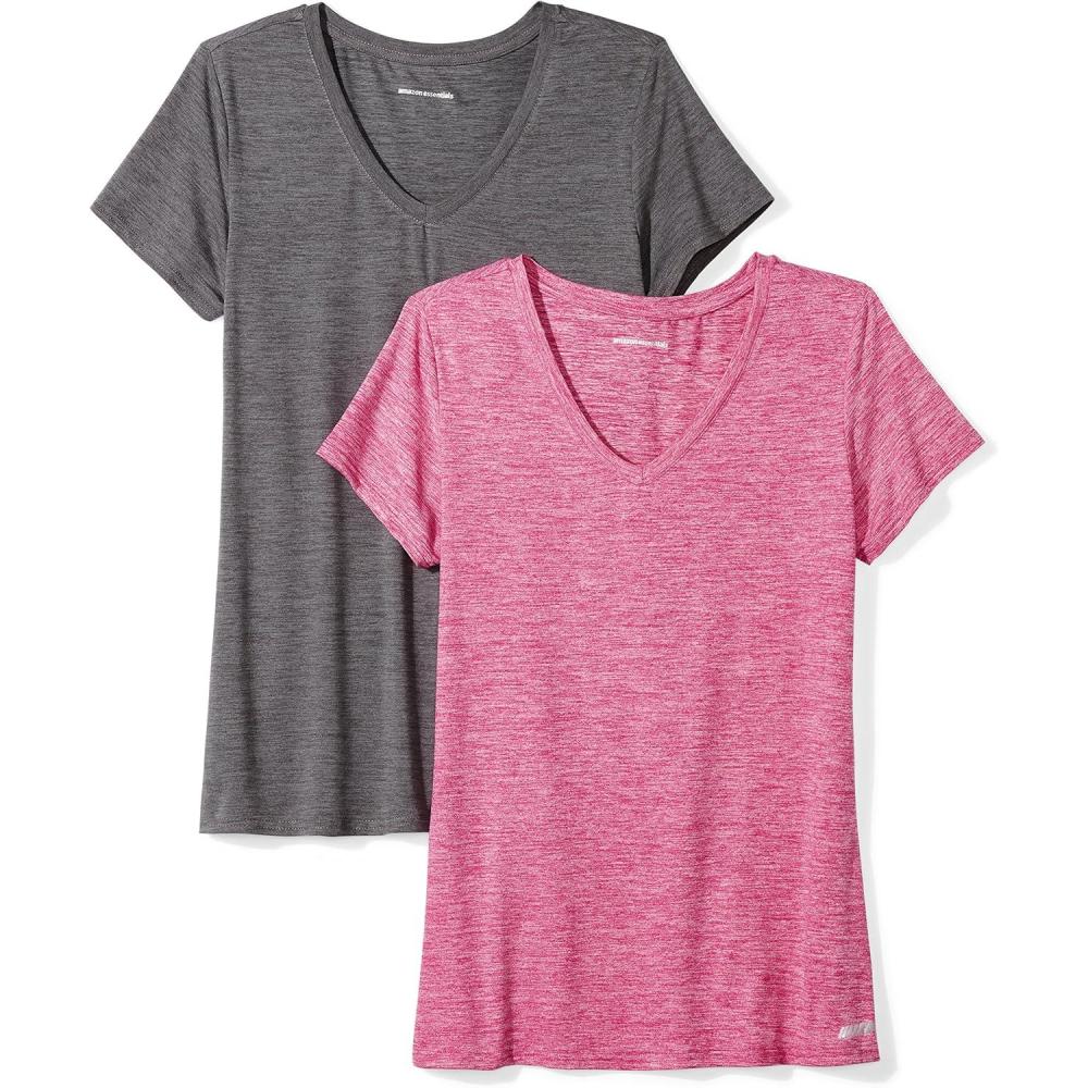 Amazon Essentials Women’s Active Quick Dry Tech Stretch Short-Sleeve V-Neck T-Shirt (Available in Plus Size), Pack of 2(Charcoal Heather Space Dye/Raspberry Red Space Dye)