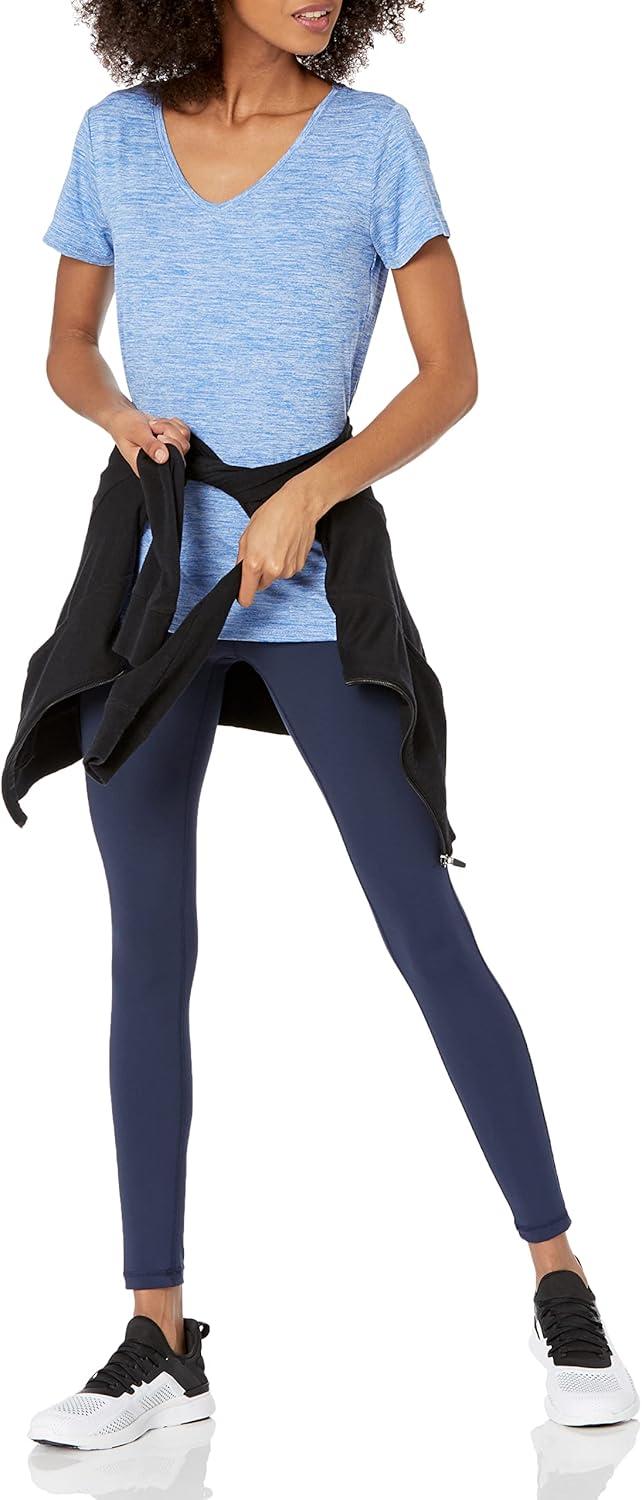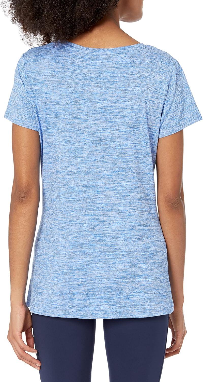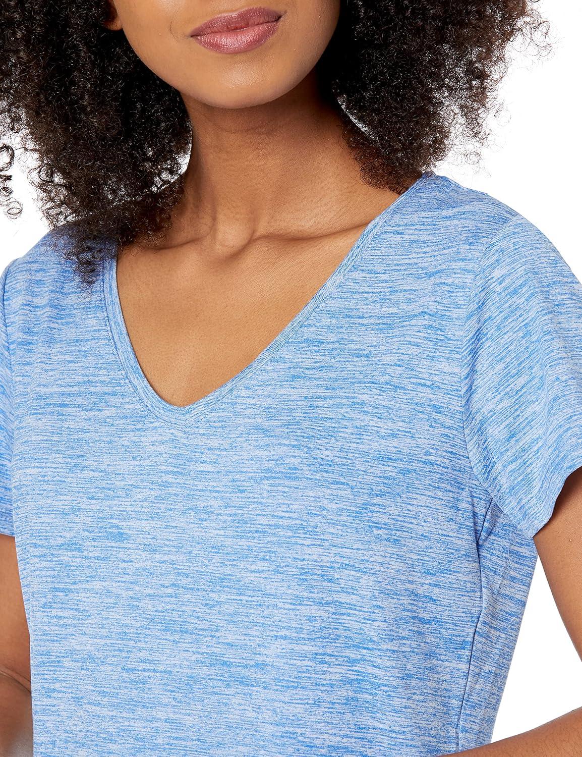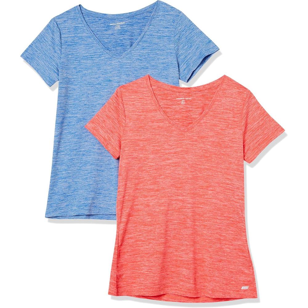 Amazon Essentials Women’s Active Quick Dry Tech Stretch Short-Sleeve V-Neck T-Shirt (Available in Plus Size), Pack of 2(Coral Orange Space Dye/Light Blue Space Dye)