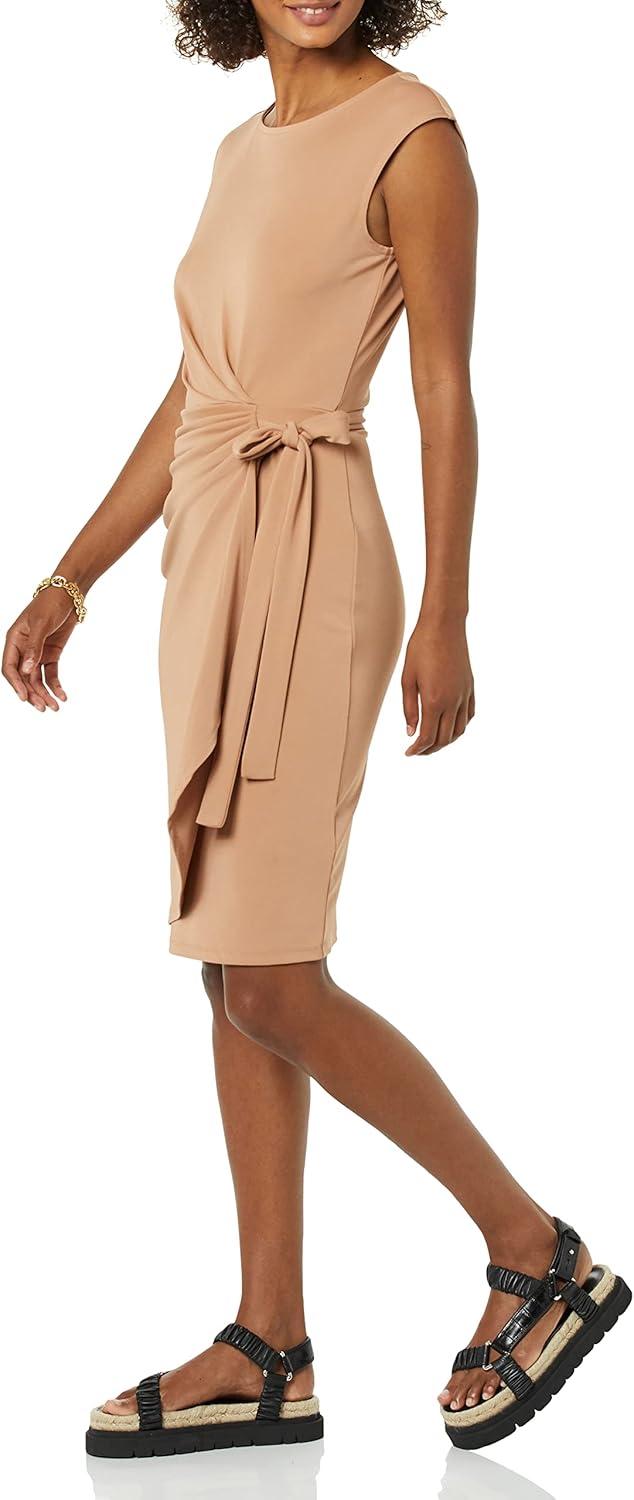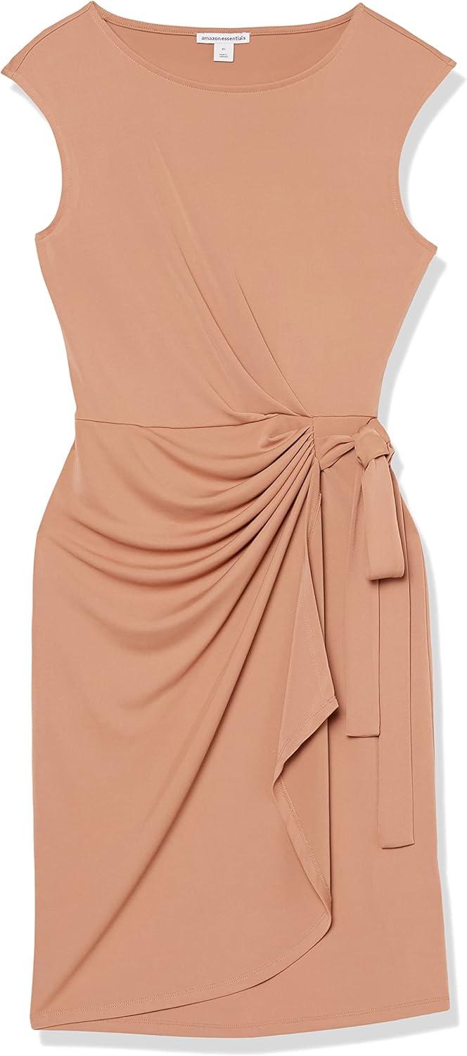 Amazon Essentials Women's Cap Sleeve Boat-Neck Faux Wrap Dress(Light Brown)