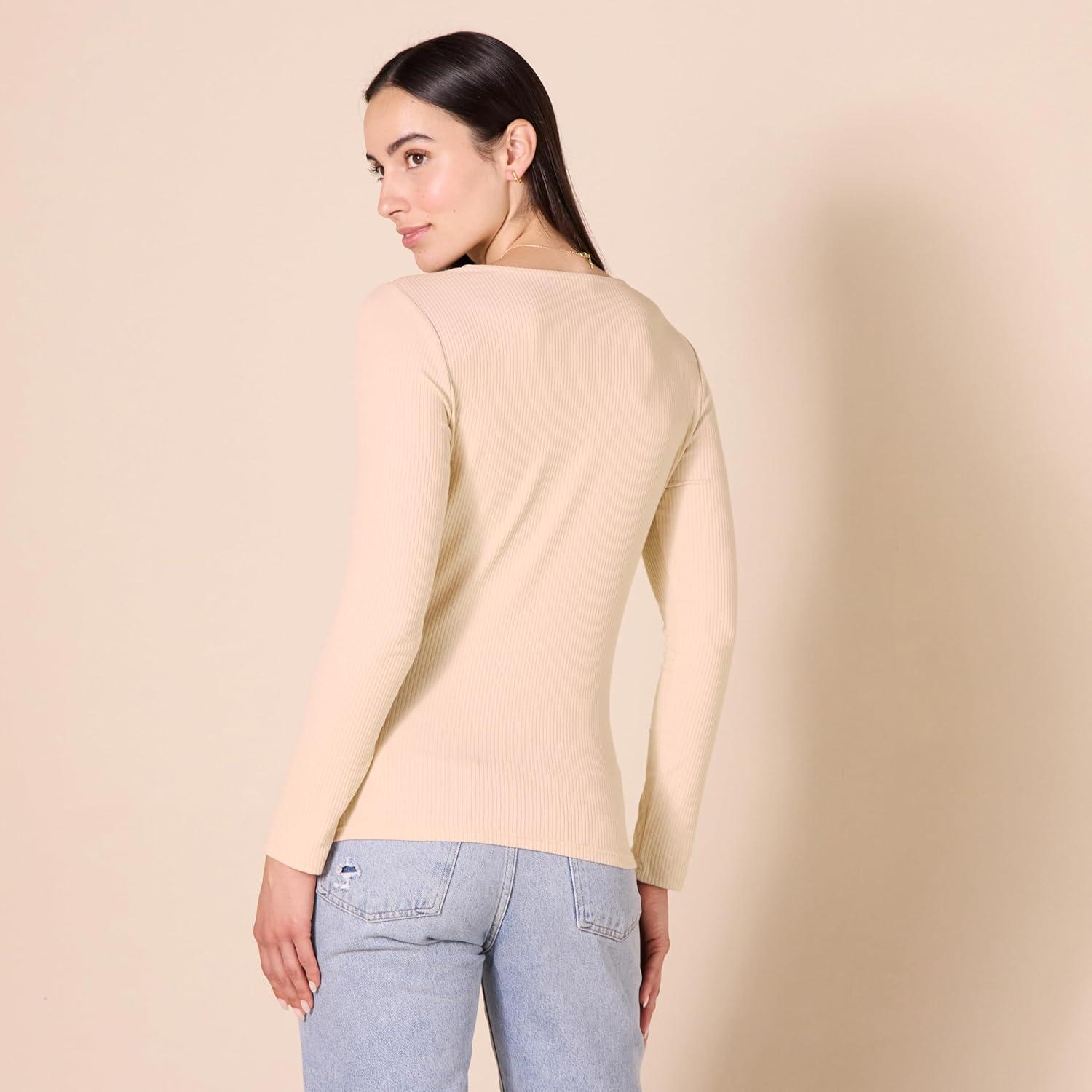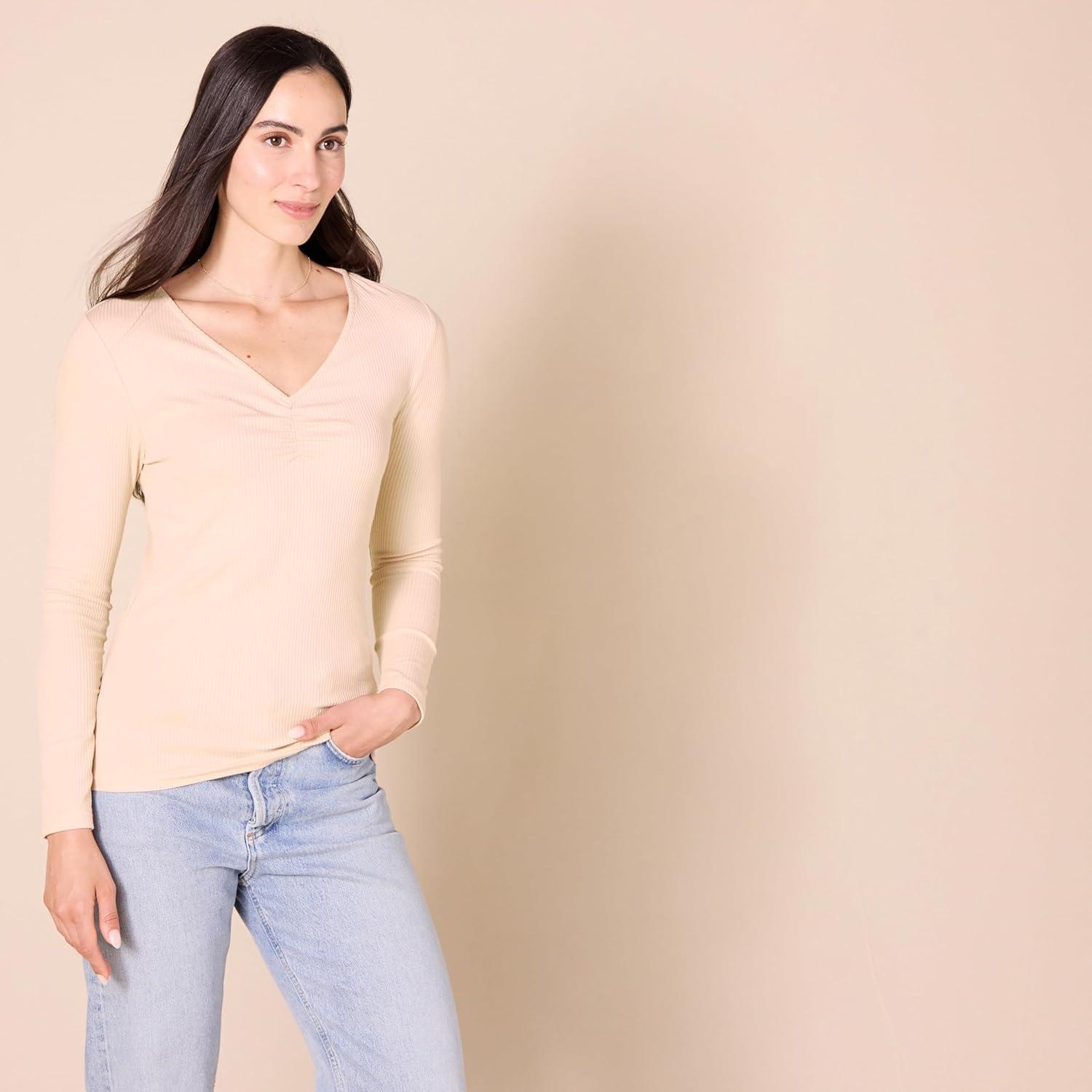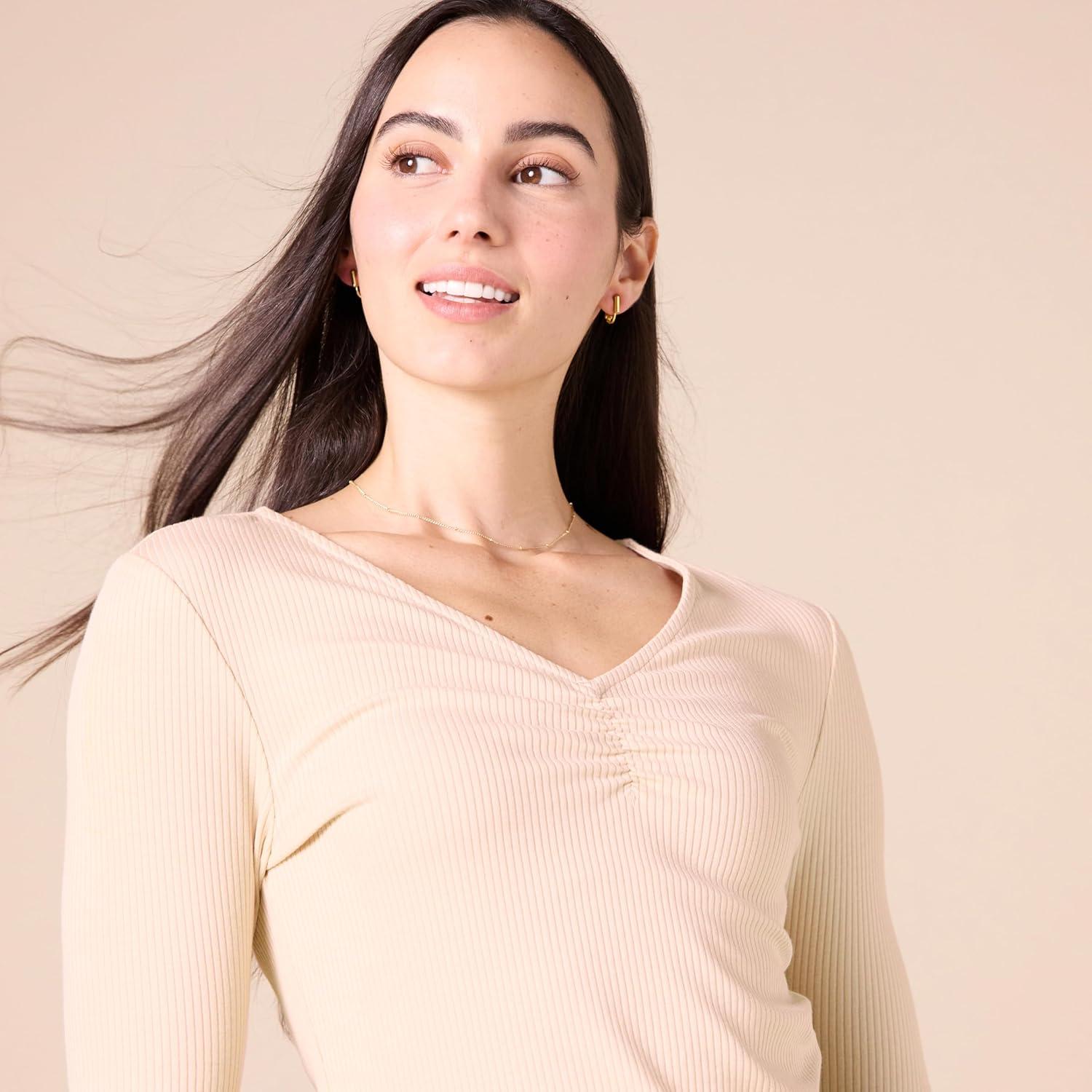 Amazon Essentials Women’s Cinched V-Neck Long Sleeve Slim-Fit Rib-Knit T-Shirt, Pack of 2(Black/Caramel)