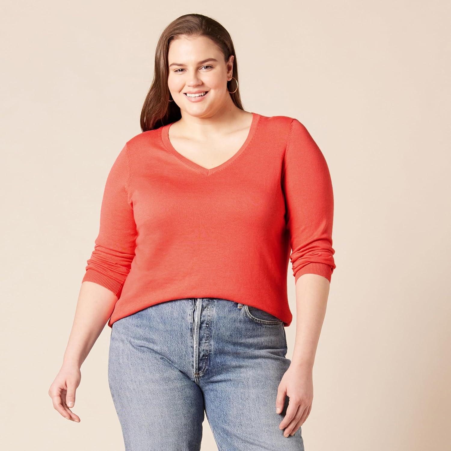 Amazon Essentials Women’s Classic-Fit Lightweight Long-Sleeve V-Neck Sweater (Available in Plus Size)(Coral Pink)