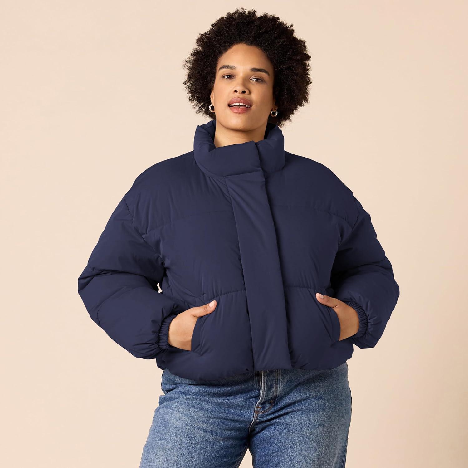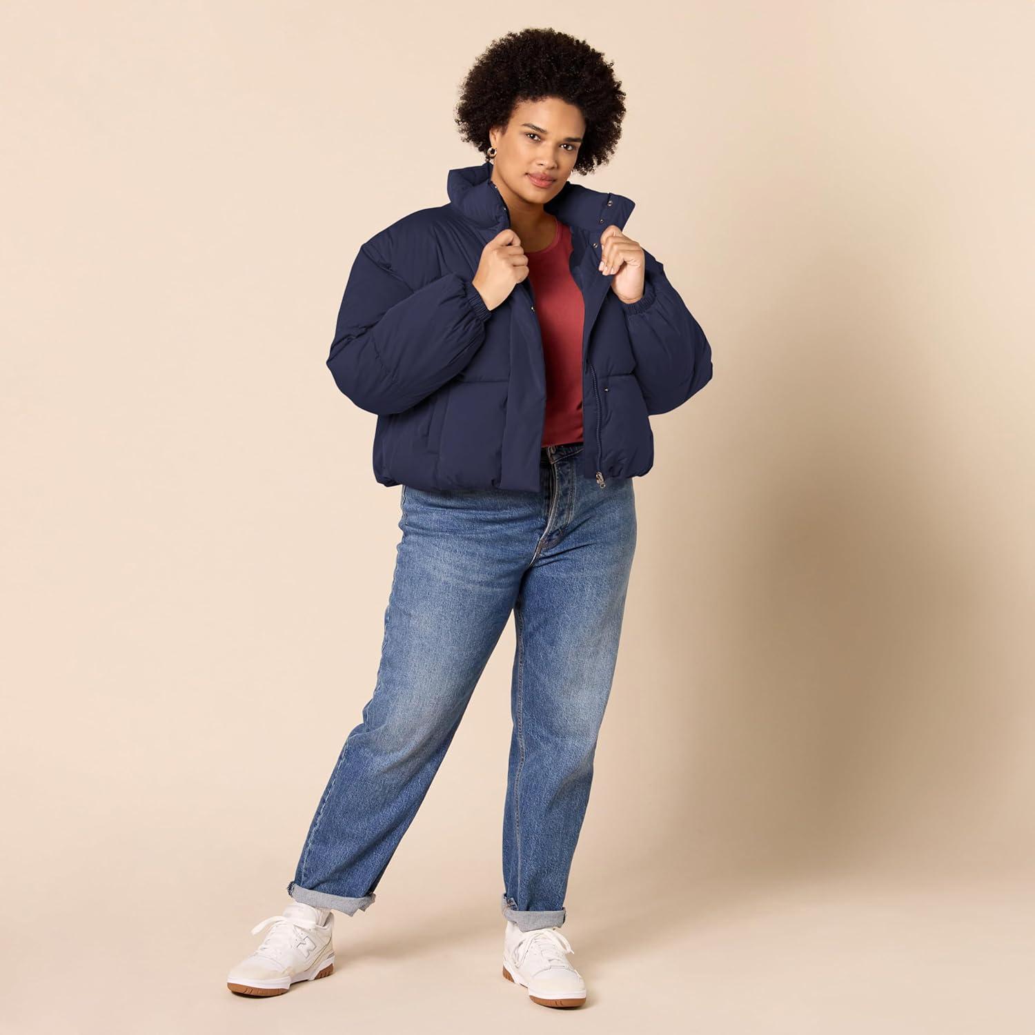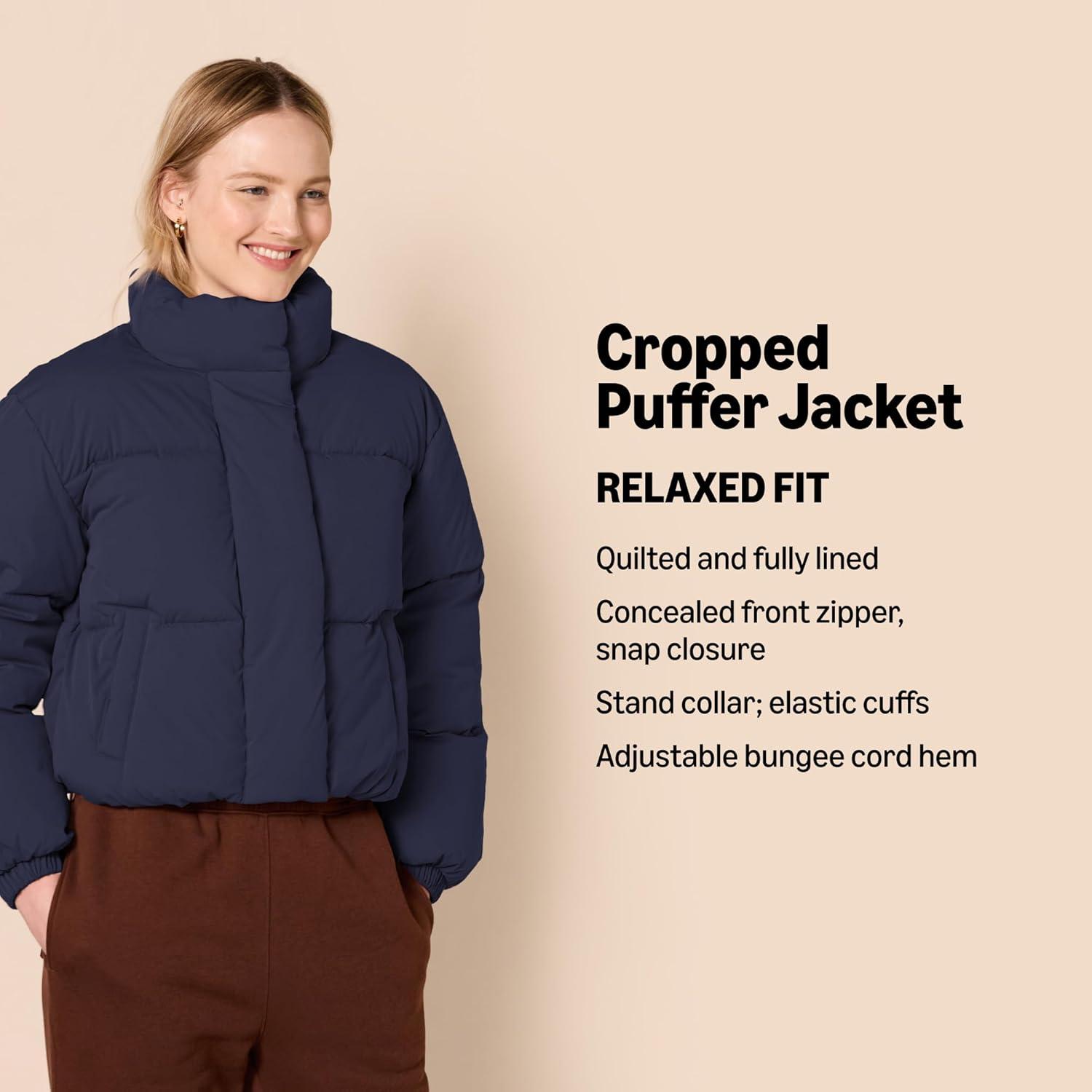 Amazon Essentials Women’s Cropped Full-Zip Puffer Jacket (Quilted Matte or Sherpa Fleece)(Navy)