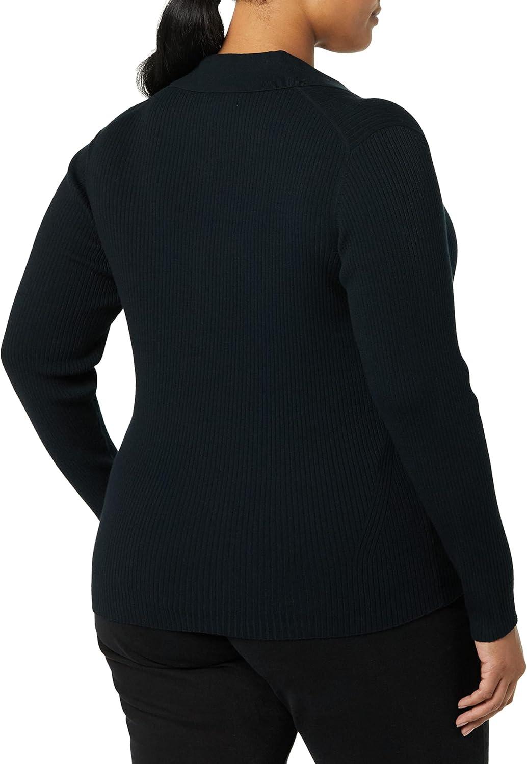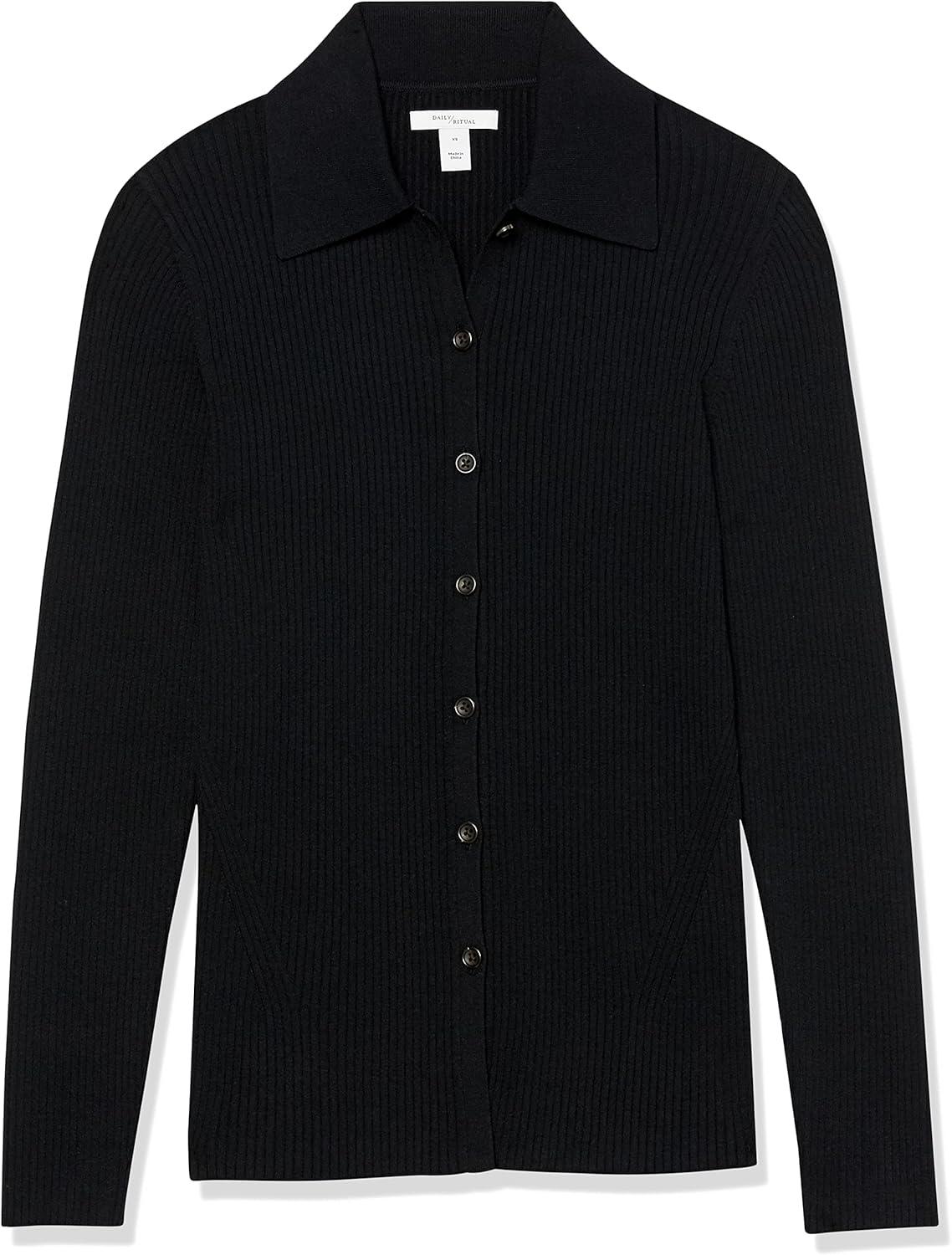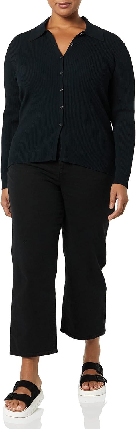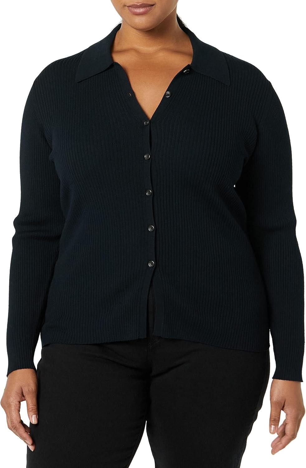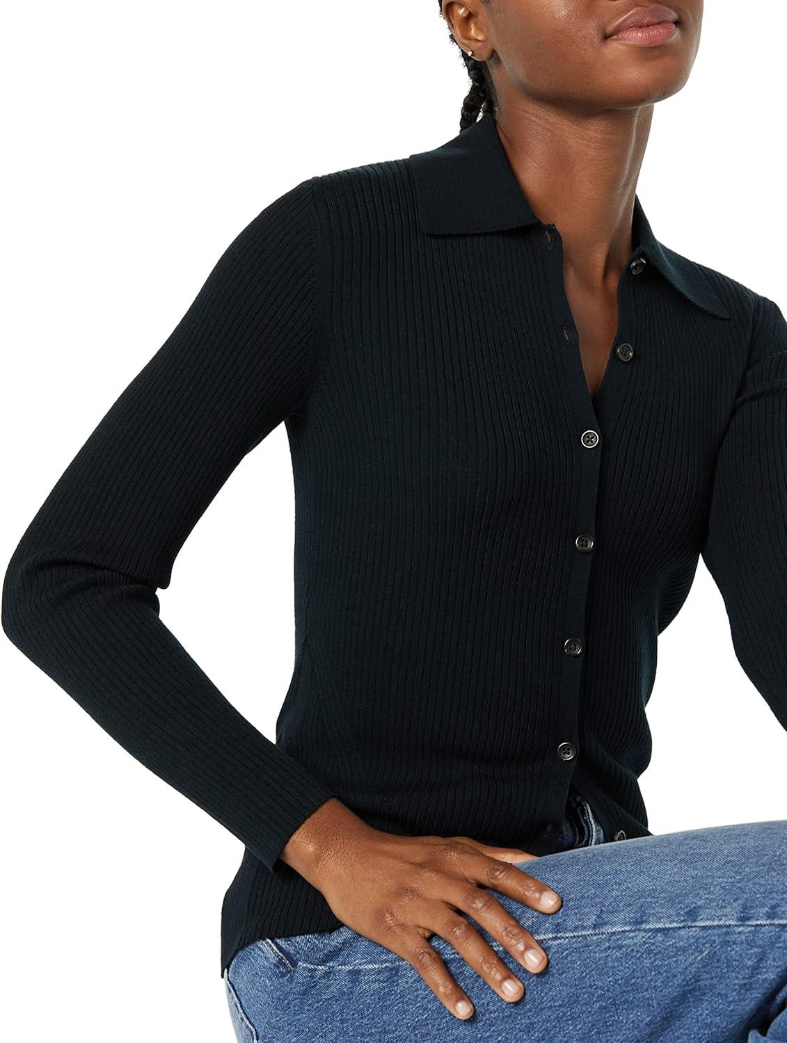 Amazon Essentials Women’s Fine Gauge Stretch Polo Ribbed Cardigan (Previously Daily Ritual)(Black)