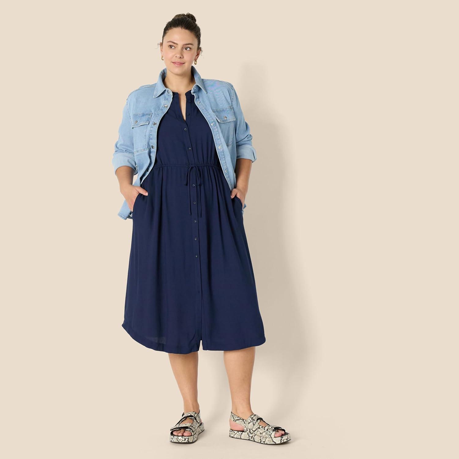 Amazon Essentials Women’s Fit and Flare Half-Sleeve Waisted Midi A-Line Dress with Pockets(Navy)