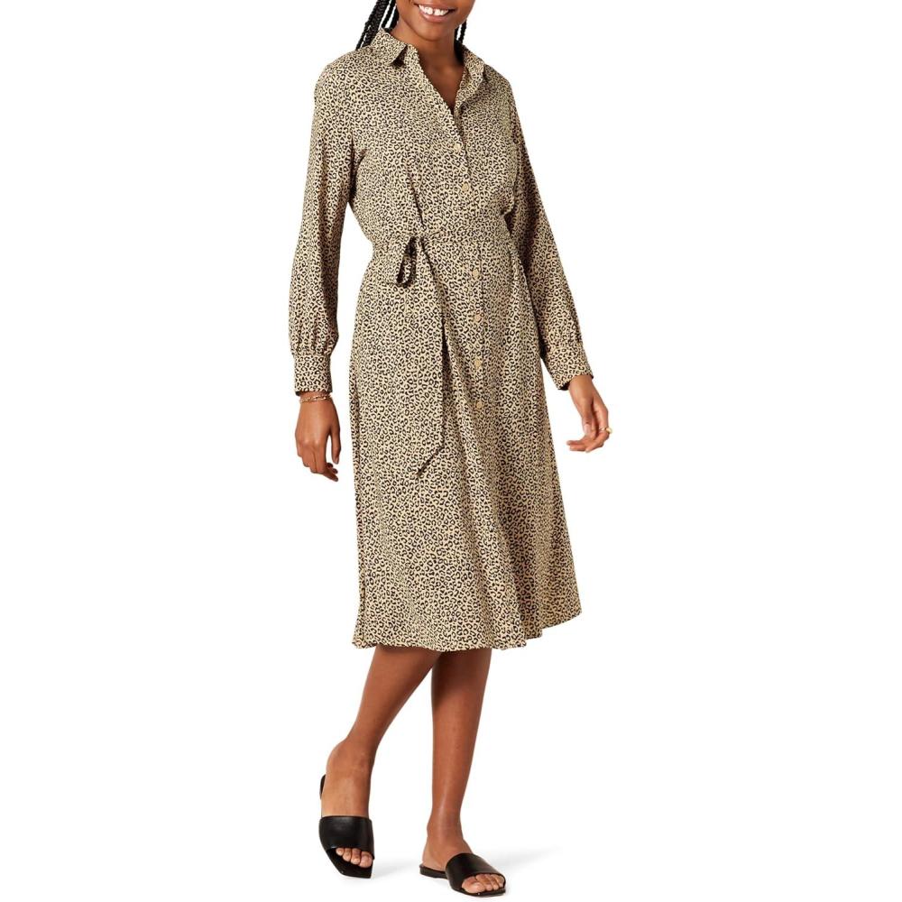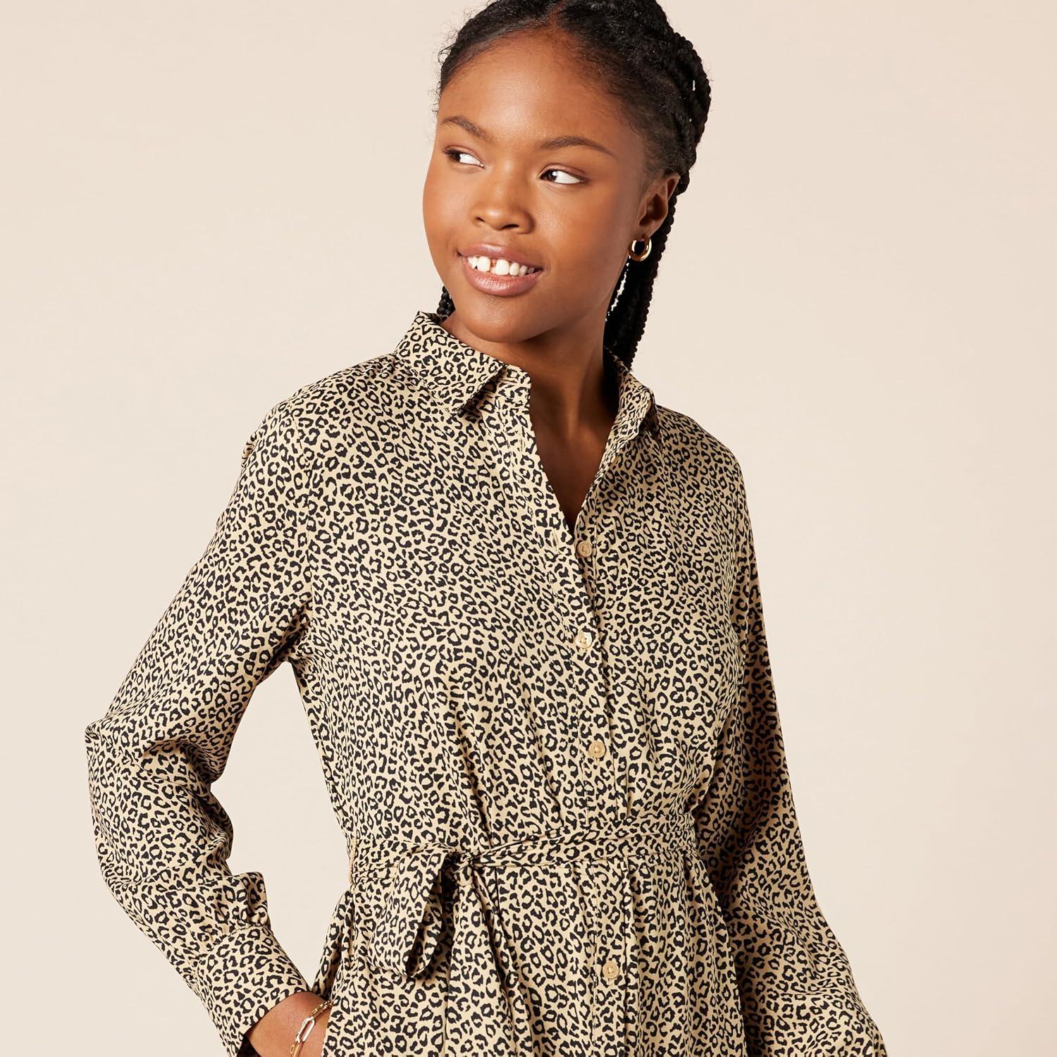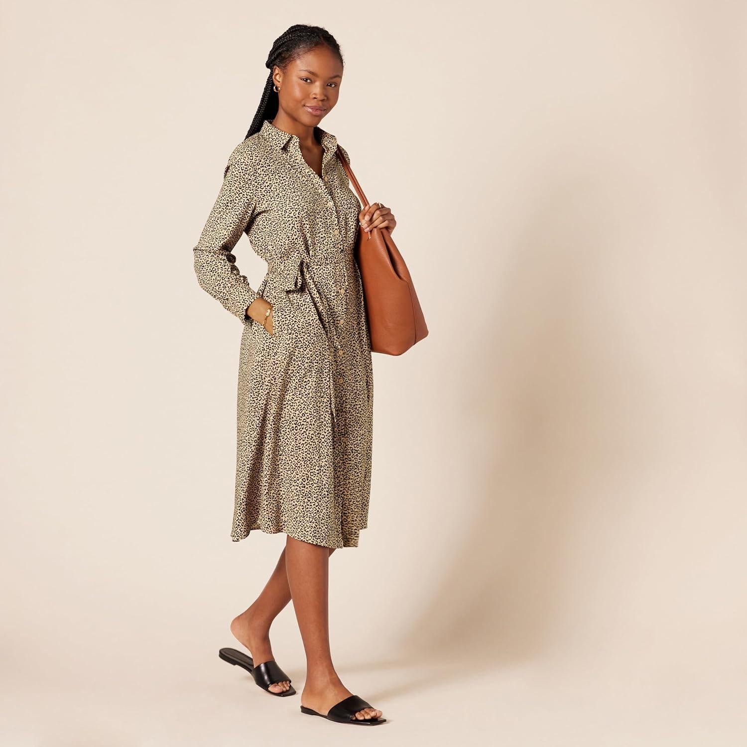 Amazon Essentials Women’s Georgette Long Sleeve Midi Length Shirt Dress(Taupe Leopard)