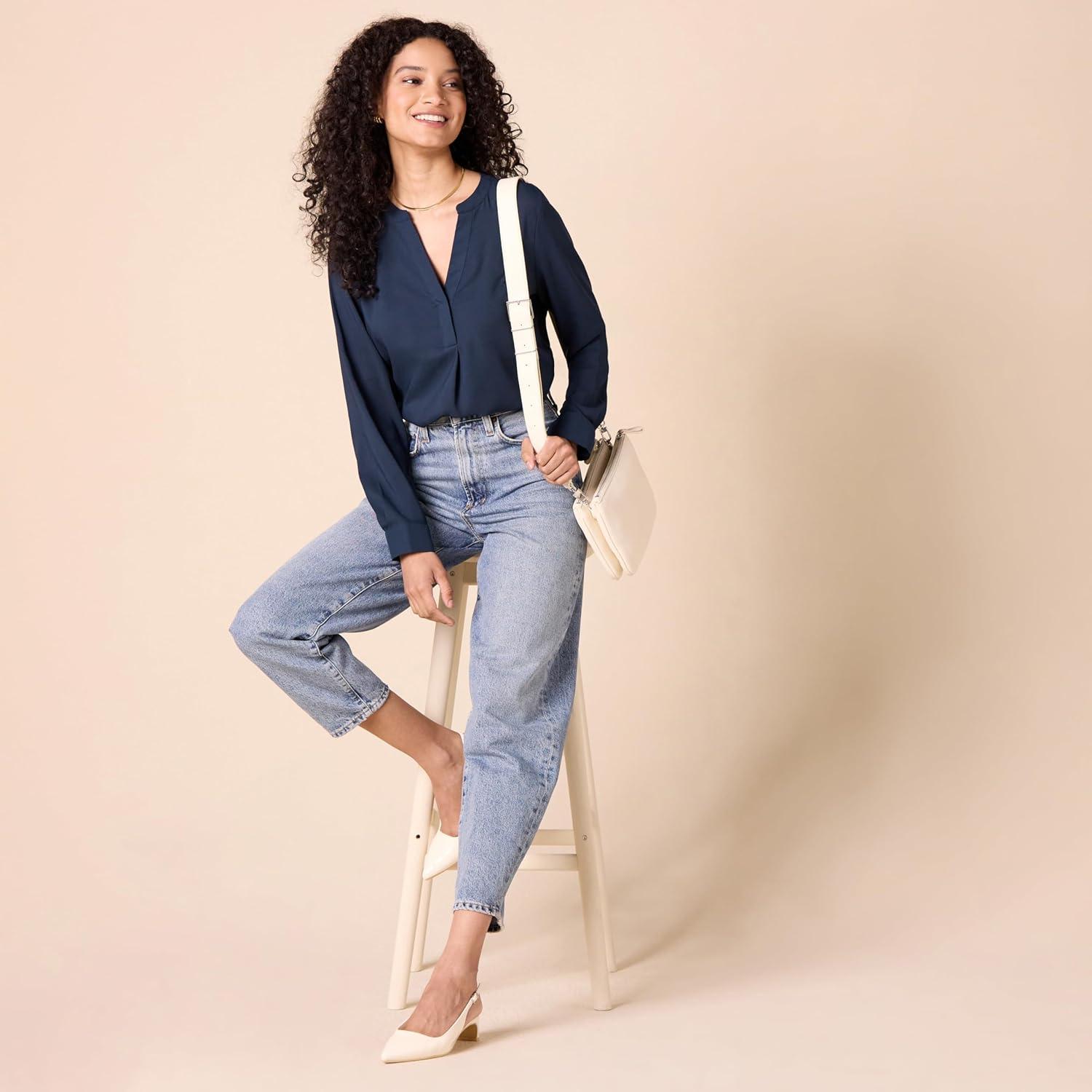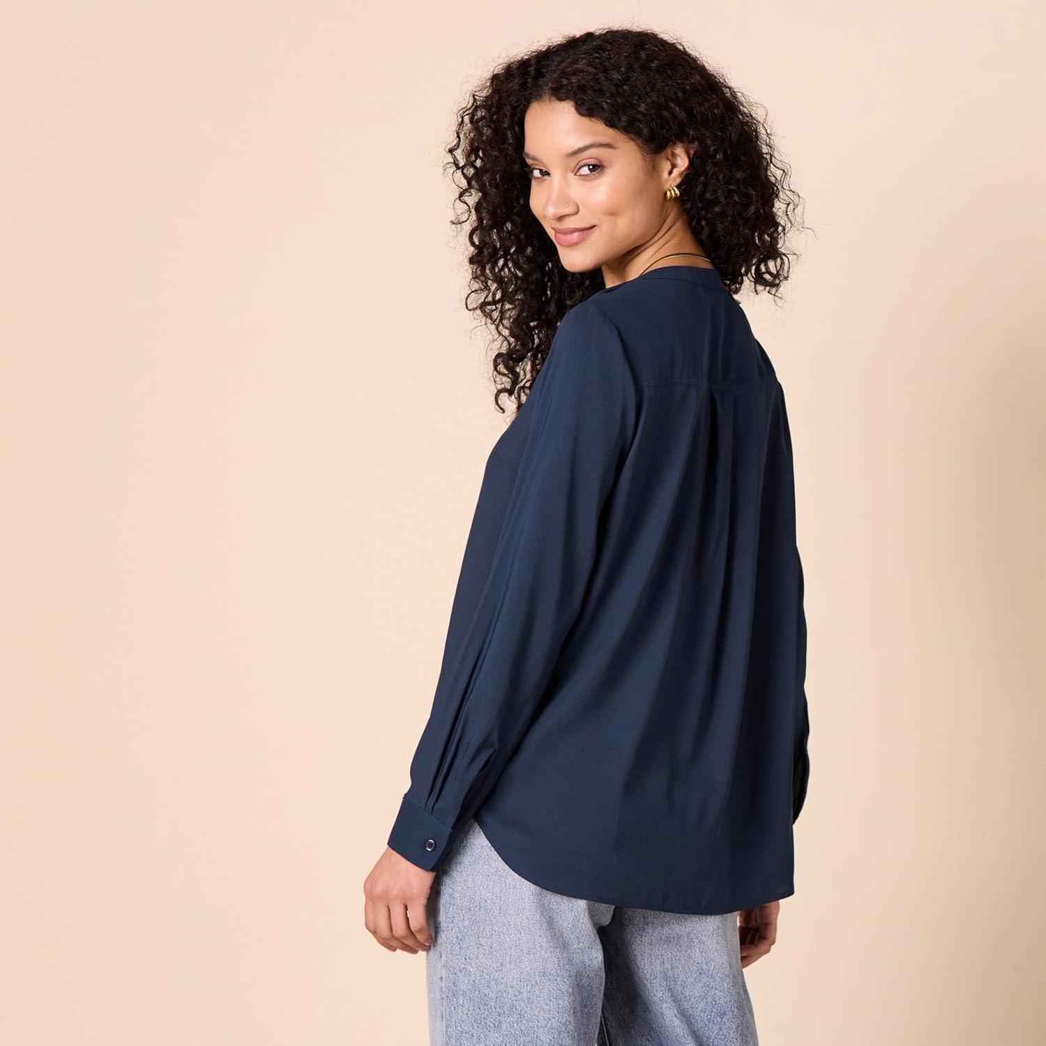 Amazon Essentials Women’s Georgette Long Sleeve Relaxed-Fit Popover Blouse(Navy)