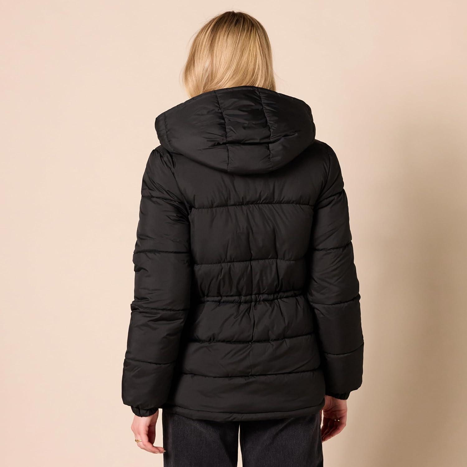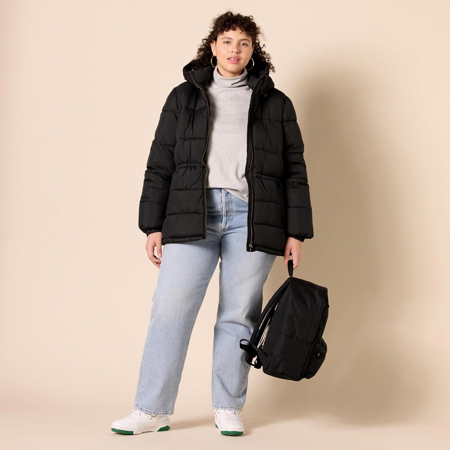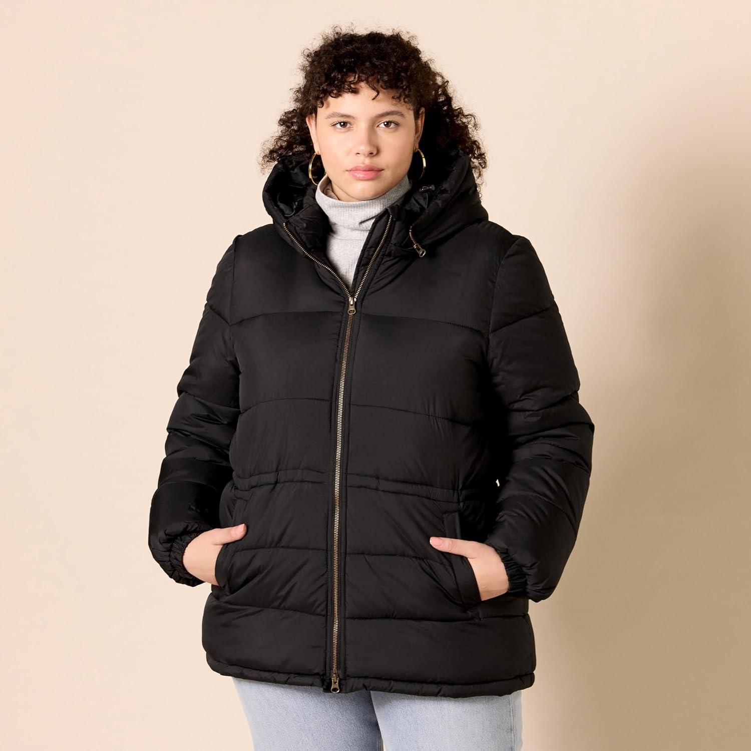 Amazon Essentials Women’s Heavyweight Quilted Hooded Puffer Winter Jacket with Adjustable Waist(Black)