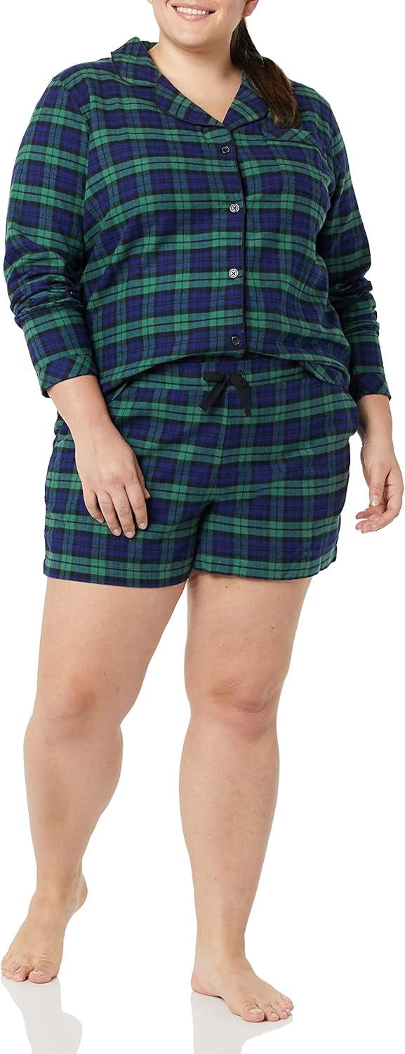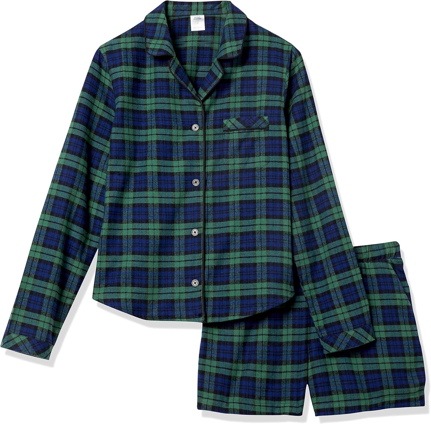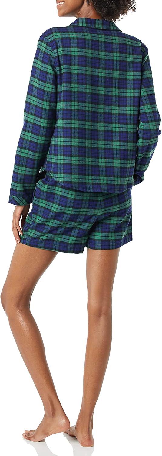 Amazon Essentials Women’s Lightweight Woven Flannel Pajama Set with Shorts(Dark Green Navy Blackwatch Plaid)
