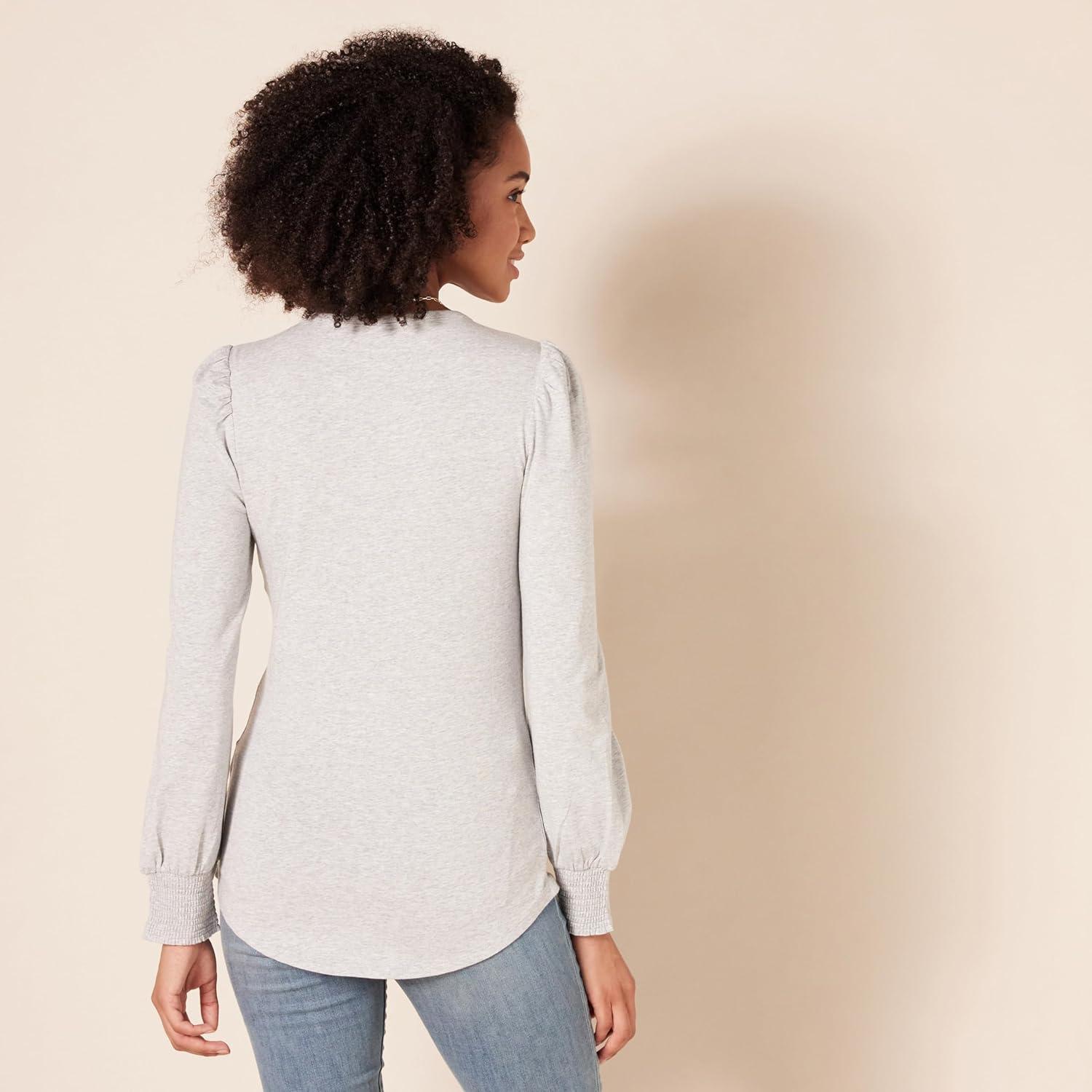 Amazon Essentials Women’s Long-Sleeve Crewneck Smocked Cuff T-Shirt(Grey Heather)