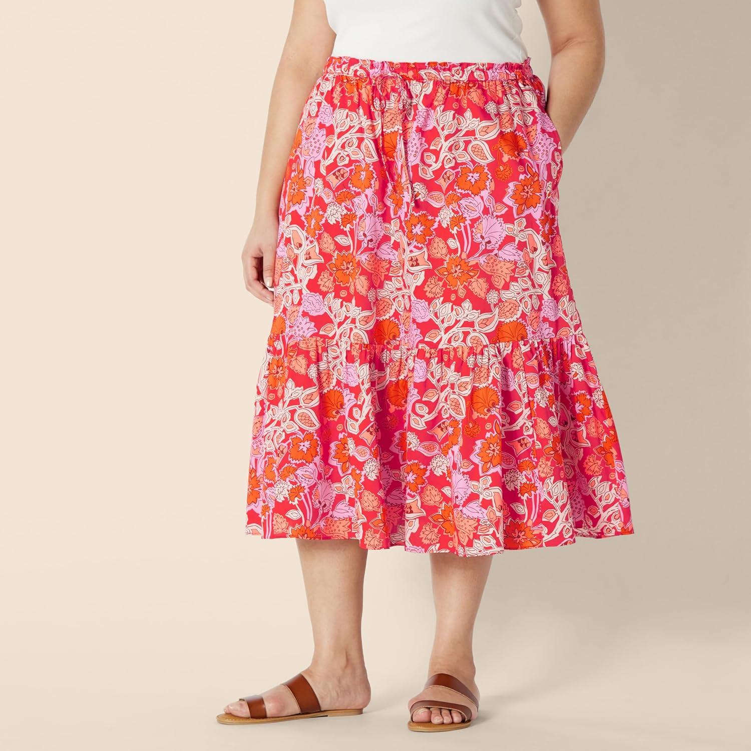 Amazon Essentials Women’s Mid-Rise A-line Cotton Sateen Tiered Midi Skirt (Top Sold Separately)(Bright Poppy Red Multi Folk Floral)