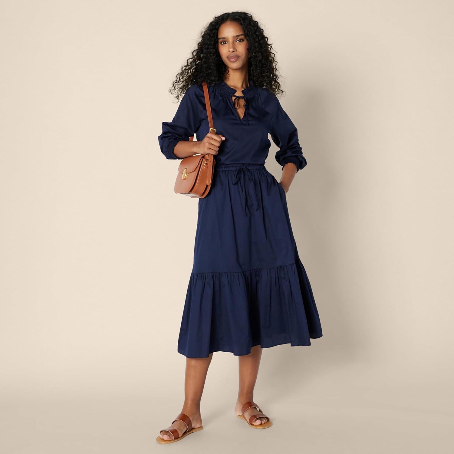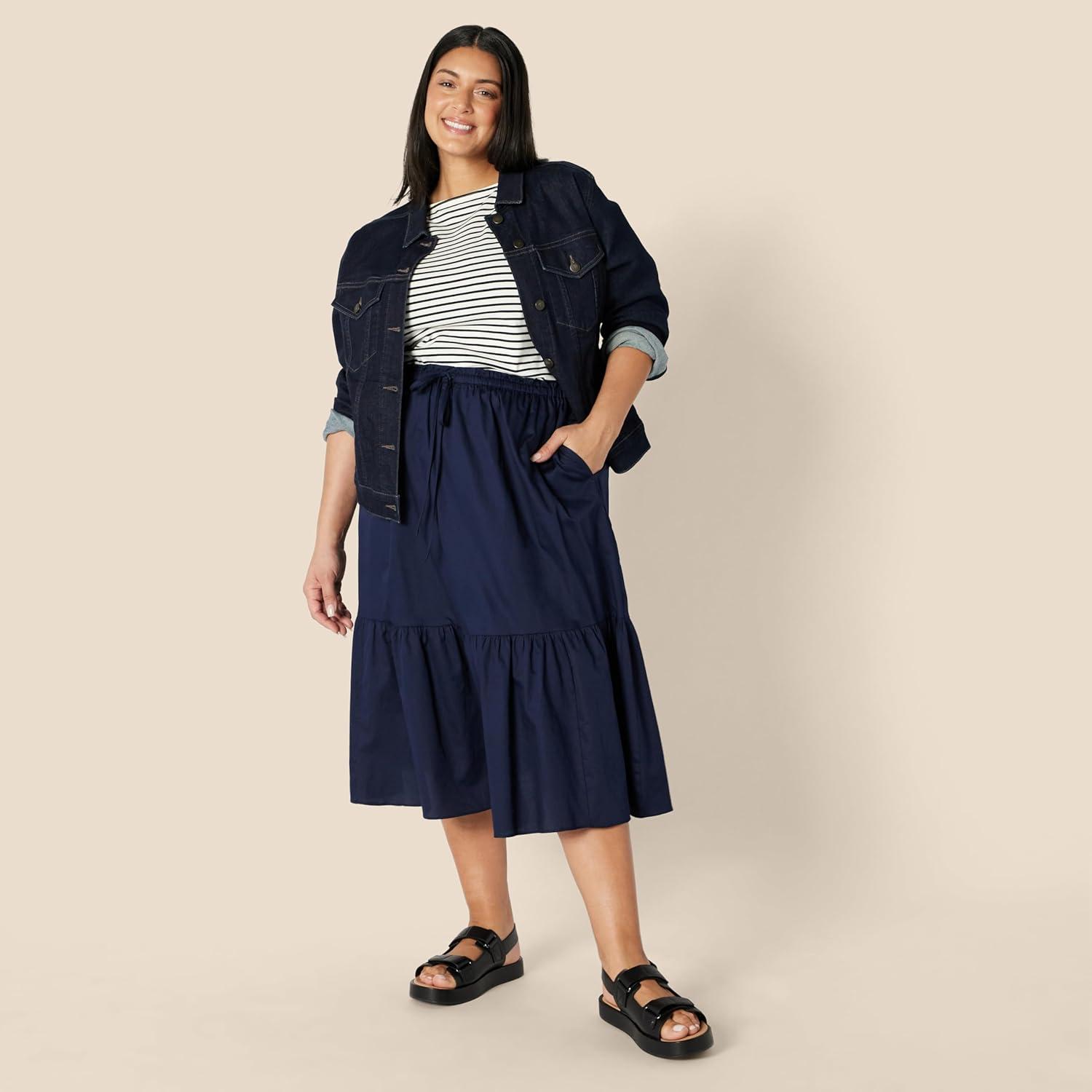 Amazon Essentials Women’s Mid-Rise A-line Cotton Sateen Tiered Midi Skirt (Top Sold Separately)(Navy)