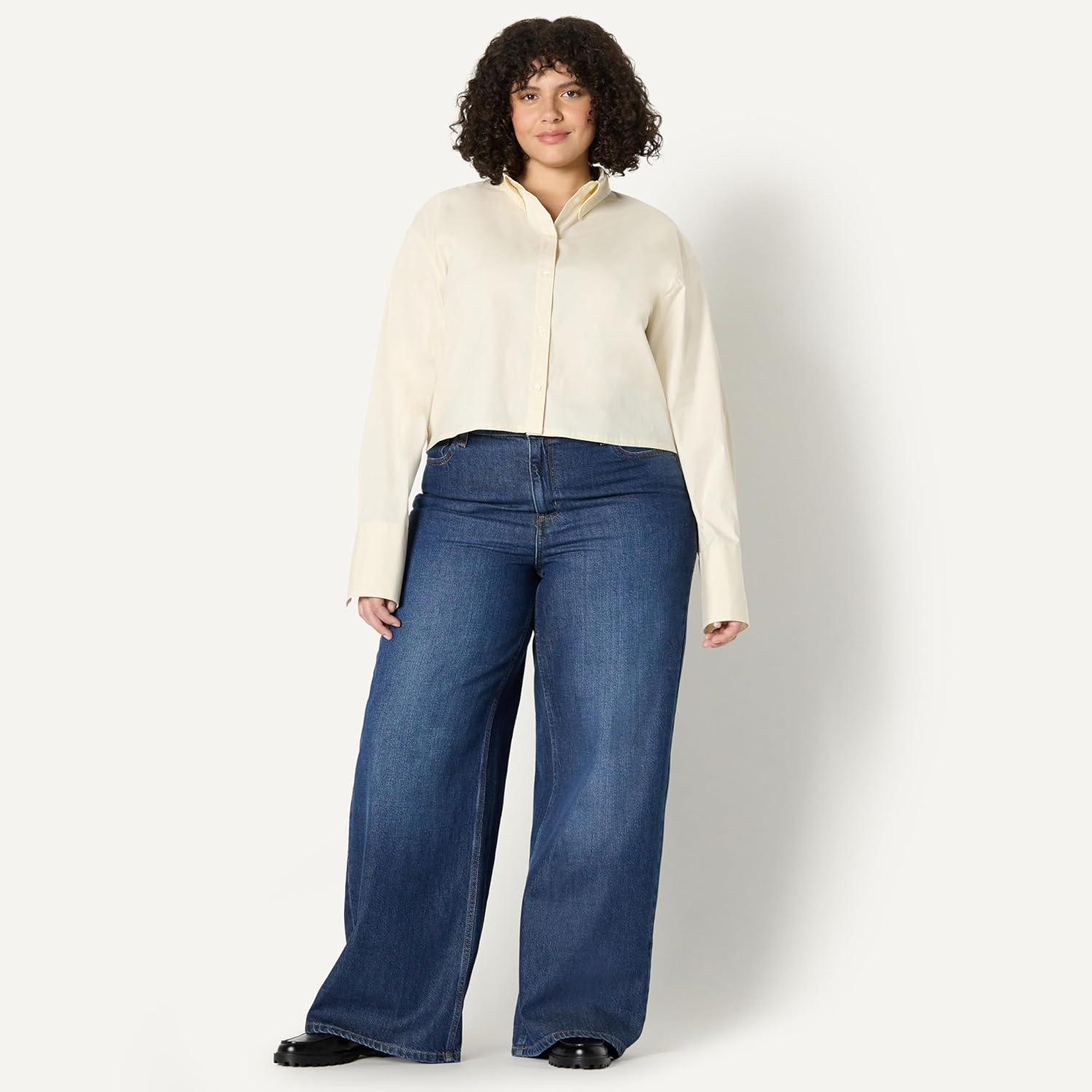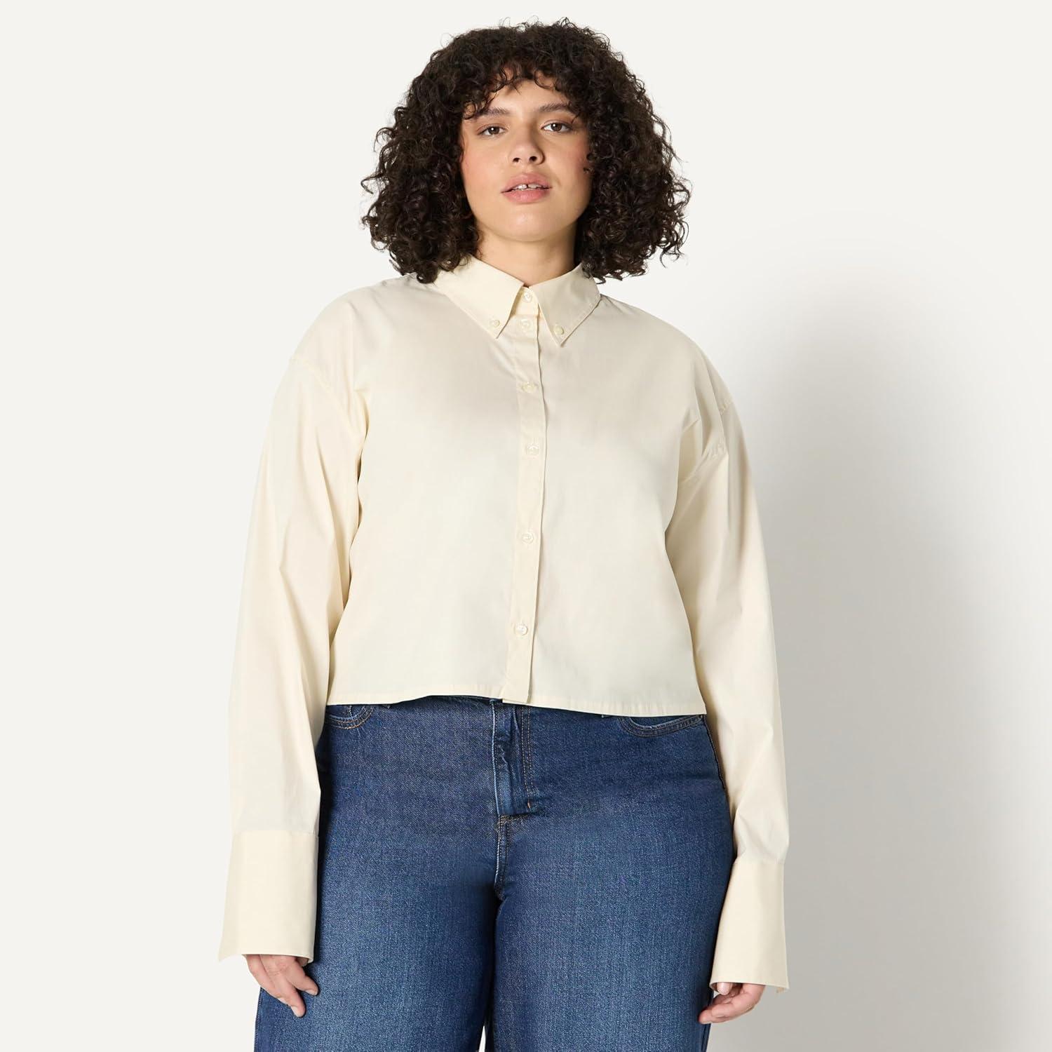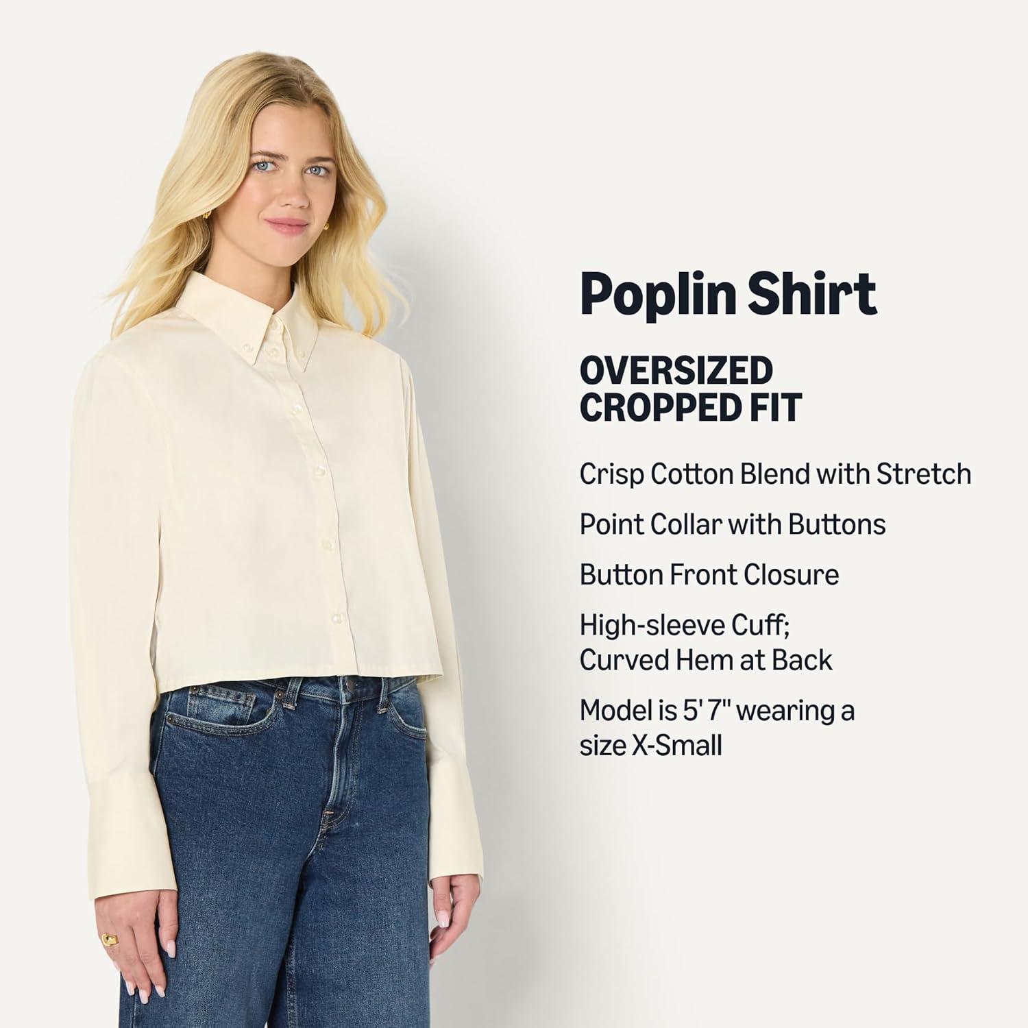 Amazon Essentials Women’s Modern Oversized-Fit Cropped Cotton Stretch Poplin Button-Down Shirt(Cream)