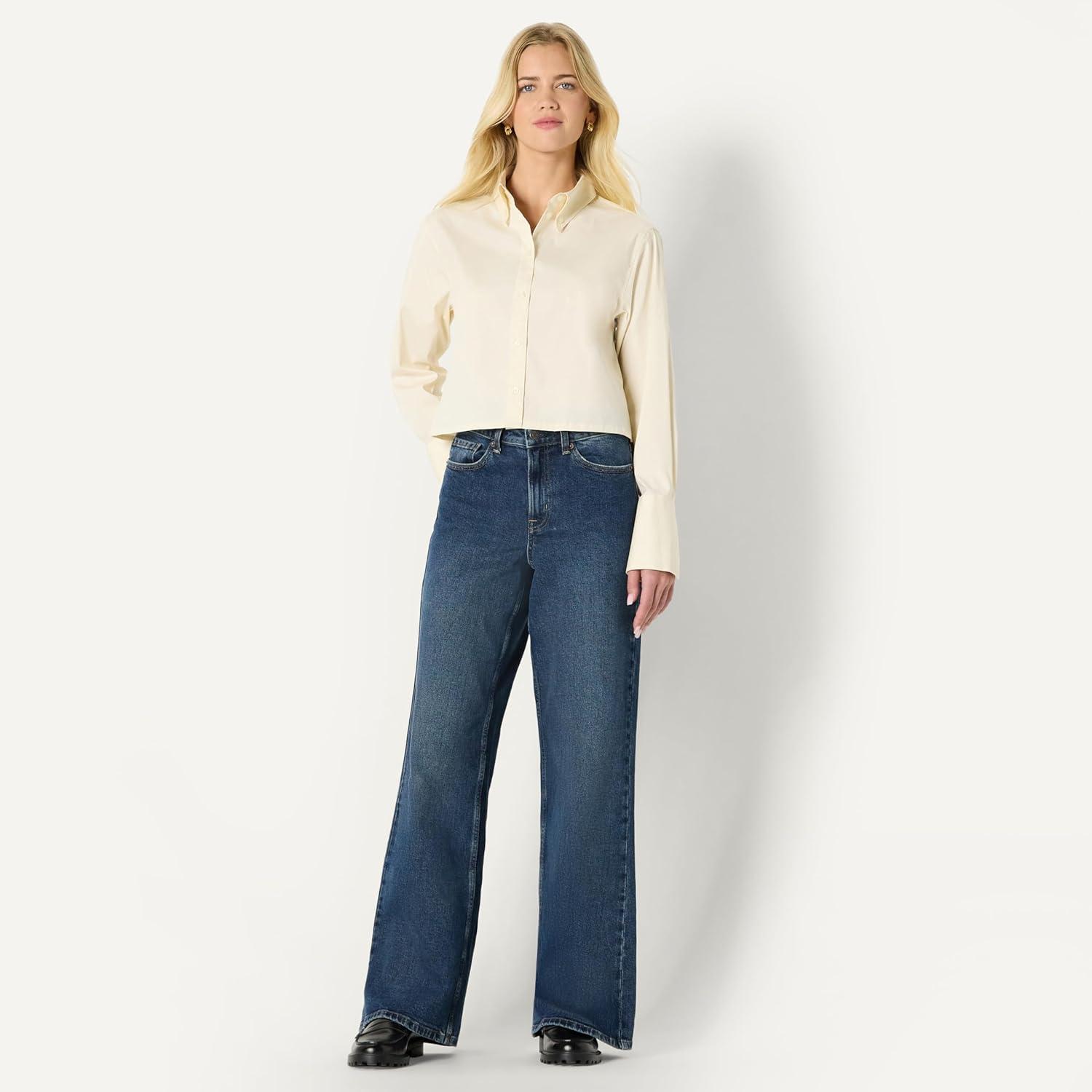 Amazon Essentials Women’s Modern Oversized-Fit Cropped Cotton Stretch Poplin Button-Down Shirt(Blue)