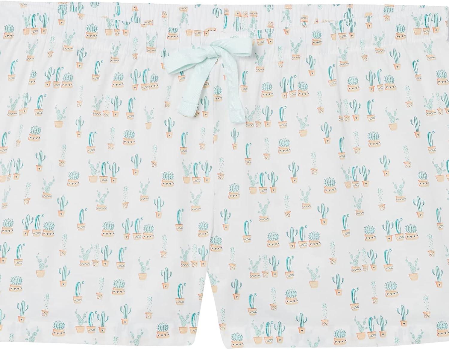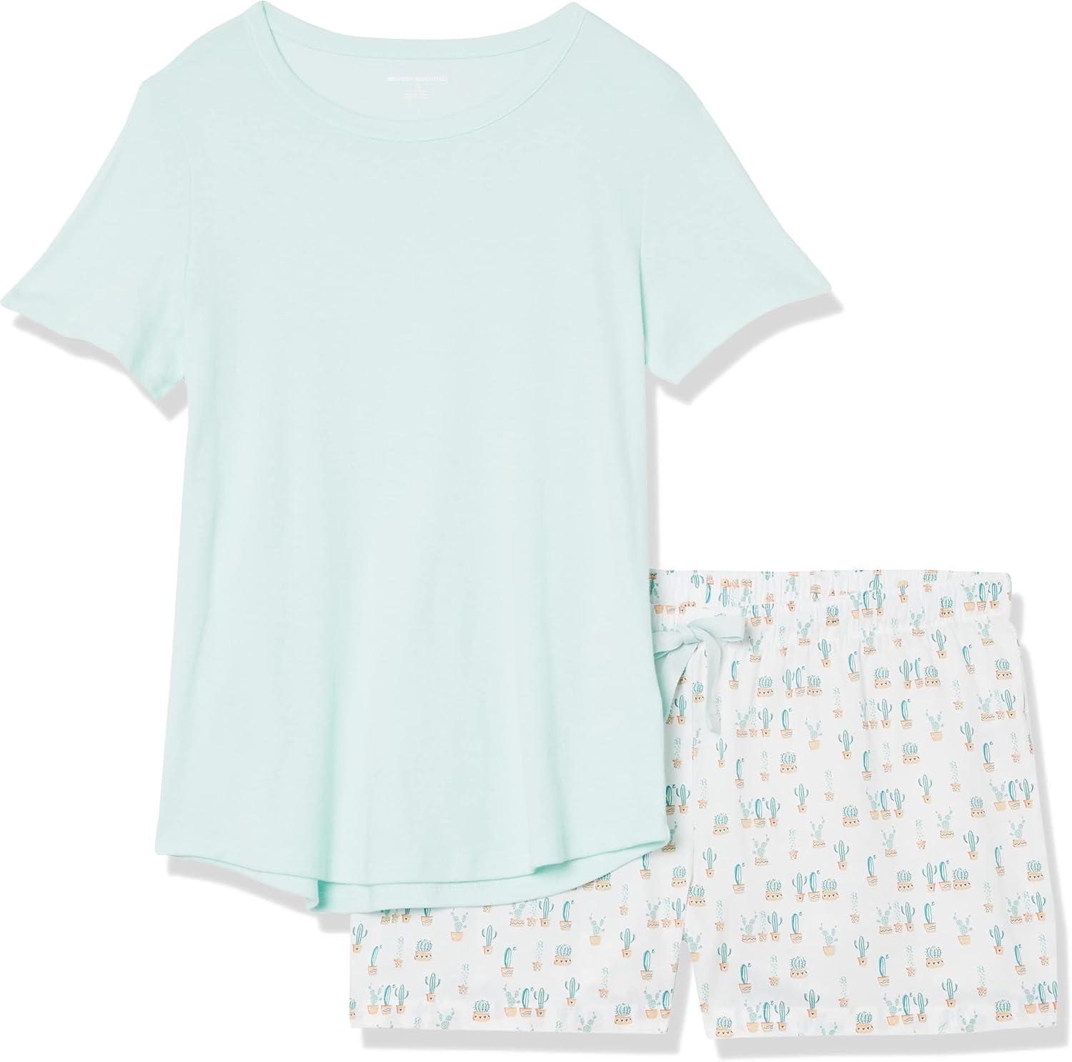 Amazon Essentials Women's Poplin Short and Sleep Tee Set(Mint Green White Cactus)