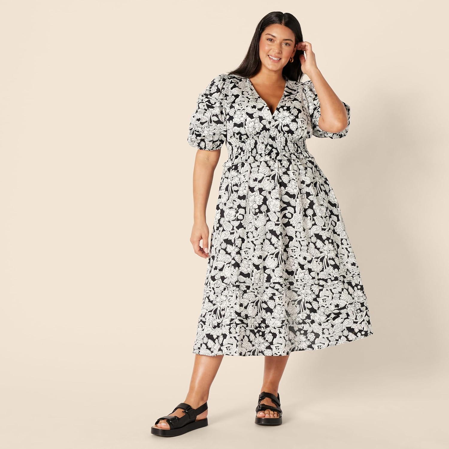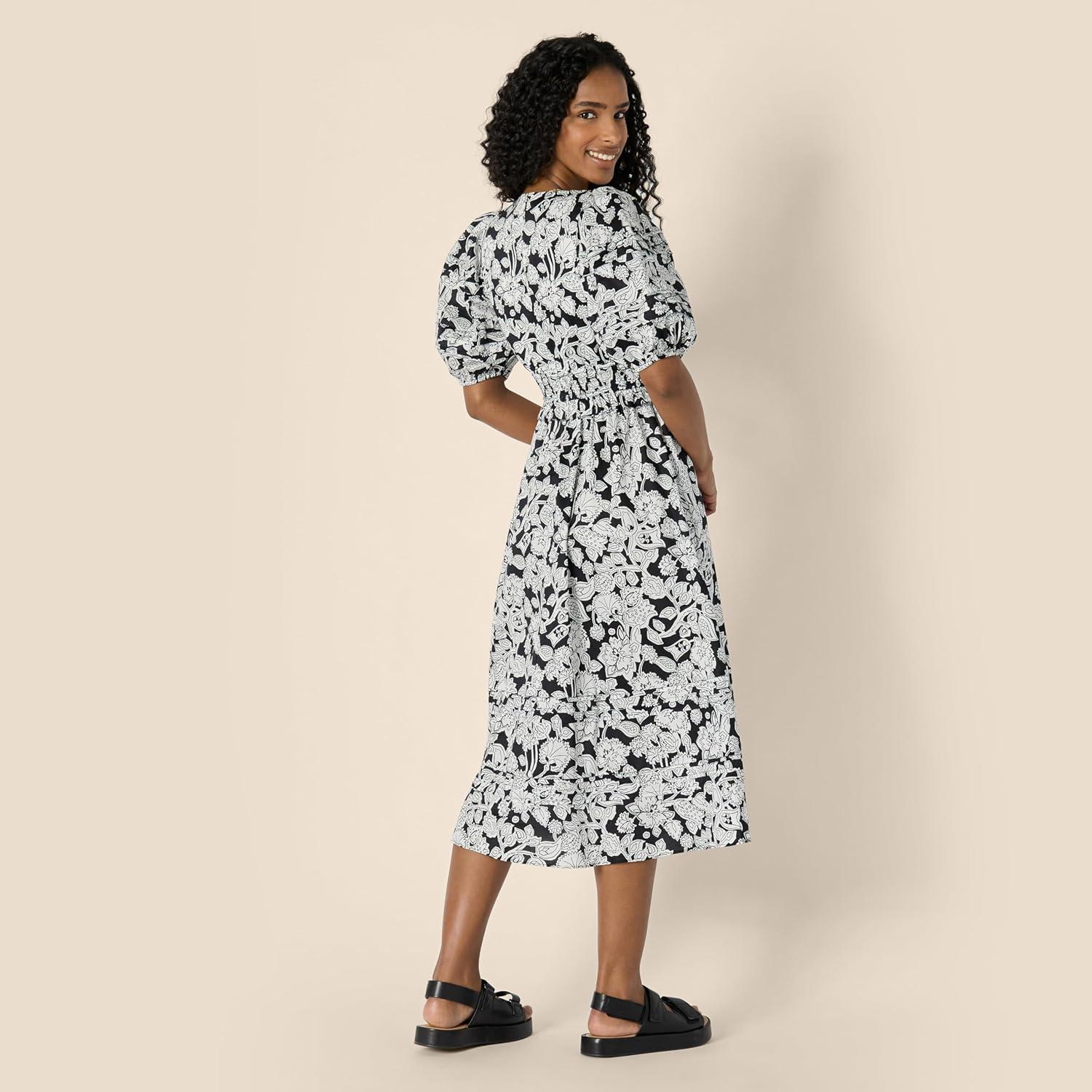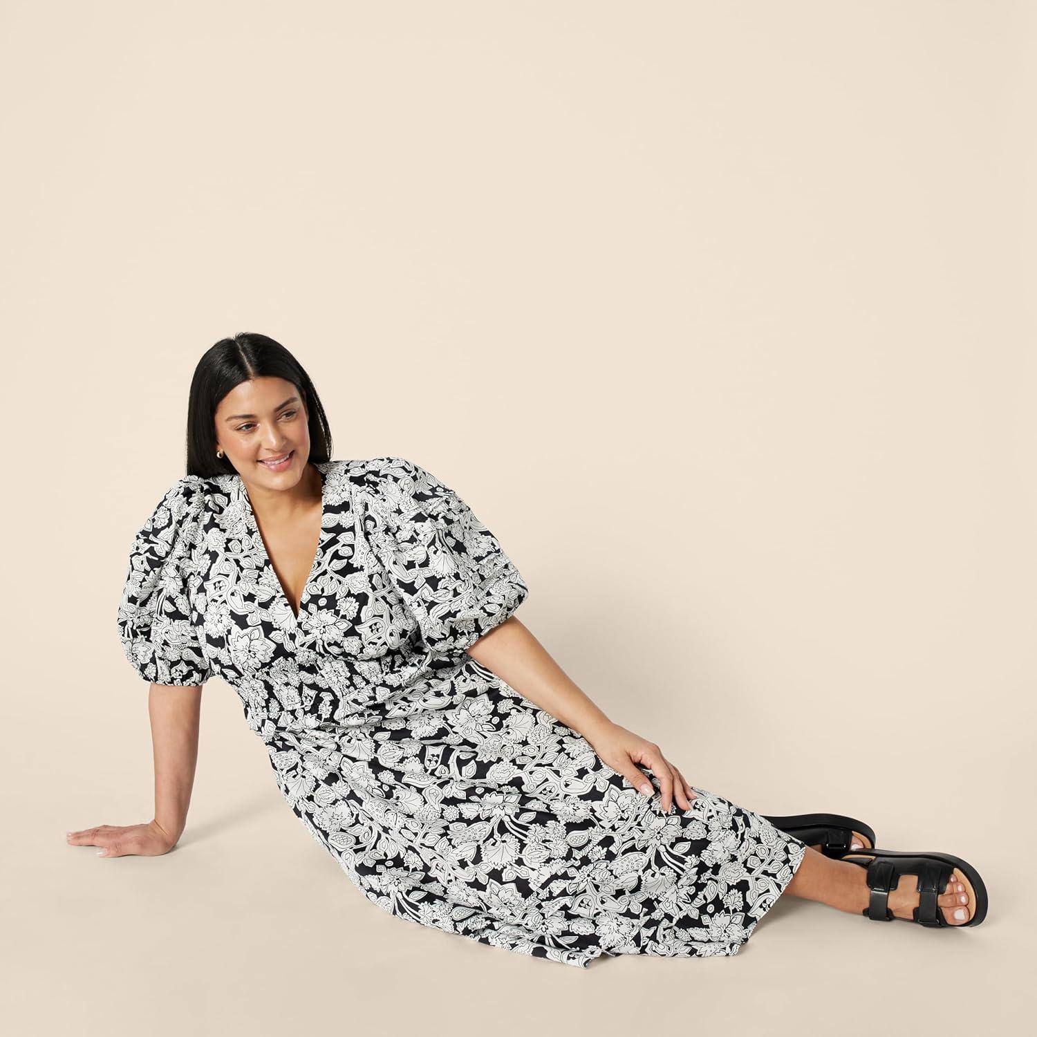 Amazon Essentials Women’s Regular-Fit Cotton Sateen Puff Sleeve Midi Dress(Black Ivory Folk Floral)