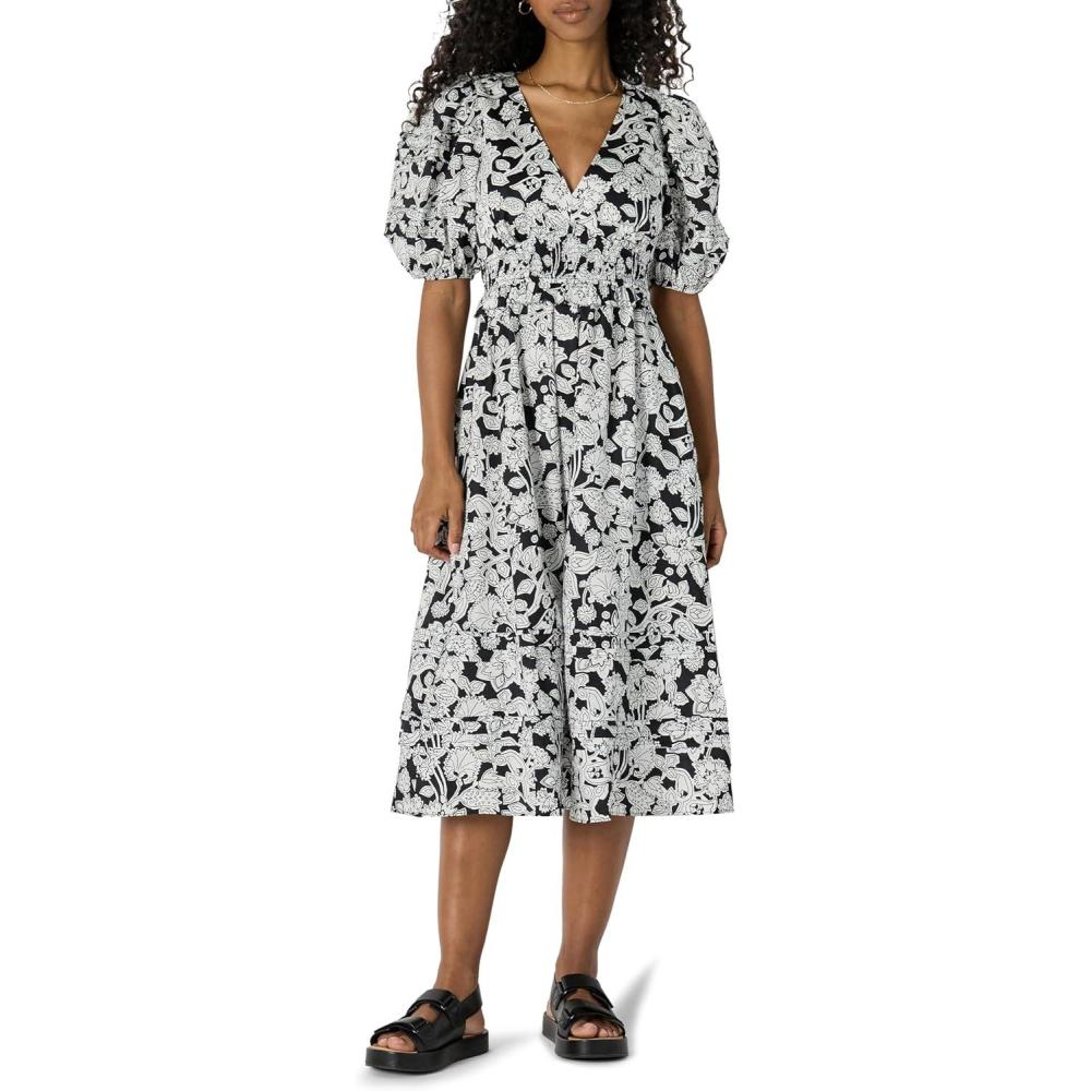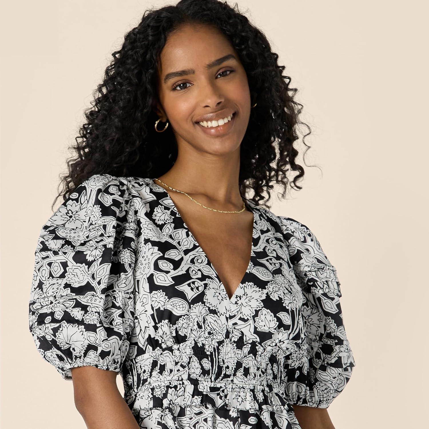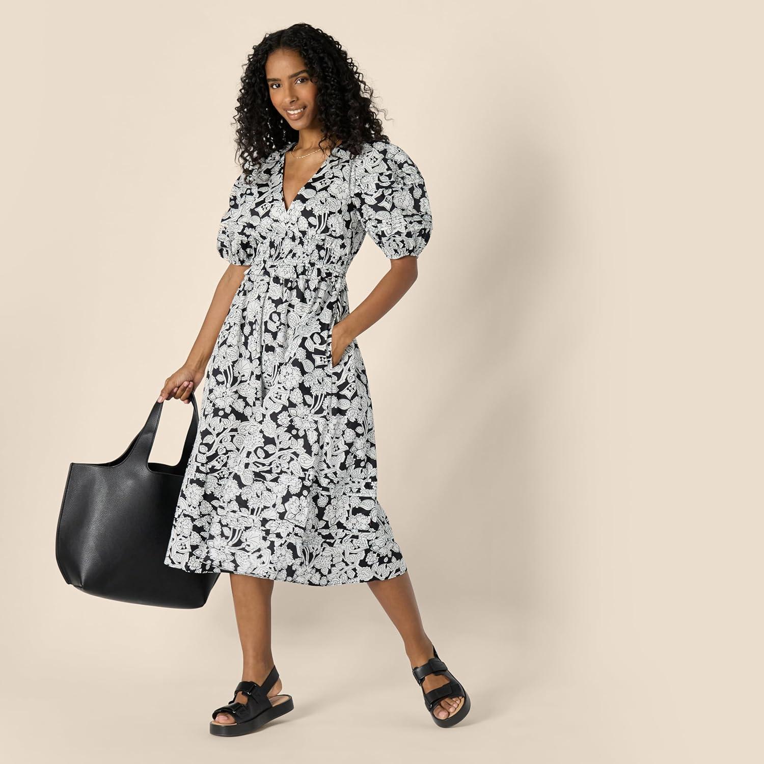 Amazon Essentials Women’s Regular-Fit Cotton Sateen Puff Sleeve Midi Dress(Black Ivory Folk Floral)