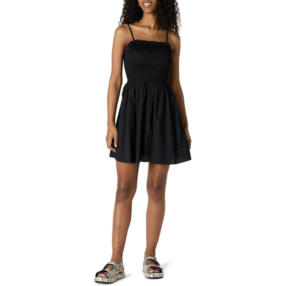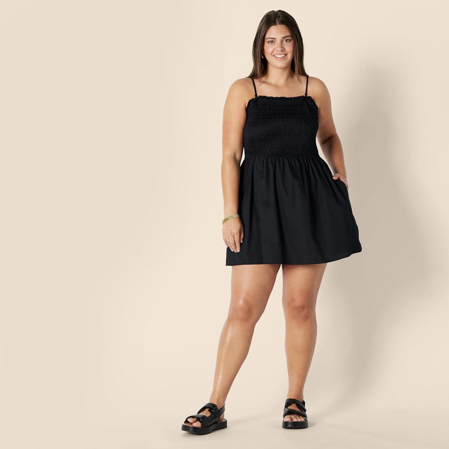 Amazon Essentials Women’s Regular-Fit Cotton Sateen Smocked Bodice Short Dress(Black)