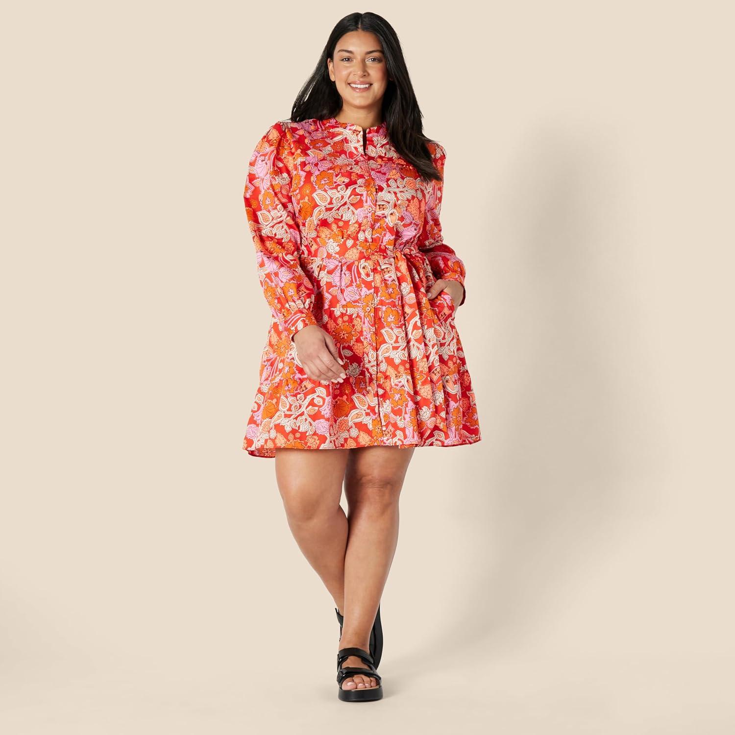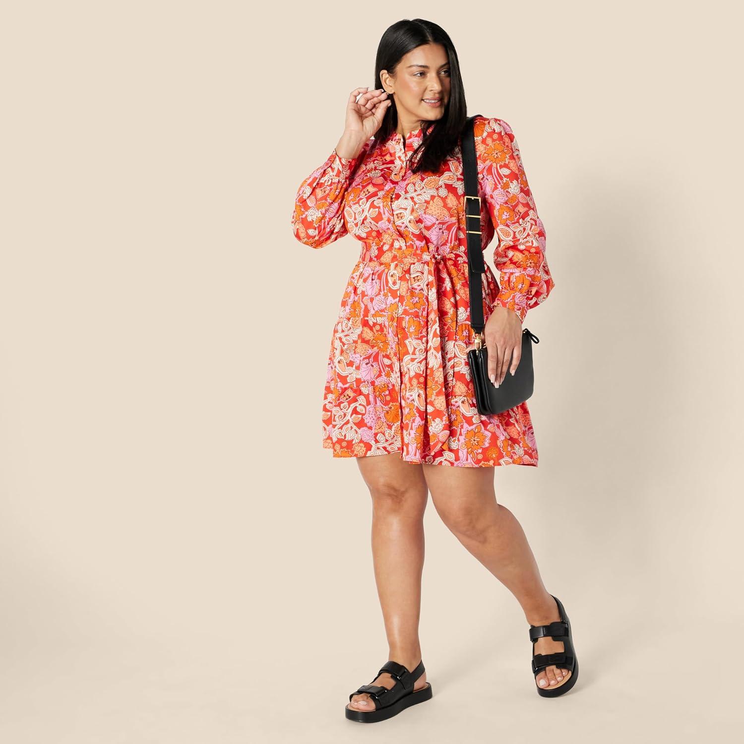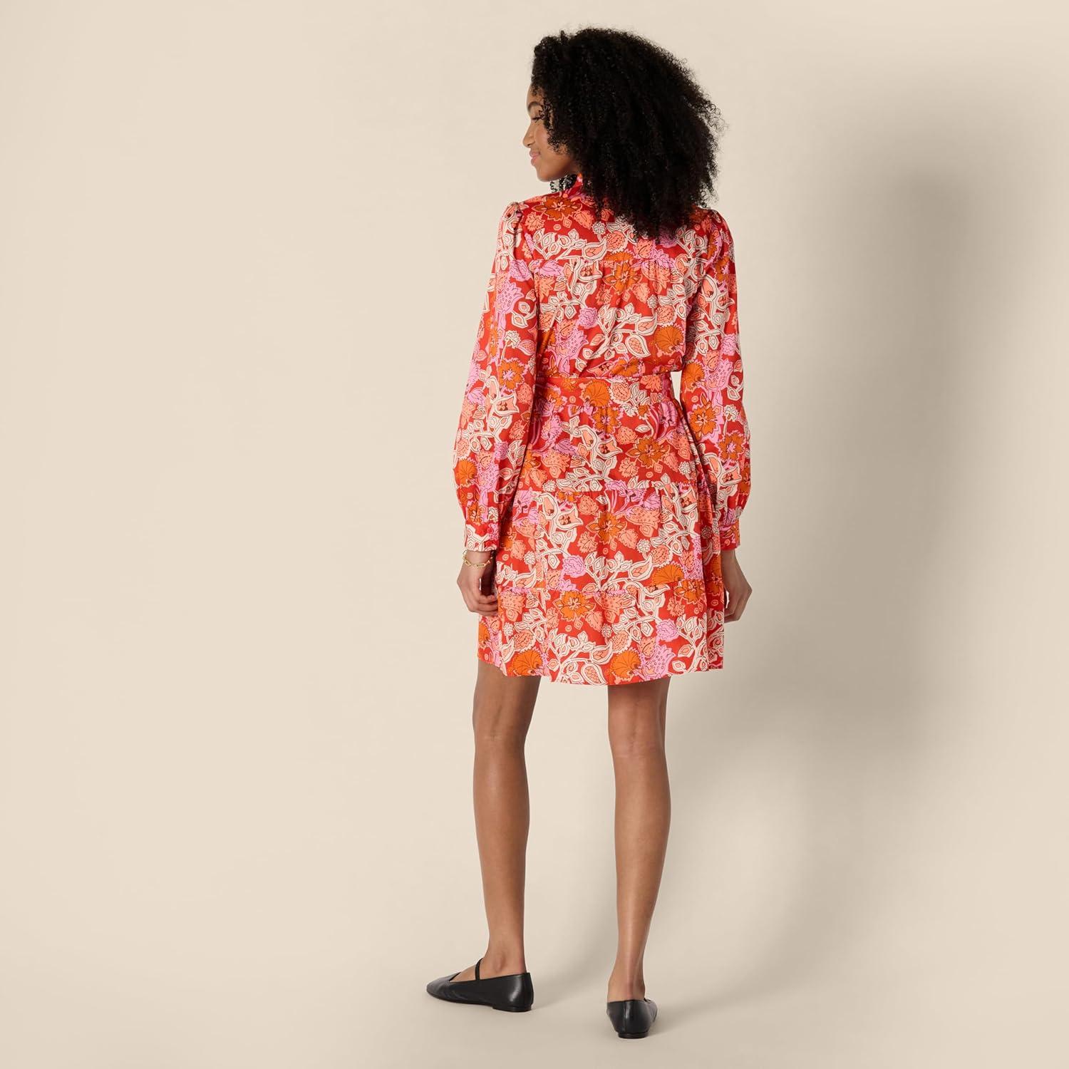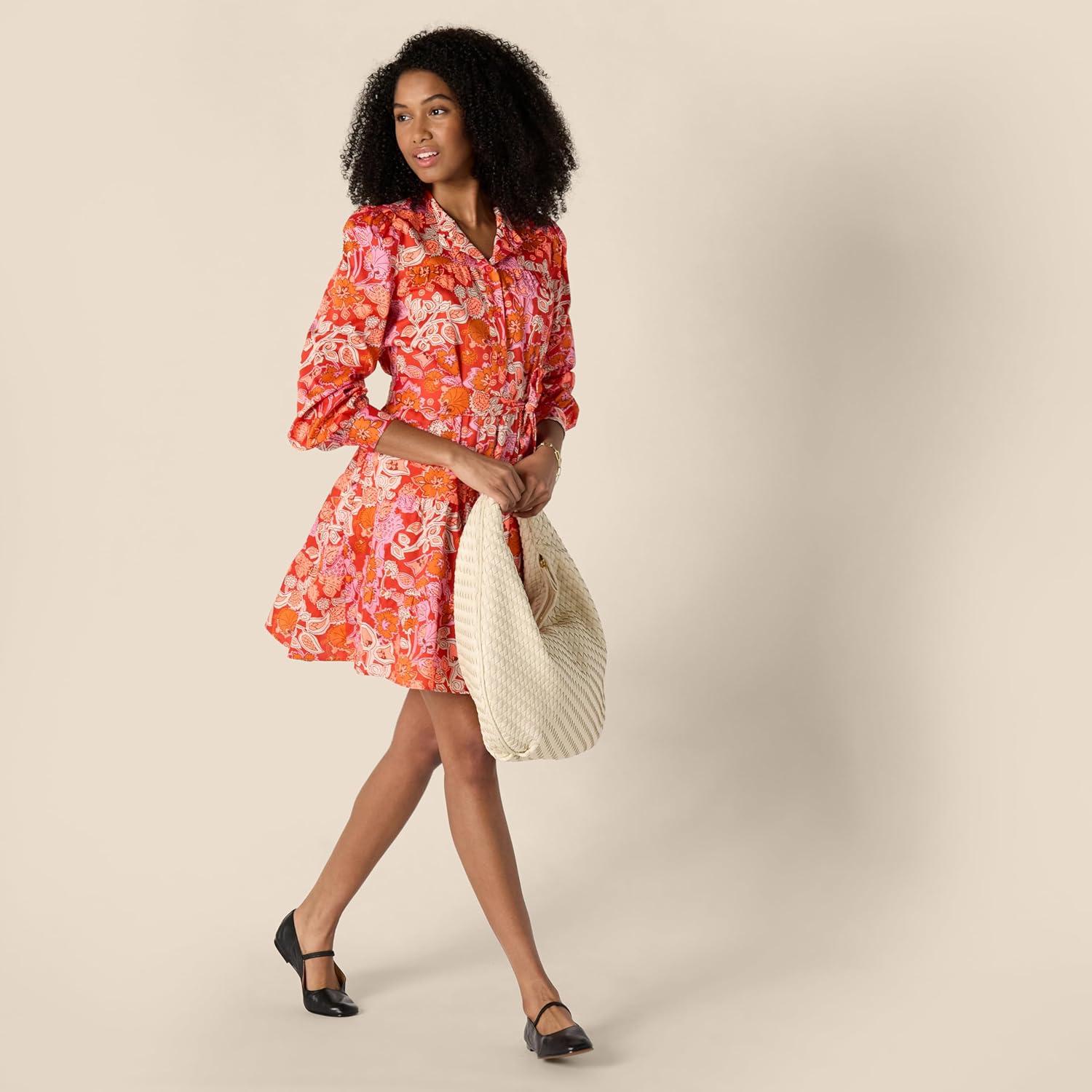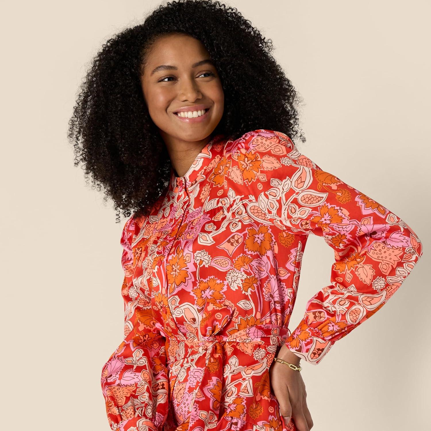 Amazon Essentials Women’s Regular-Fit Cotton Sateen Tiered Shirt Dress(Bright Poppy Red Blush Multi Folk Floral)