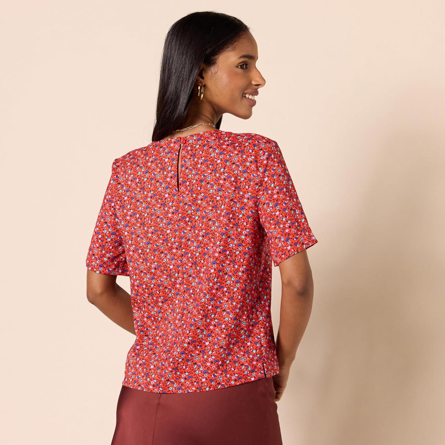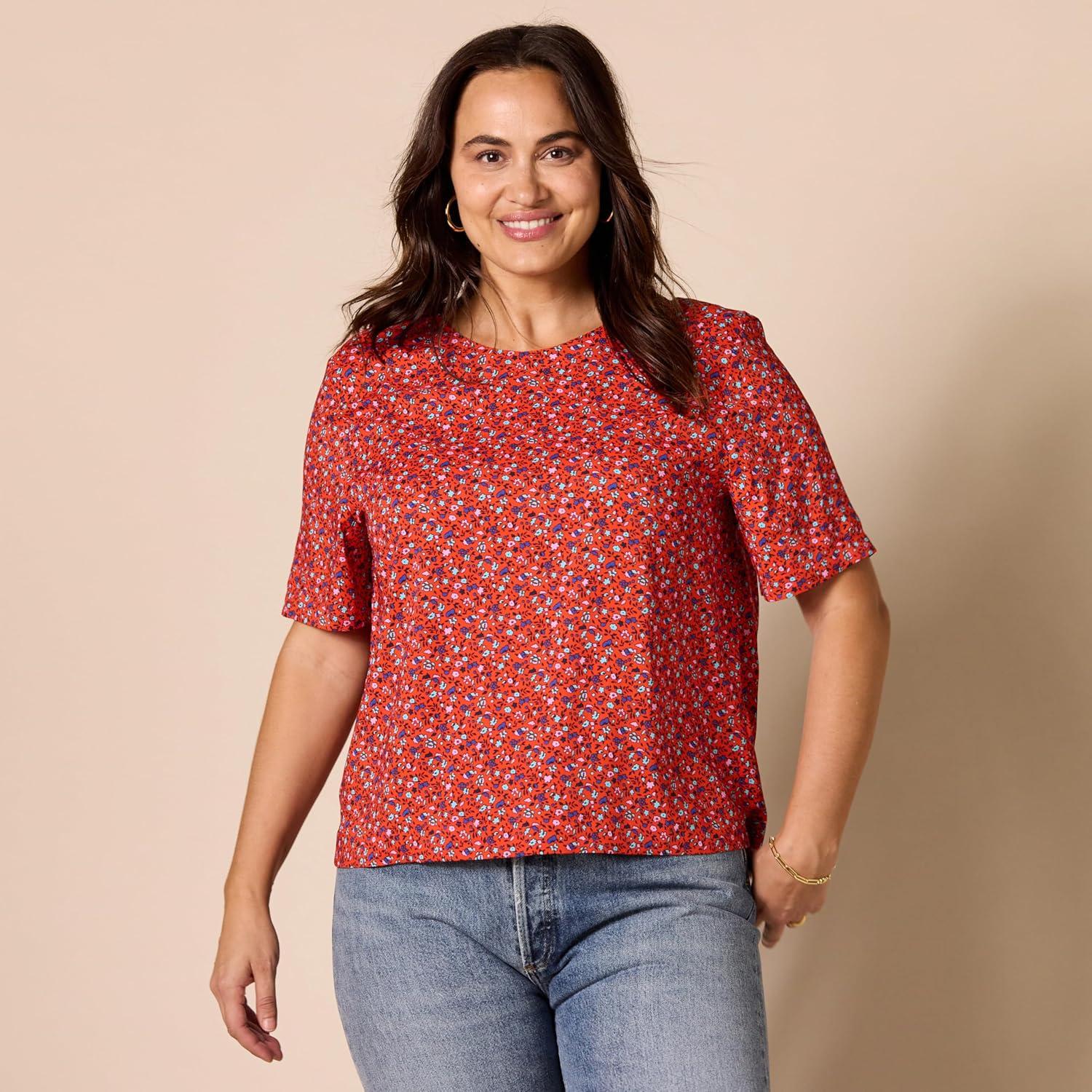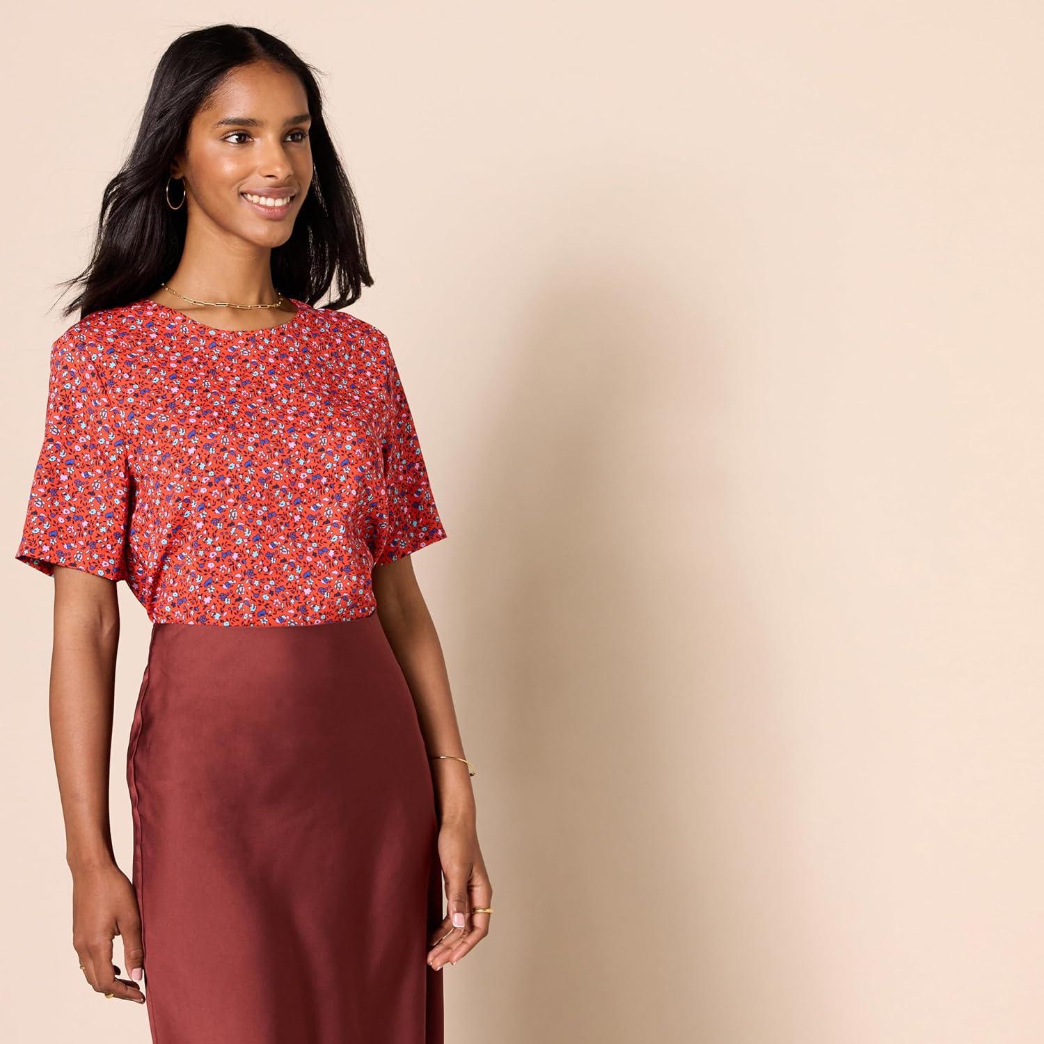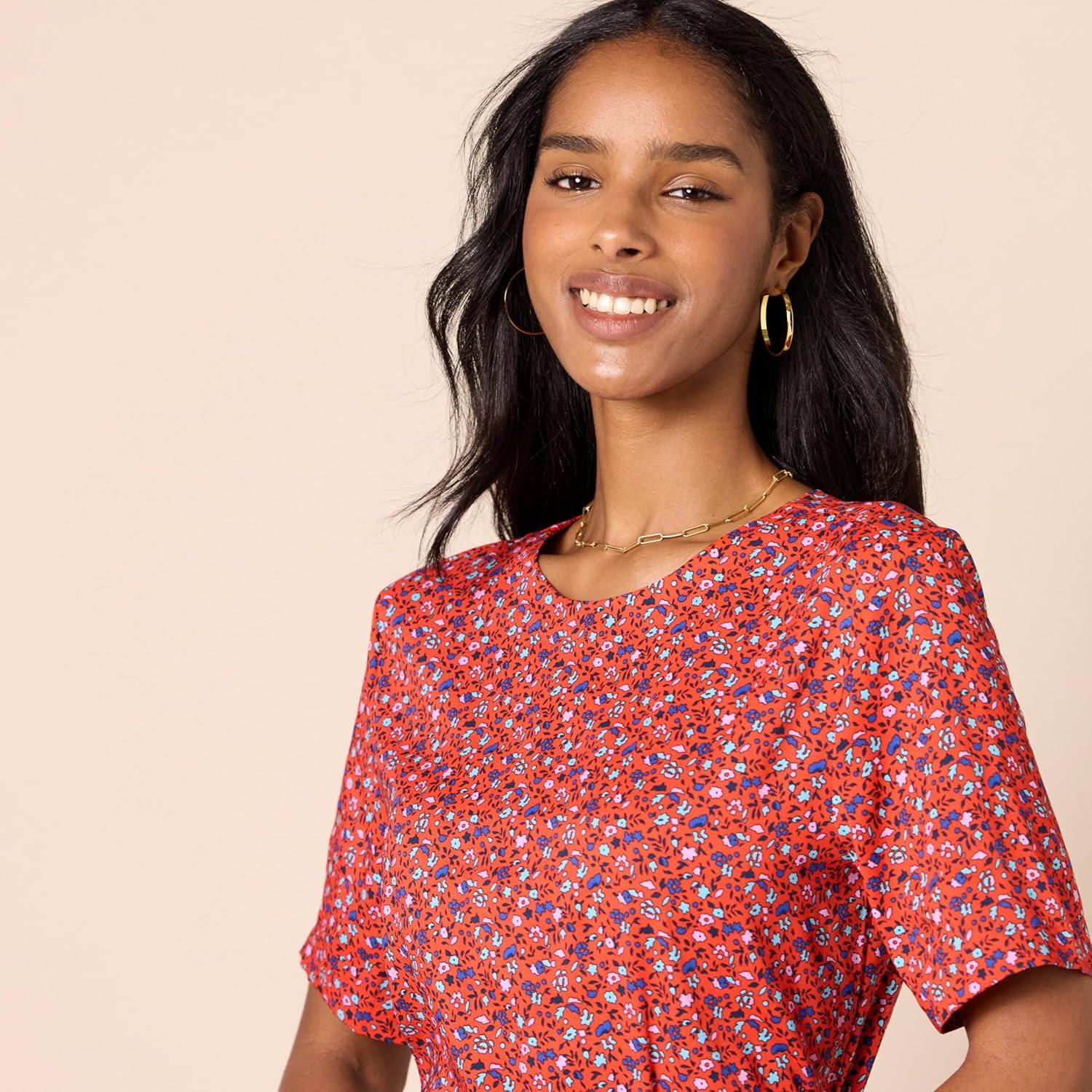 Amazon Essentials Women’s Regular-Fit Georgette Short Sleeve Top(Tomato Red Ditsy Floral)