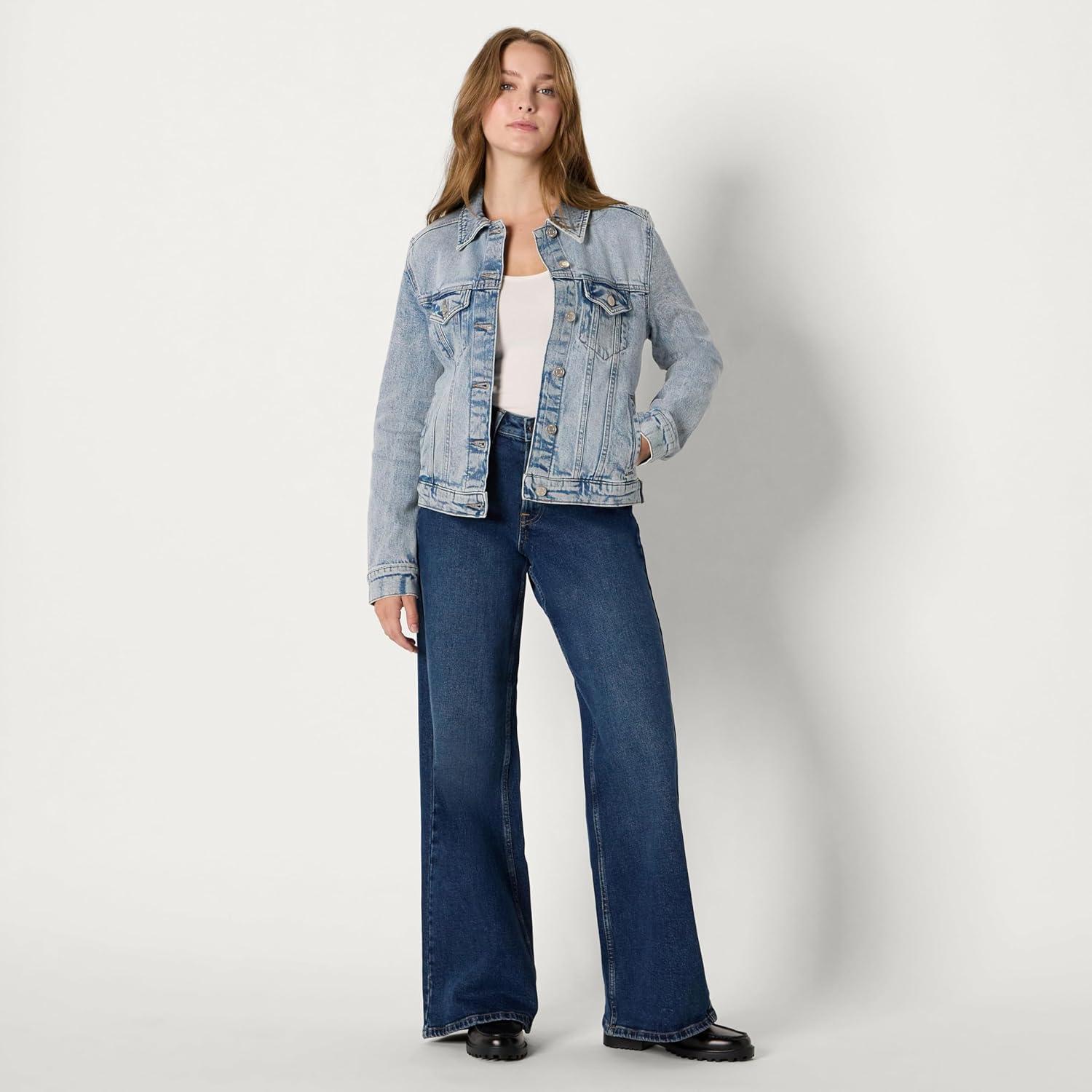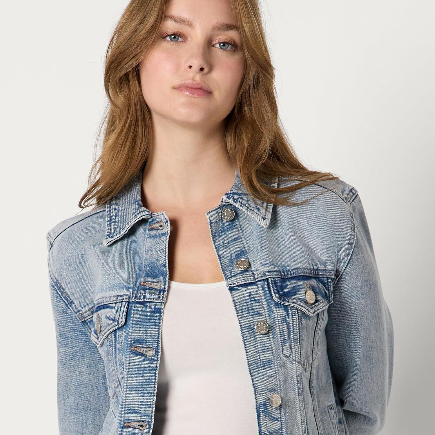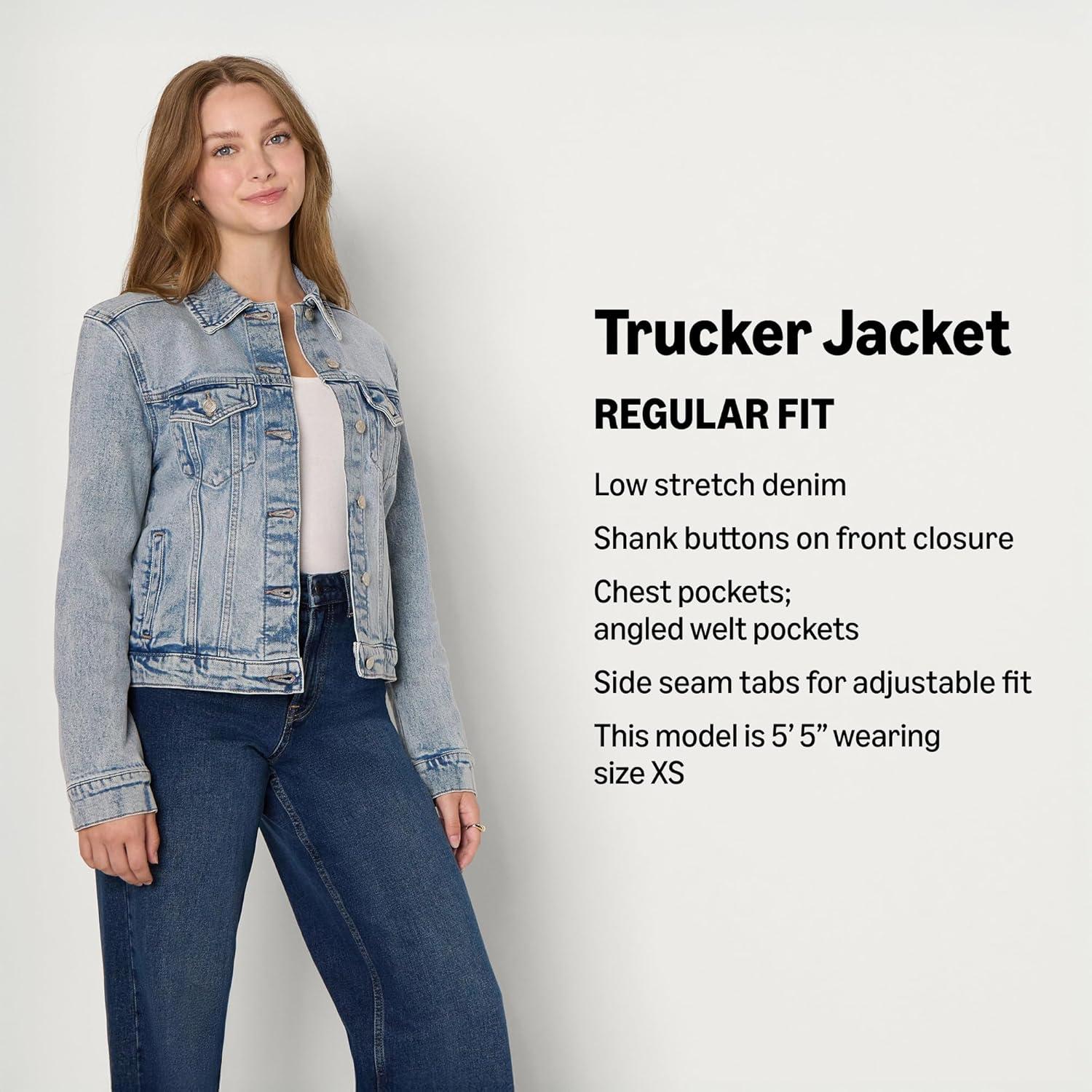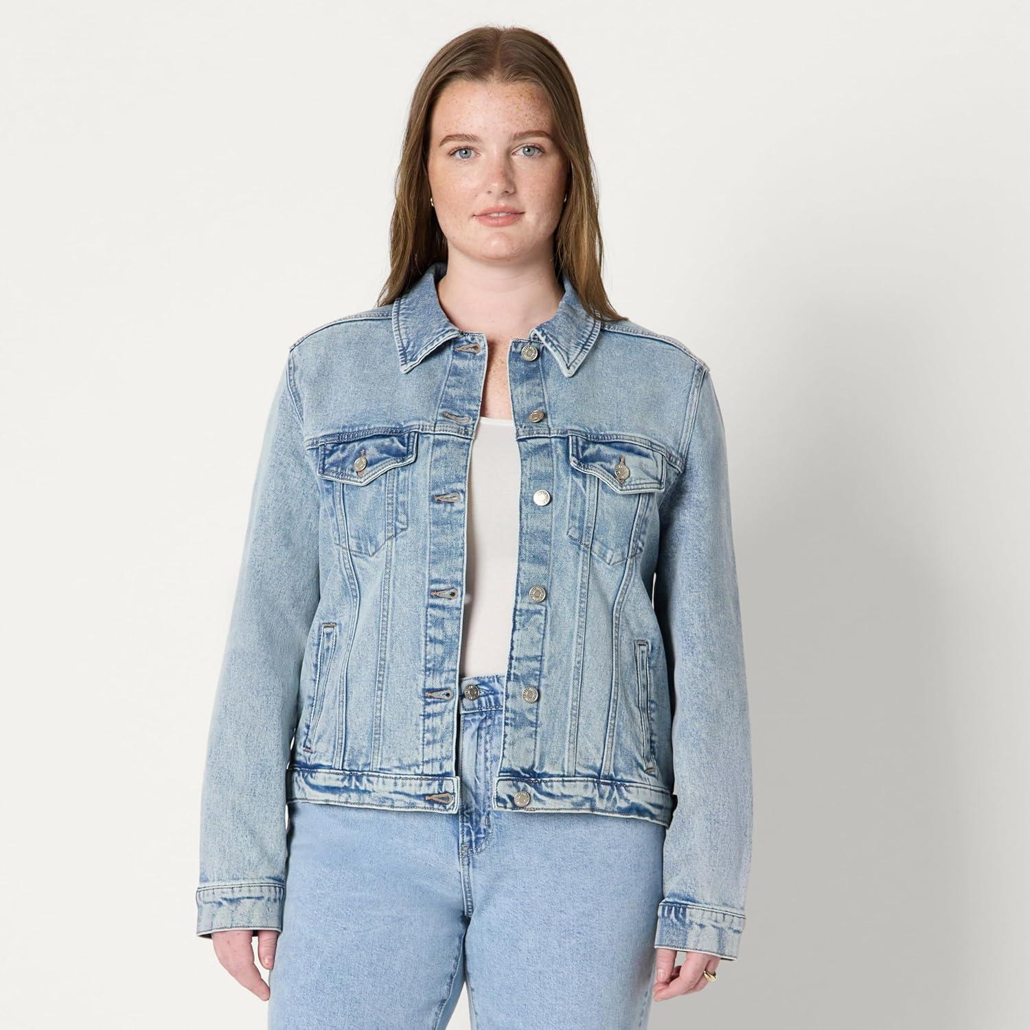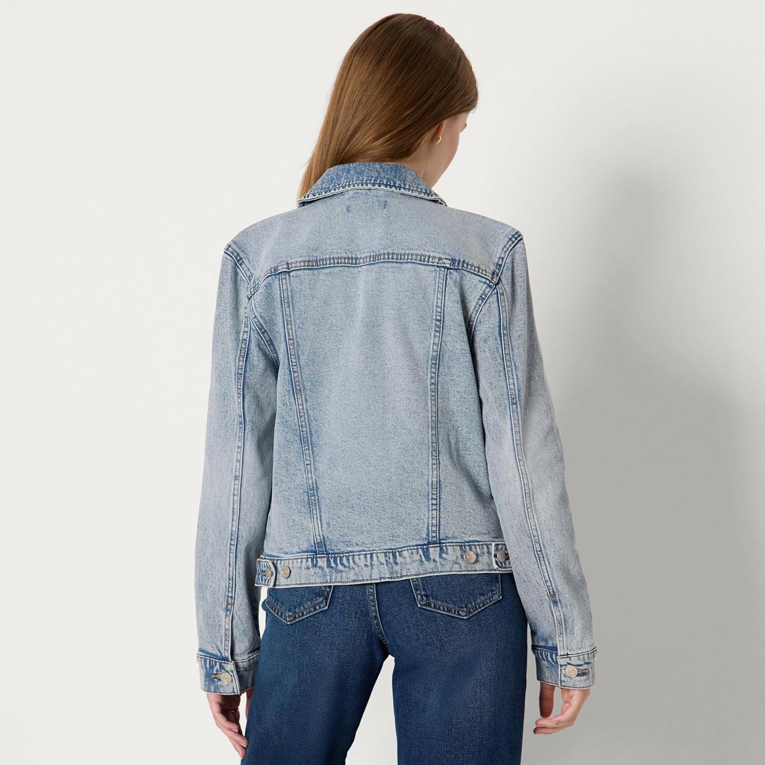 Amazon Essentials Women’s Regular-Fit Low Stretch Denim Button-Front Trucker Jacket(Iced Light Wash)