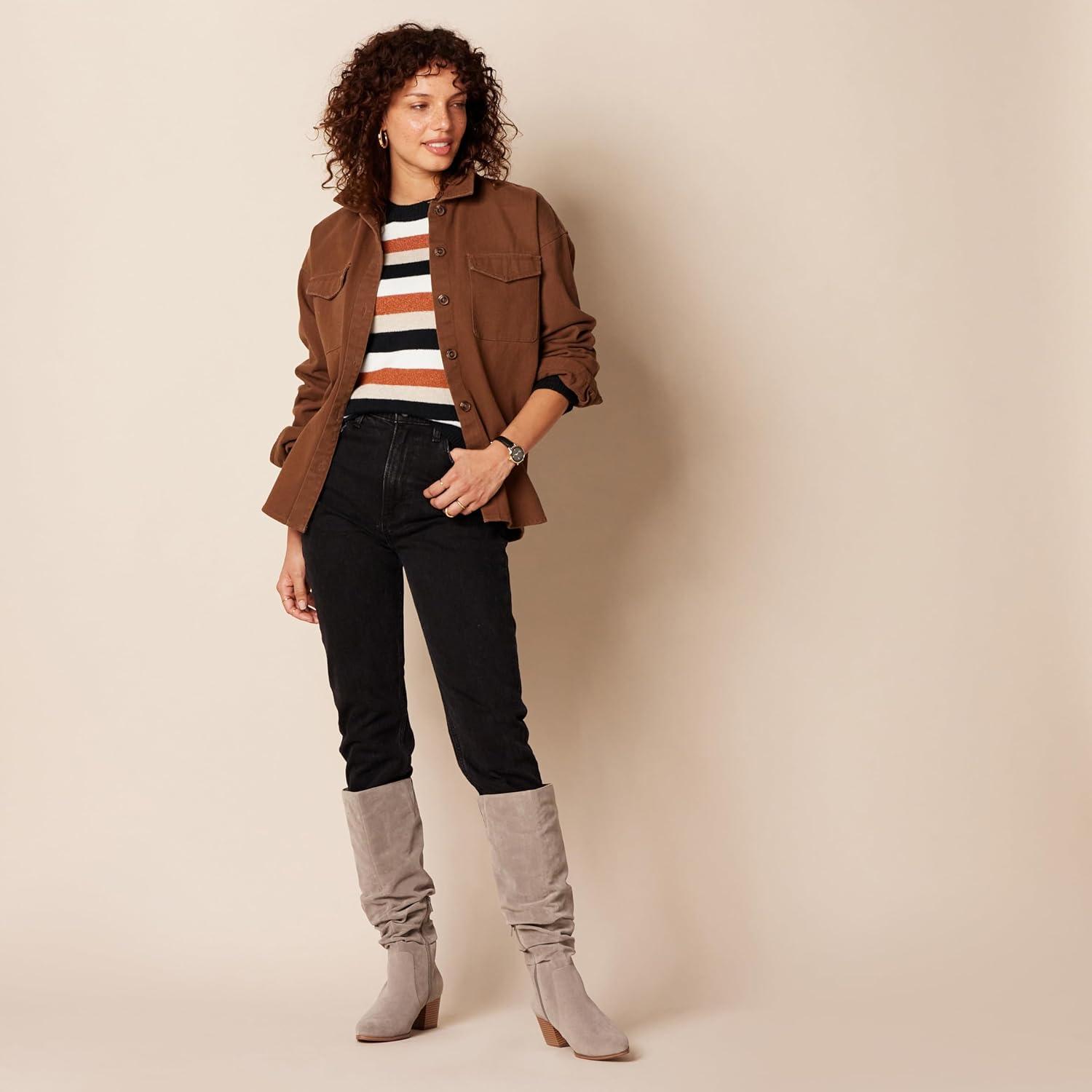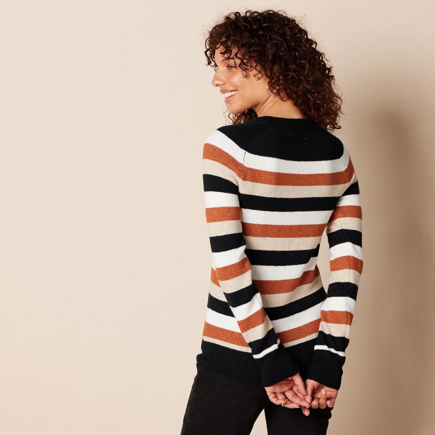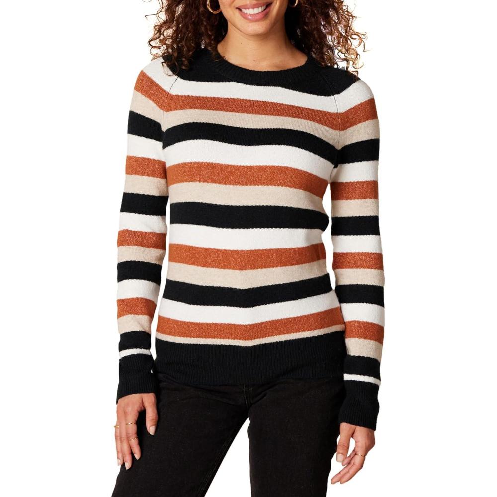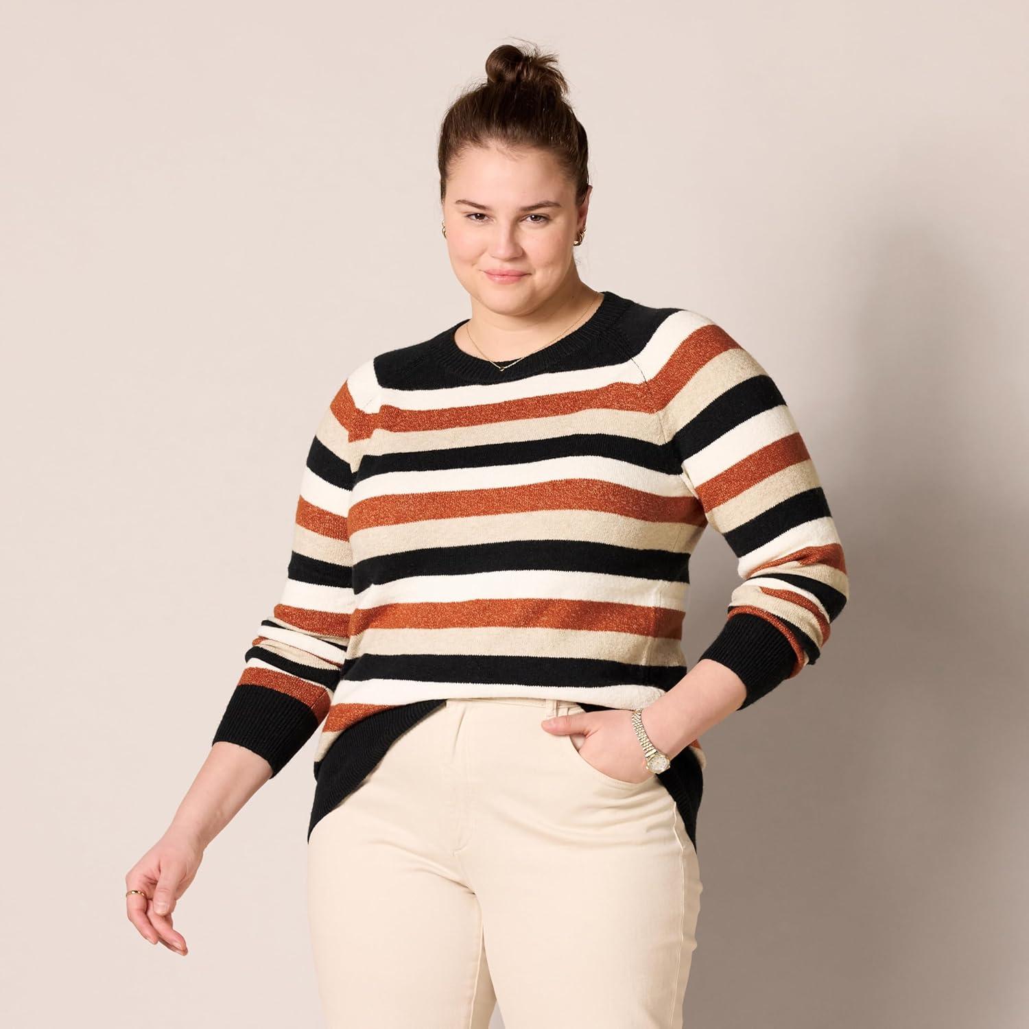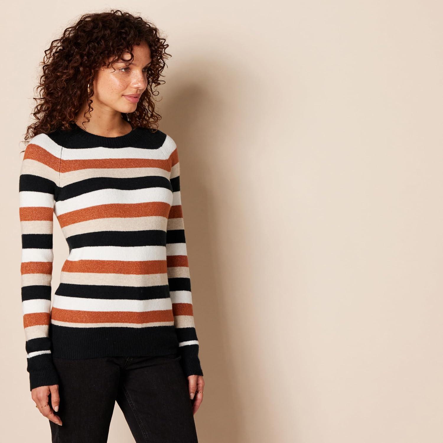 Amazon Essentials Women’s Regular-Fit Soft Touch Long-Sleeve Crewneck Sweater(Black Brown Rugby Stripe)