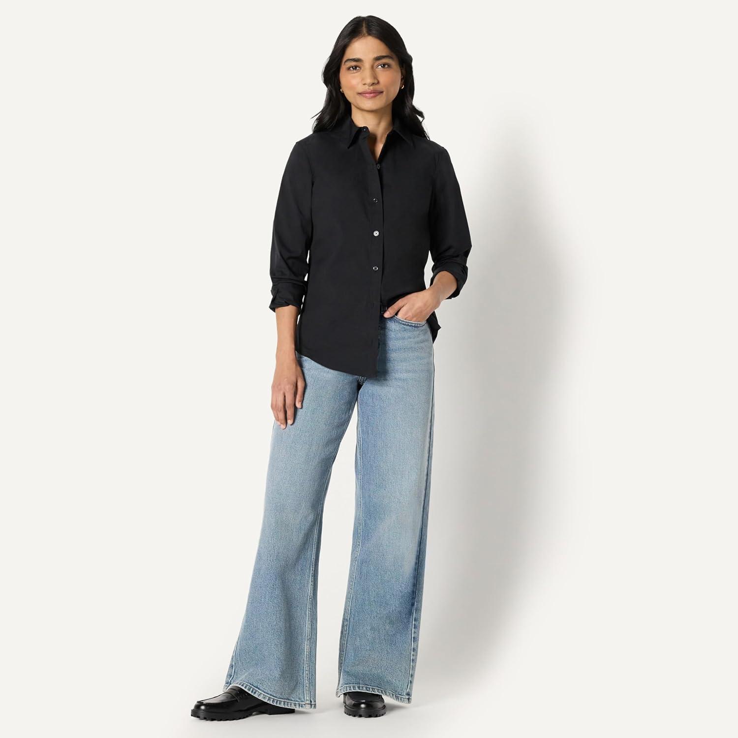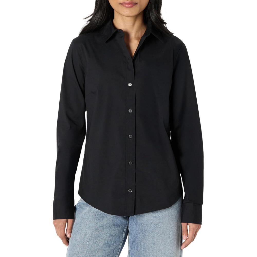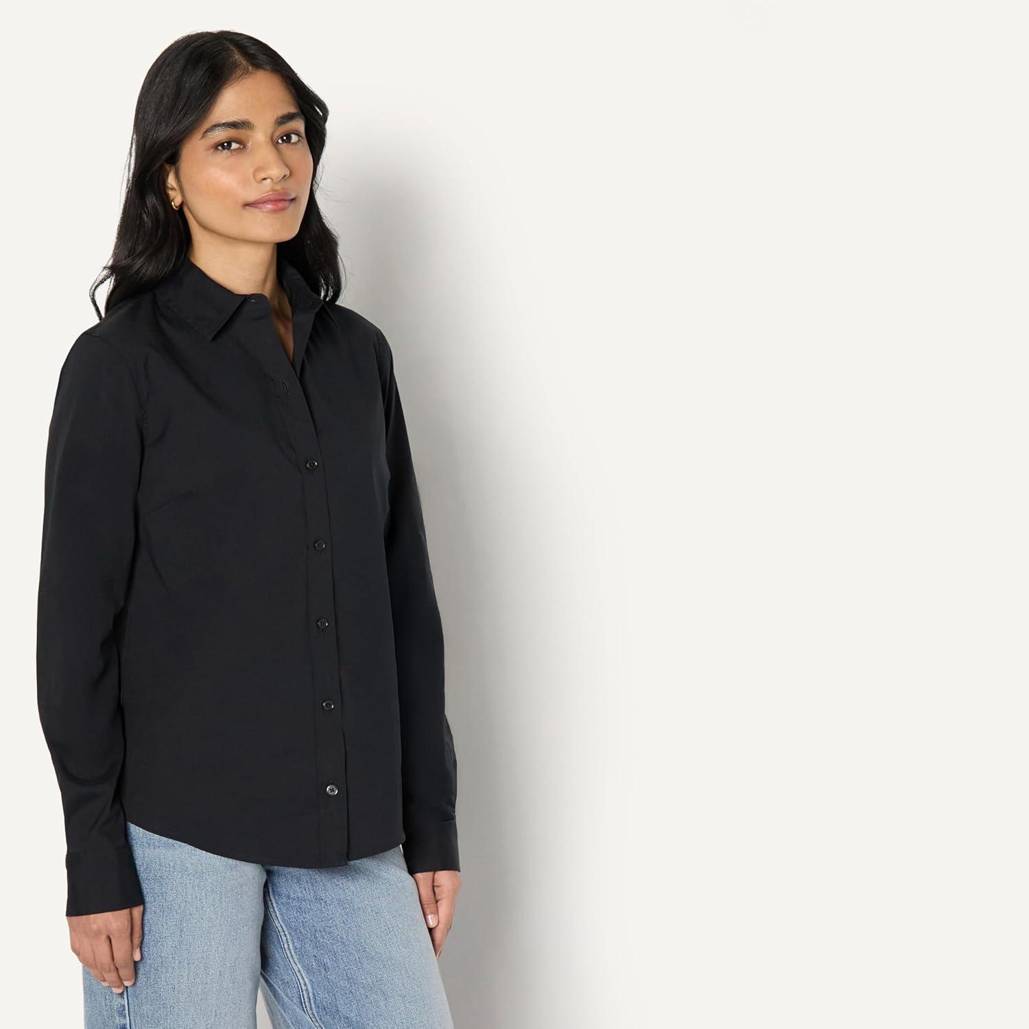 Amazon Essentials Womens Regular-Fit Stretch Poplin Button-Up Dress Shirt(Black)