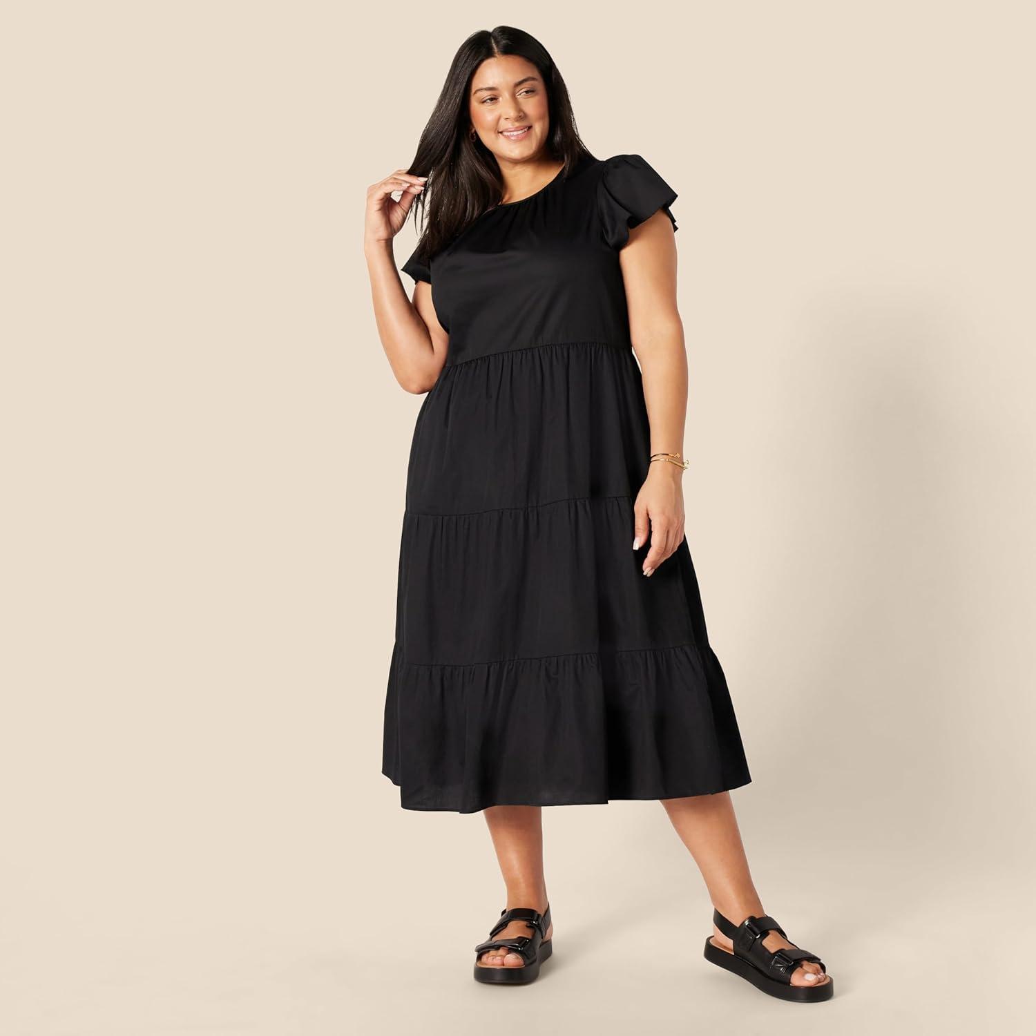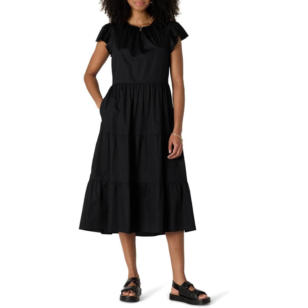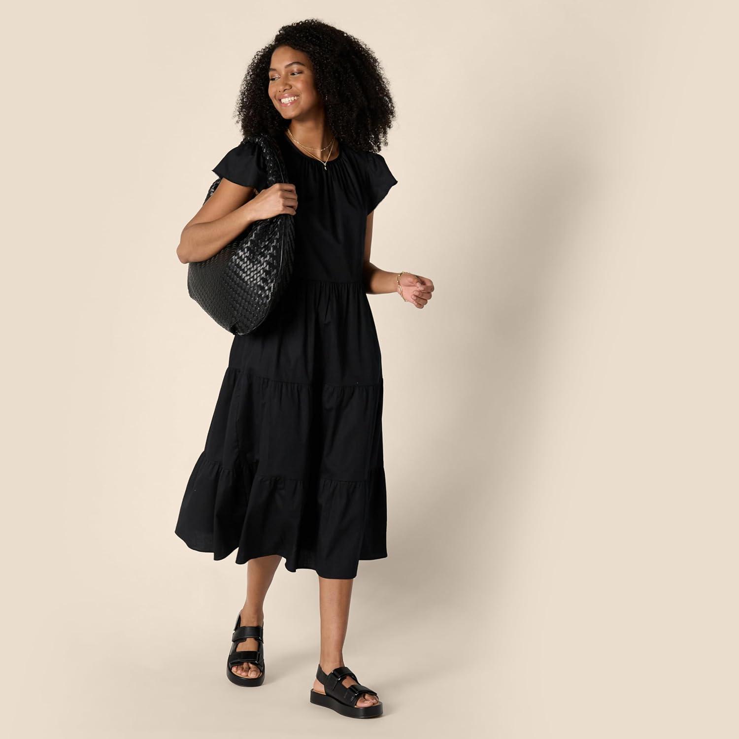 Amazon Essentials Women’s Relaxed-Fit Cotton Sateen Crewneck Tiered Midi Dress(Black)