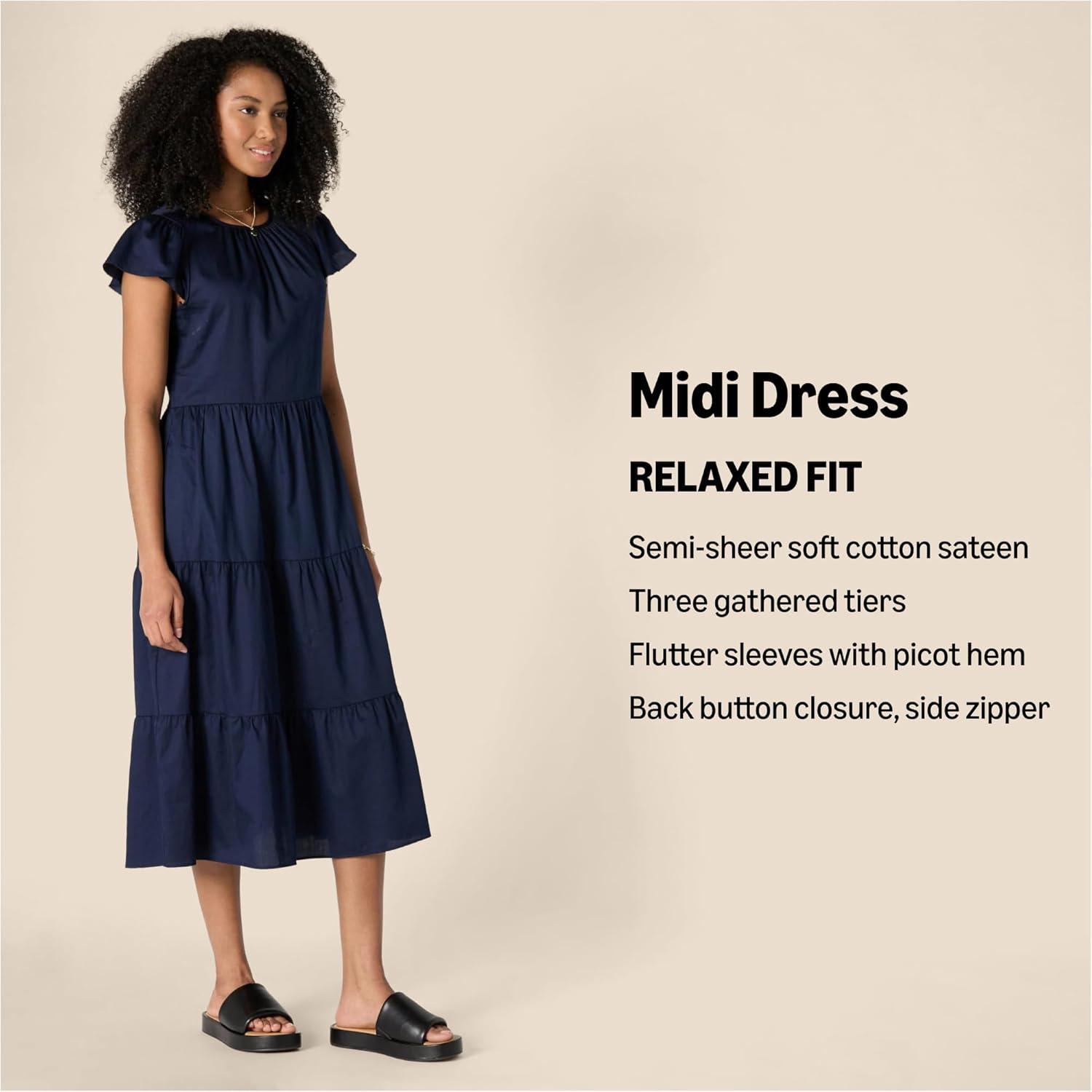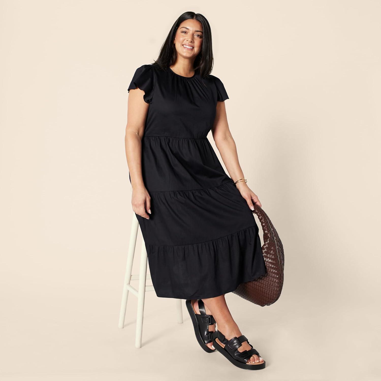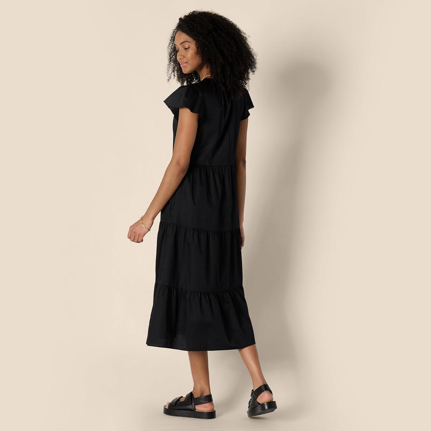 Amazon Essentials Women’s Relaxed-Fit Cotton Sateen Crewneck Tiered Midi Dress(Black)
