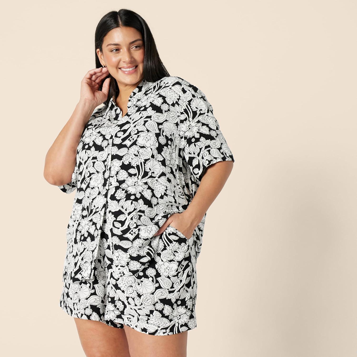 imageAmazon Essentials Womens RelaxedFit Fluid Twill ButtonDown Shirt Short Sold SeparatelyBlack Ivory Folk Floral