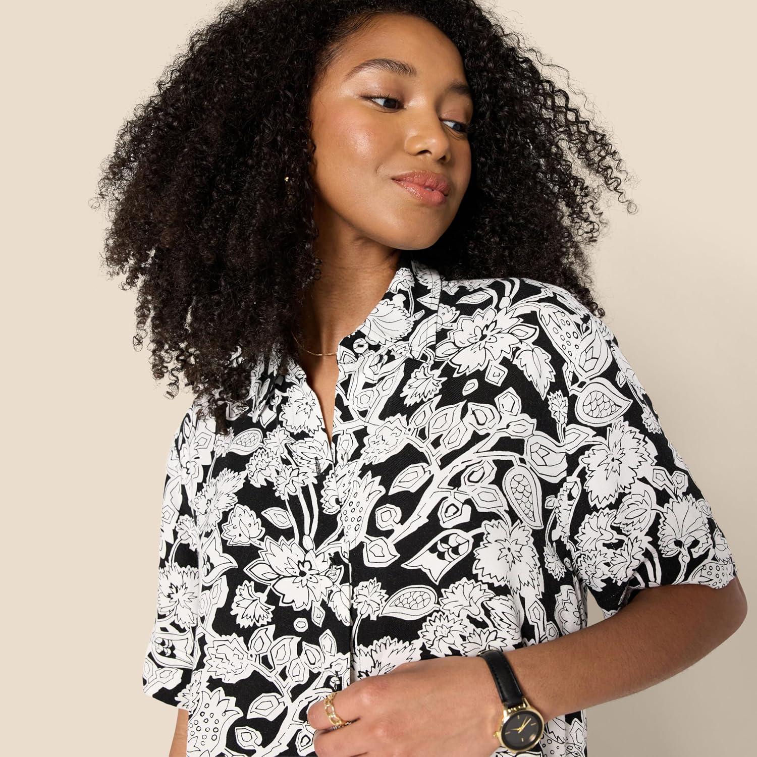 Amazon Essentials Women’s Relaxed-Fit Fluid Twill Button-Down Shirt (Short Sold Separately)(Black Ivory Folk Floral)