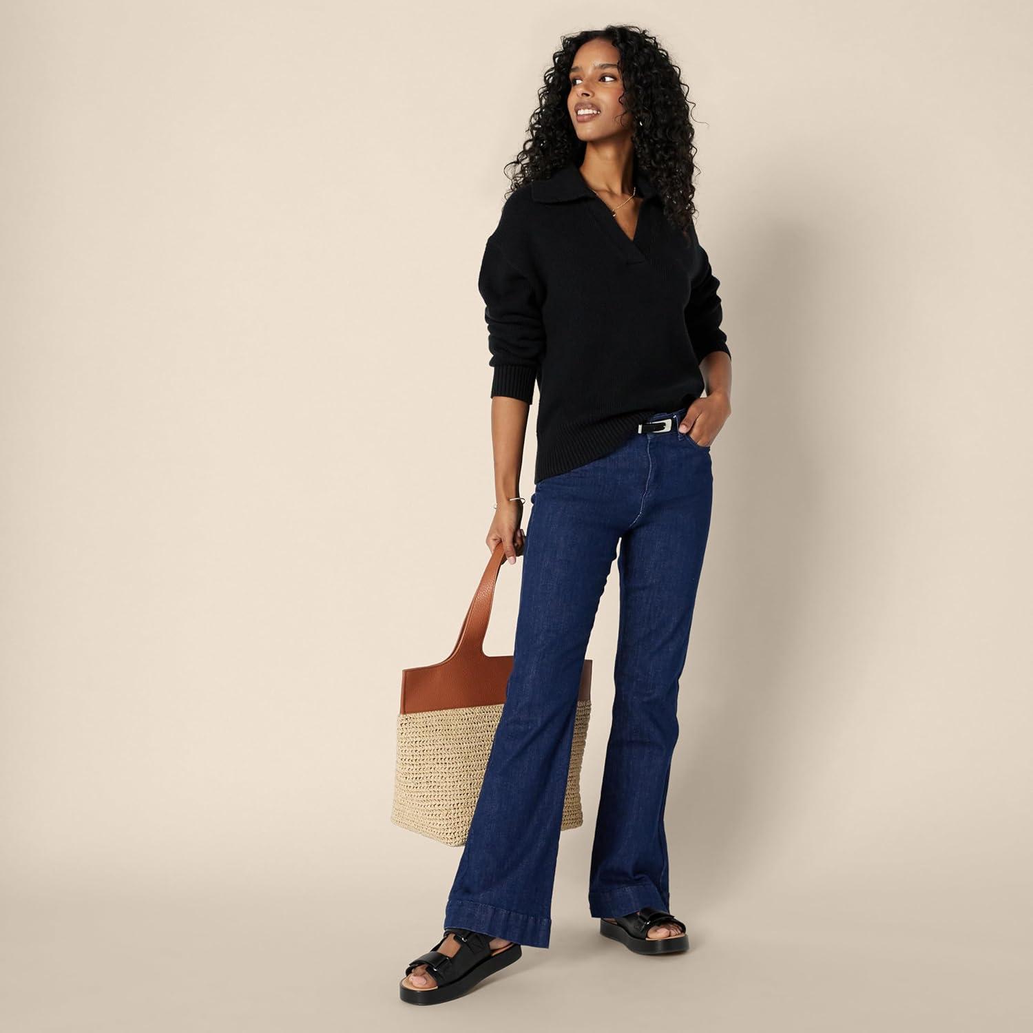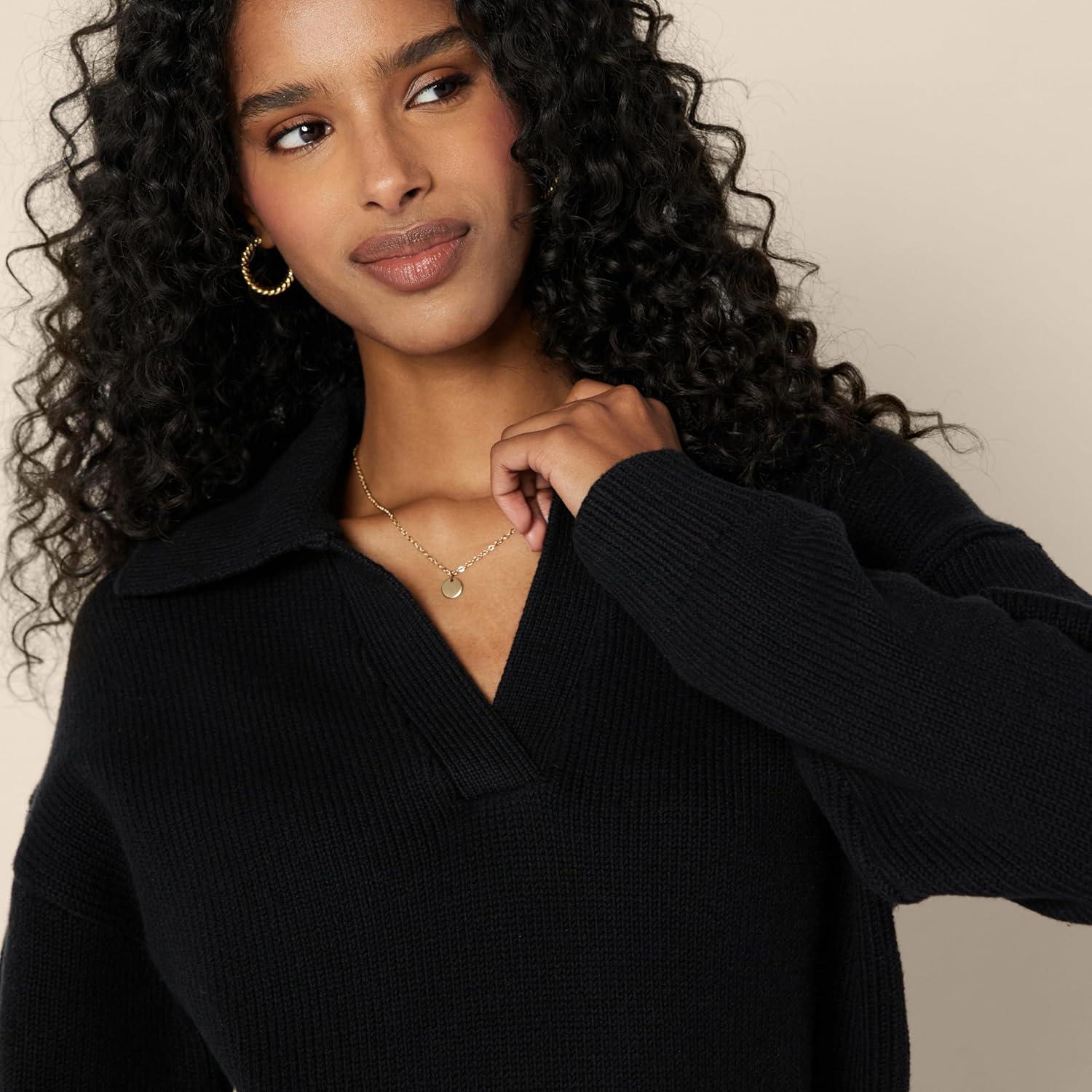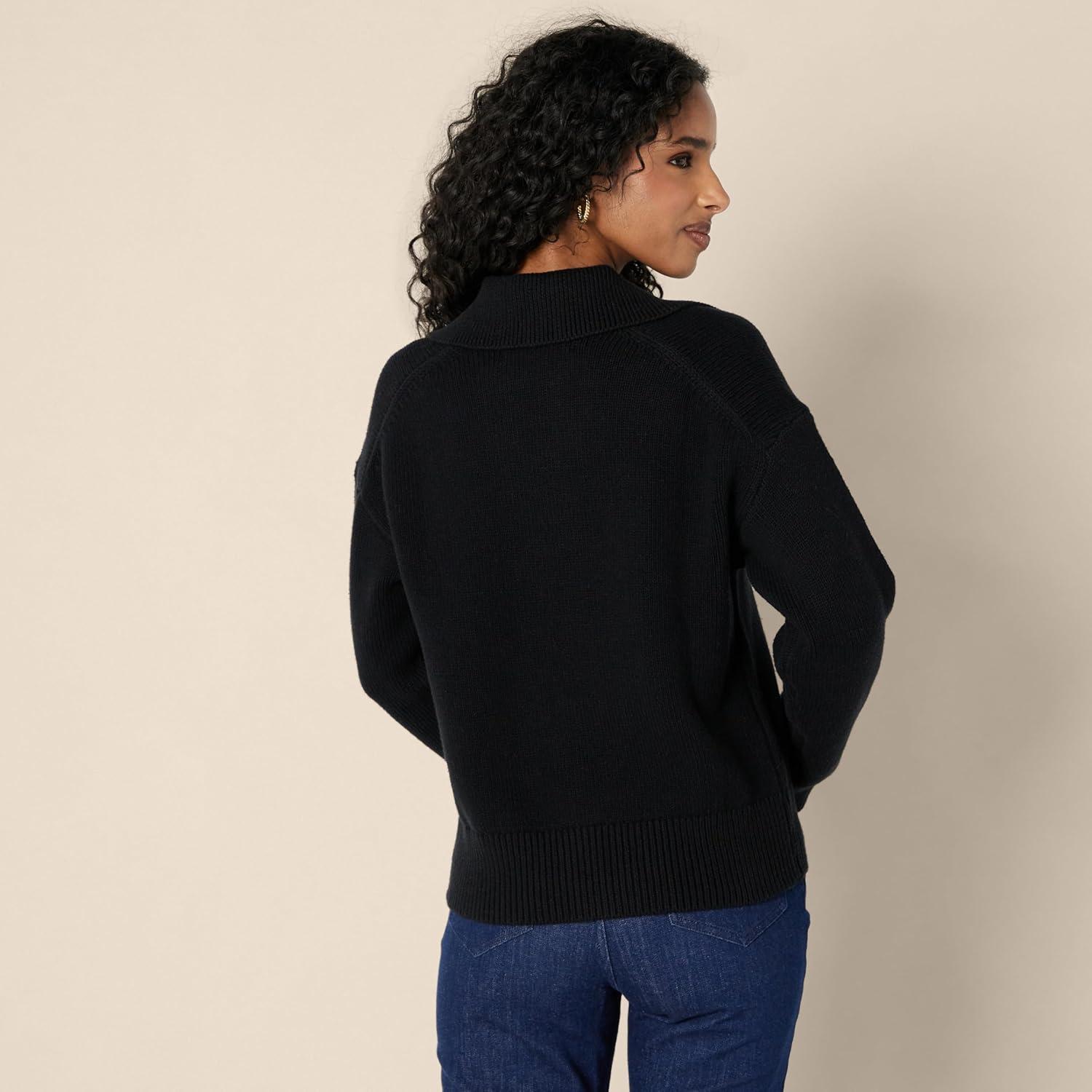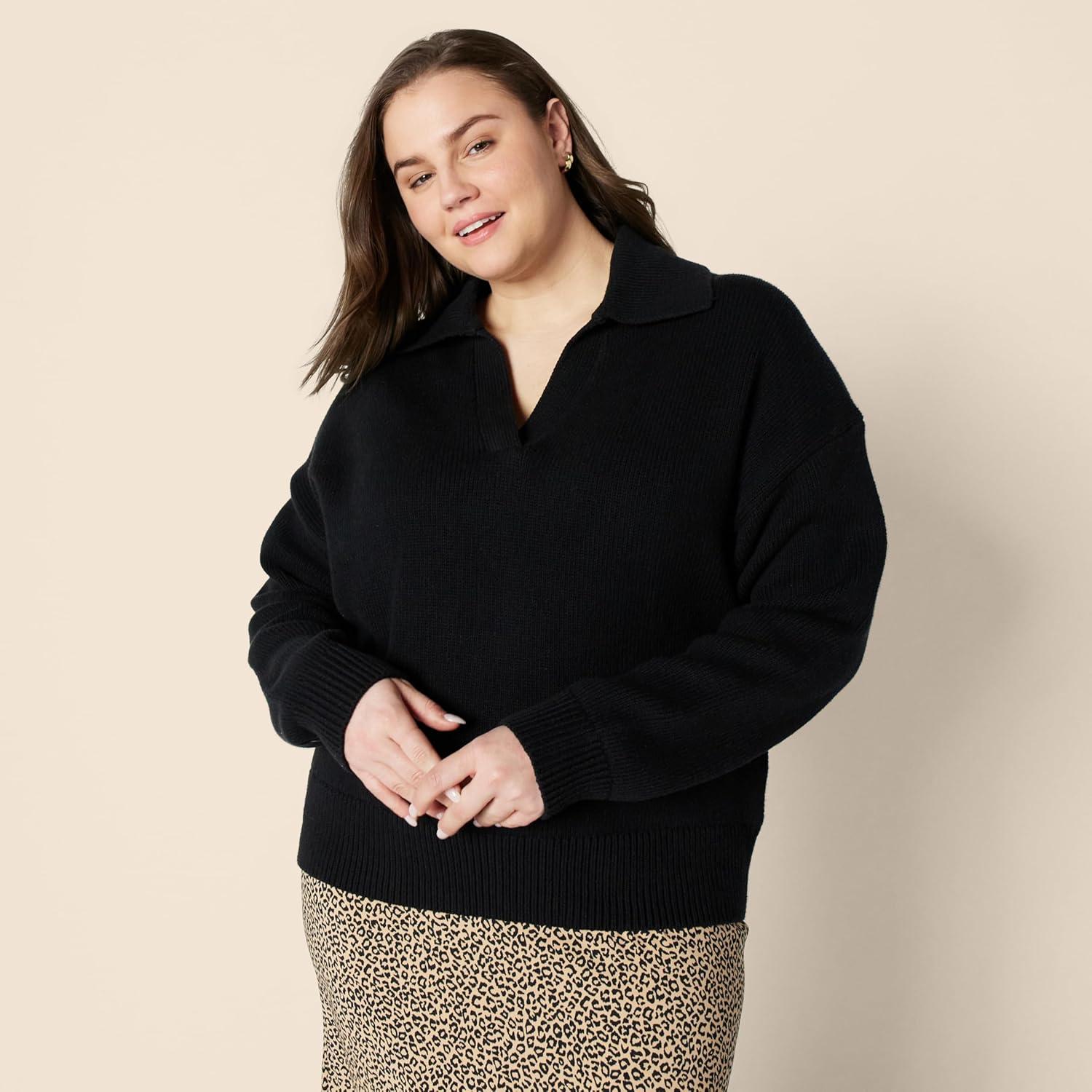 Amazon Essentials Women’s Relaxed-Fit Heavyweight Cotton Polo Pullover Sweater(Black)