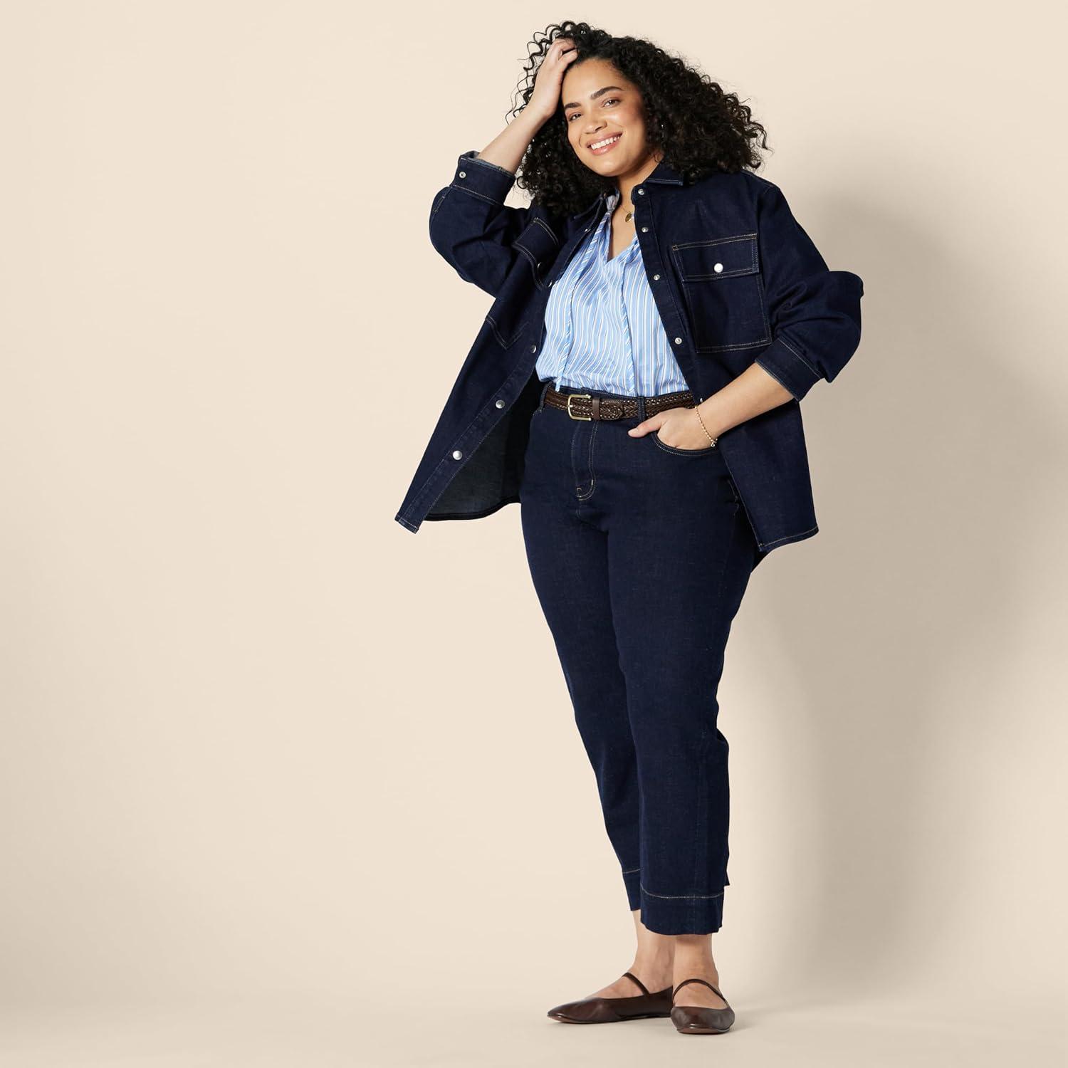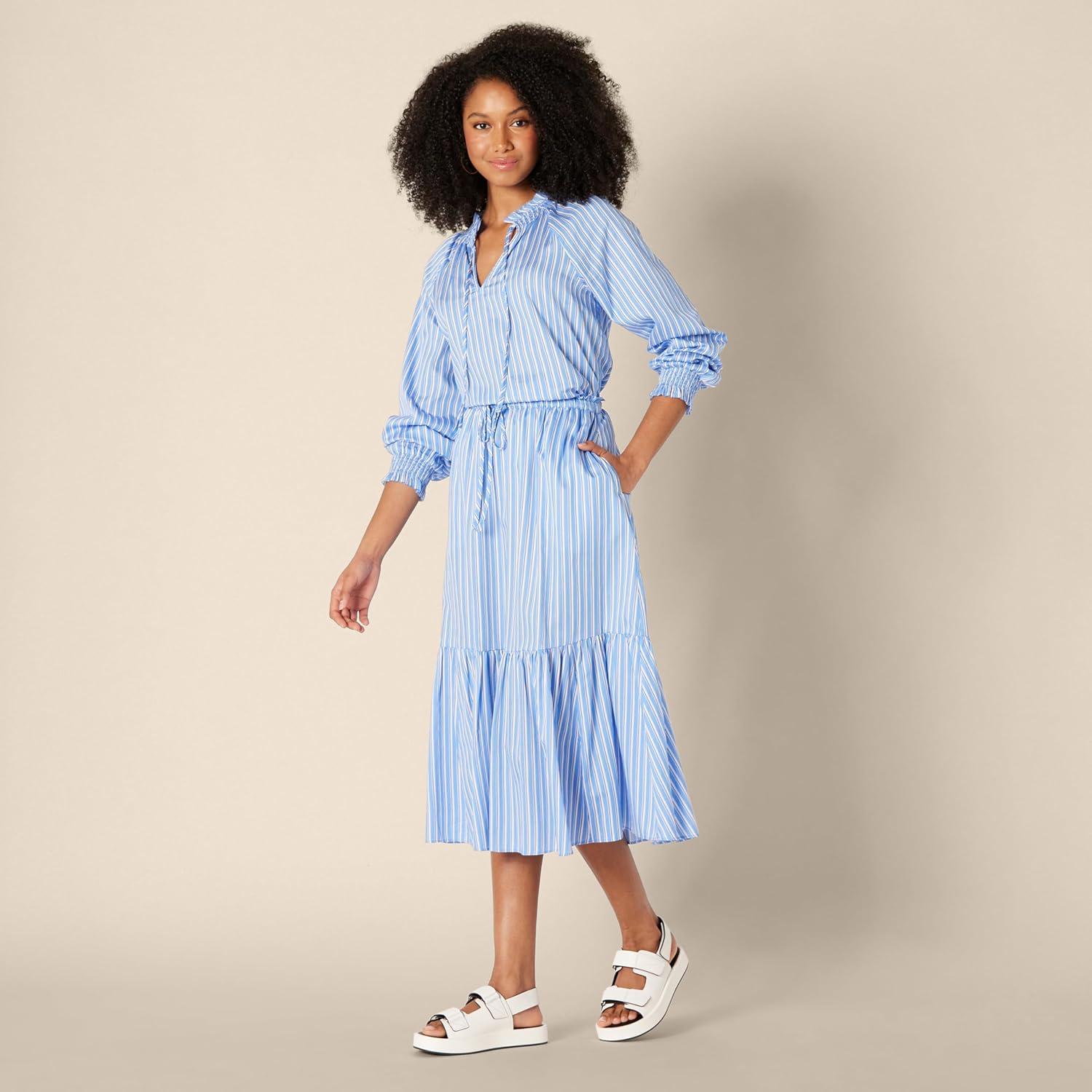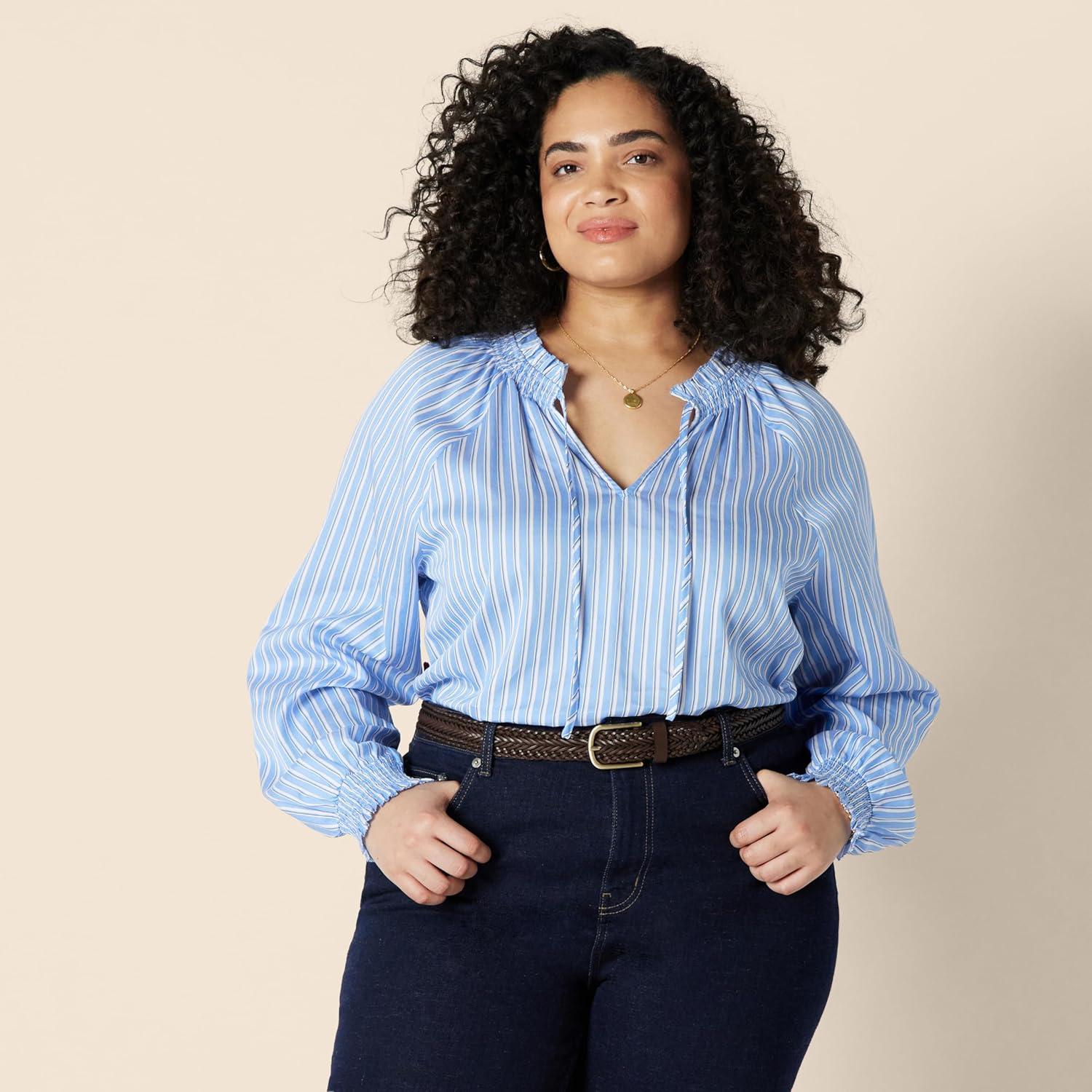 Get your hands on our exclusive Amazon Essentials Women’s Relaxed-Fit Ruffle-Neck Cotton Sateen Long-Sleeve Blouse (Skirt Sold Seperately)(Blue White Stripe) collection, now at a discounted price.